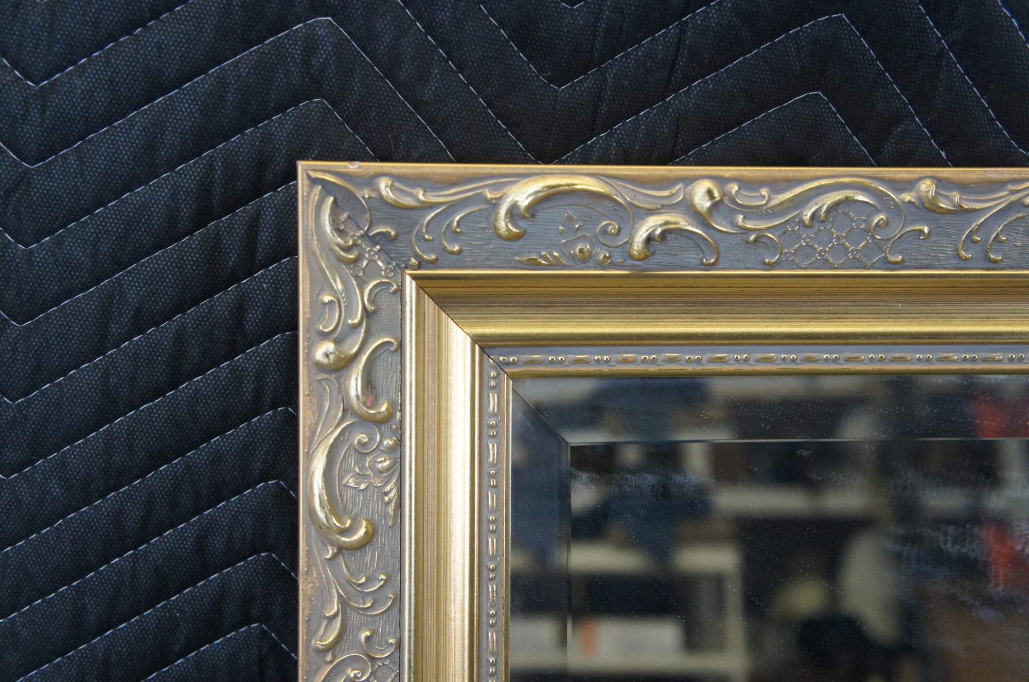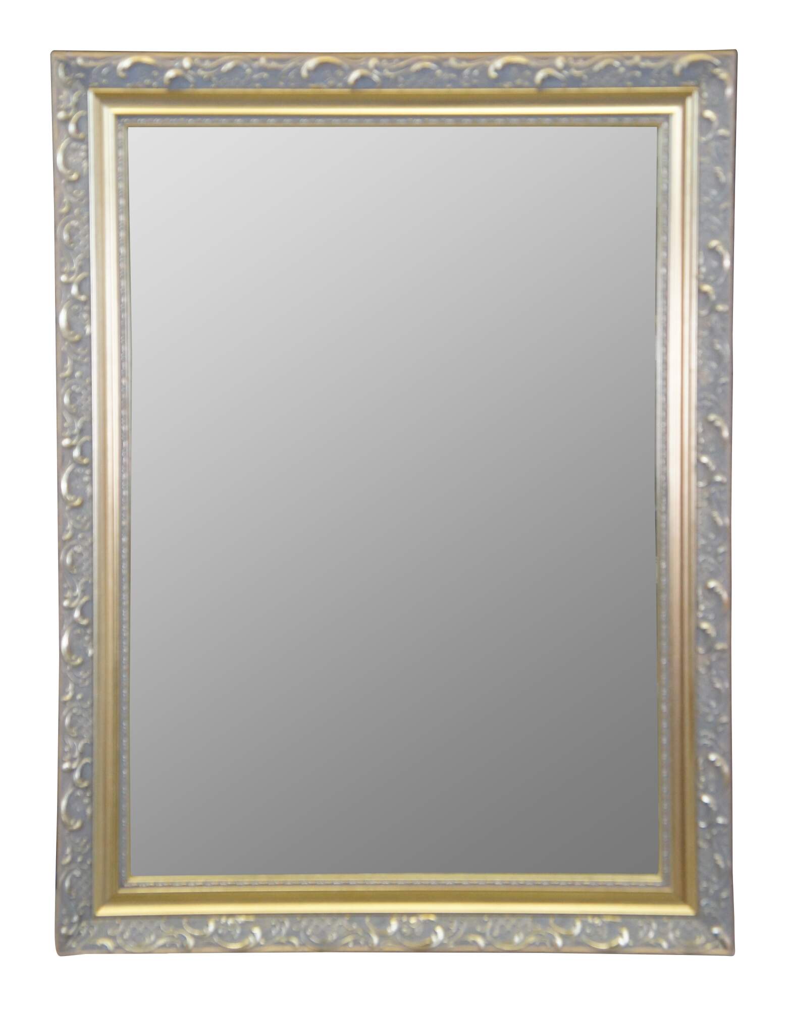 Carolina Mirror Company rectangular mirror with bevelled glass. Features a gold frame with "s" and "c" scrolled detail. Can be hung vertical or rectangular. Great for artwork as well.
