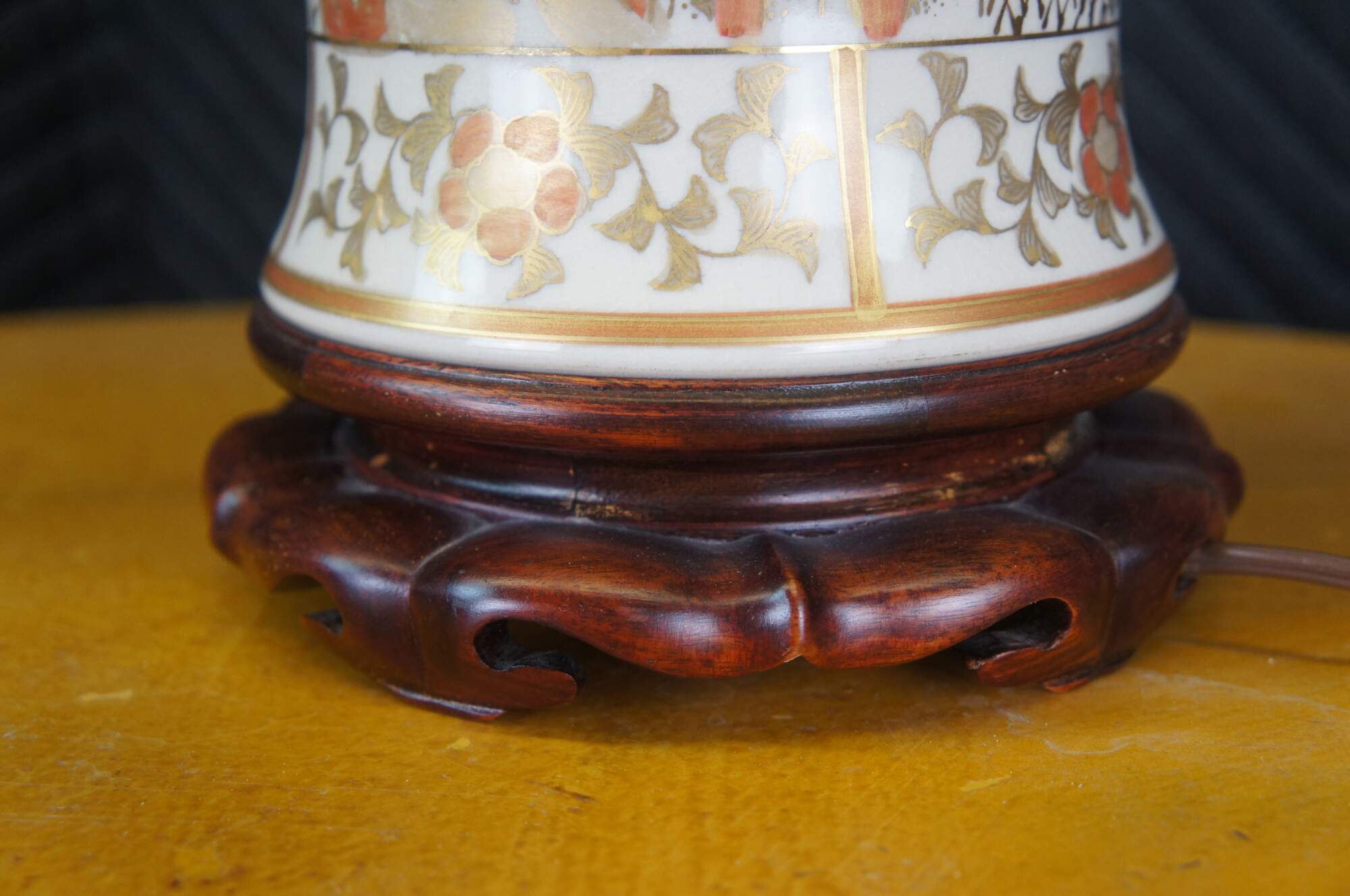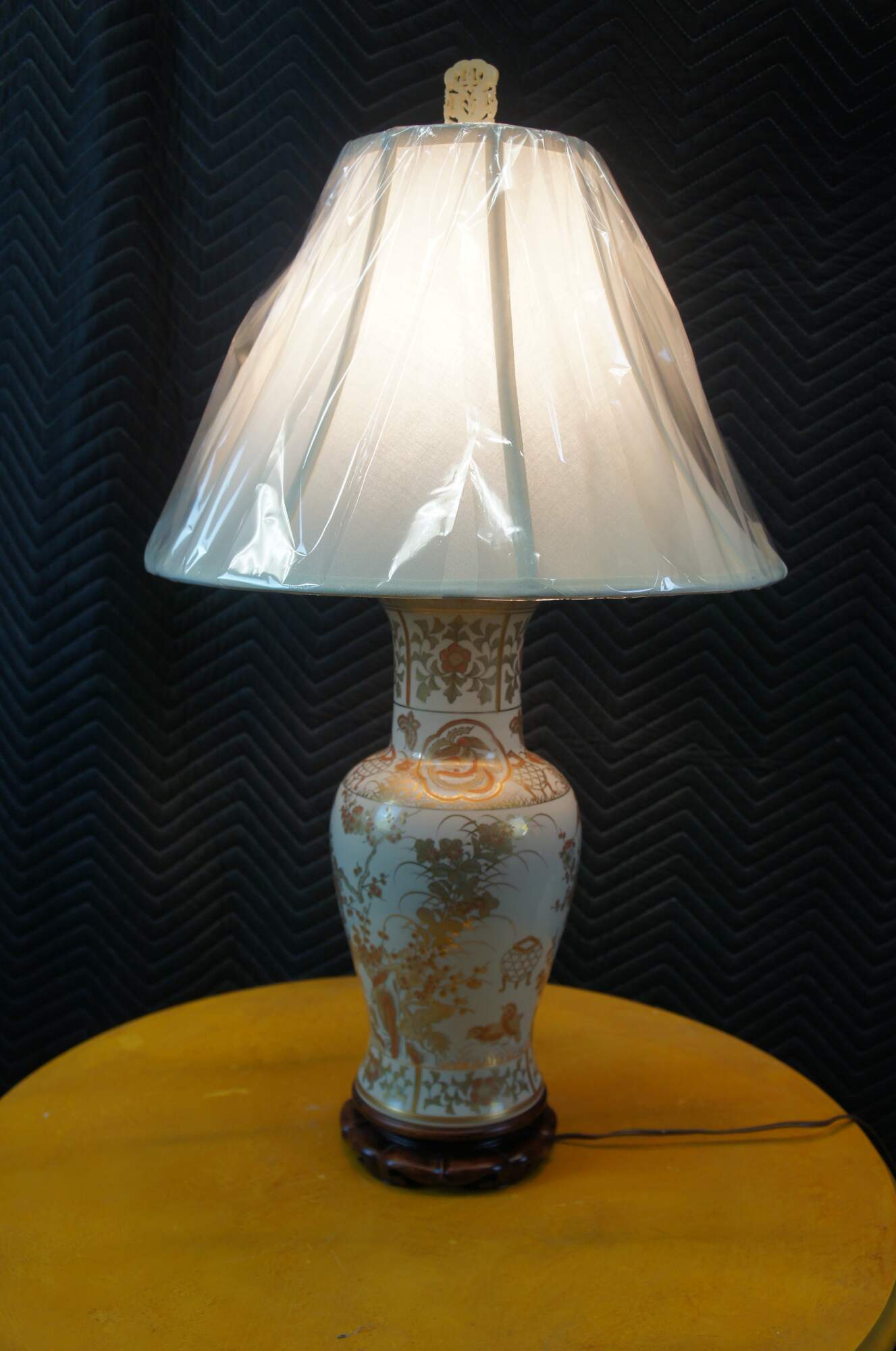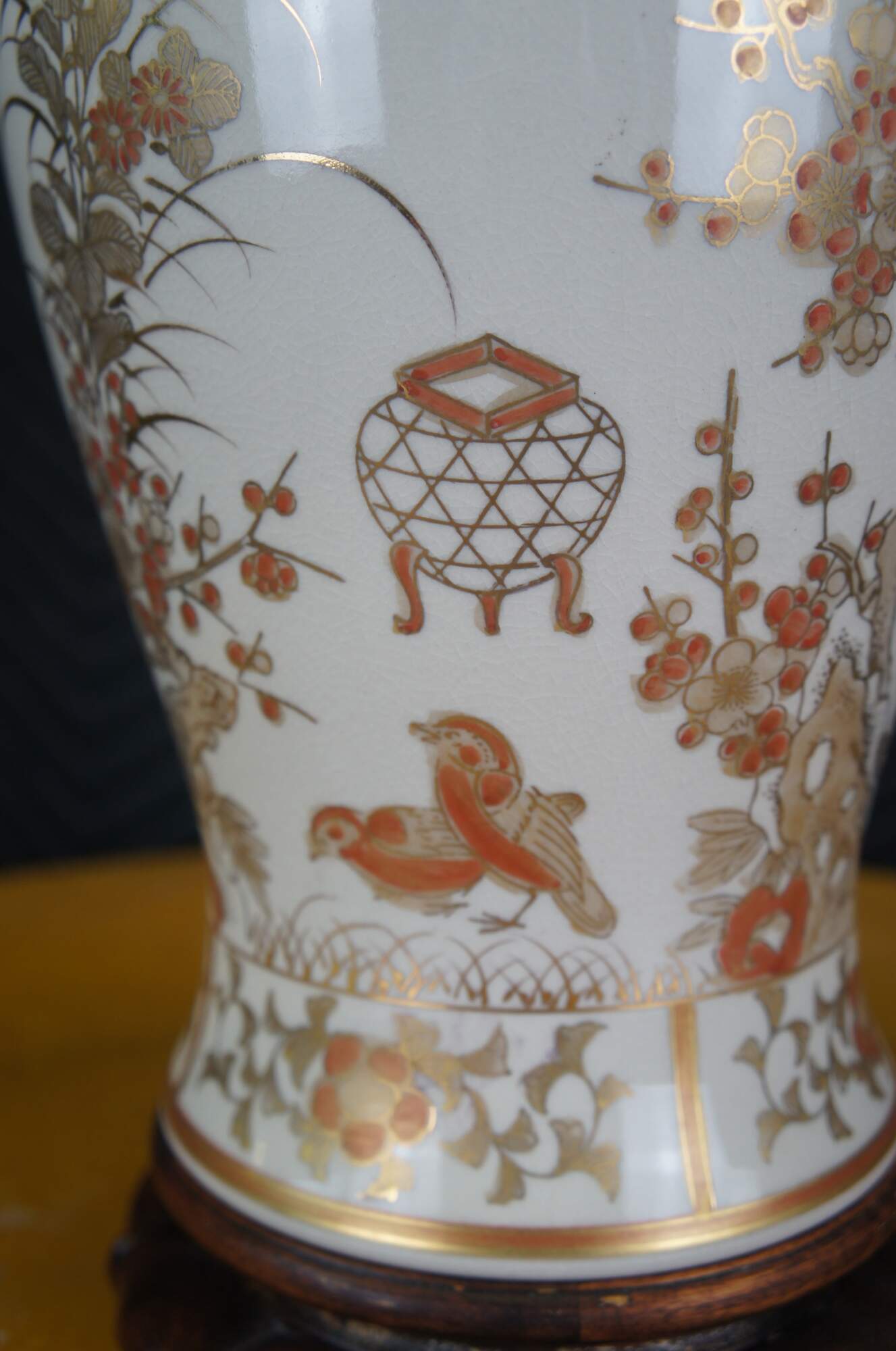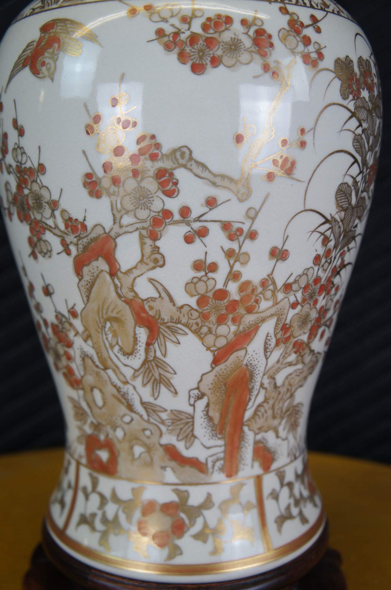 A Chinese porcelain table urn shaped table lamp. White with gold and orange colors. Features cherry blossoms and birds. The lamp is mounted to a wooden base. Features a jade finial and new shade.