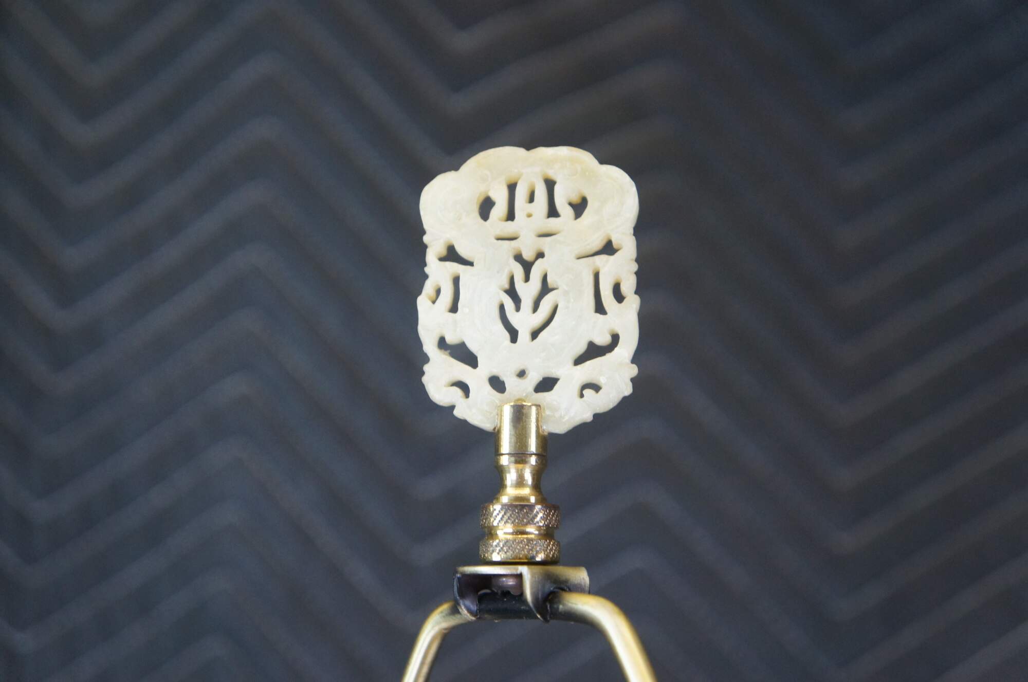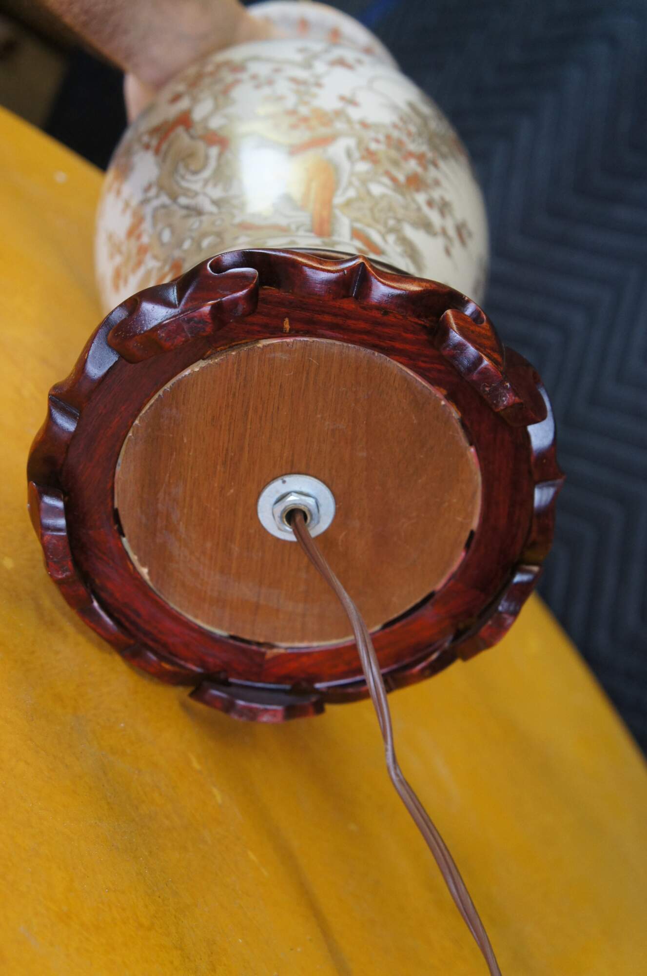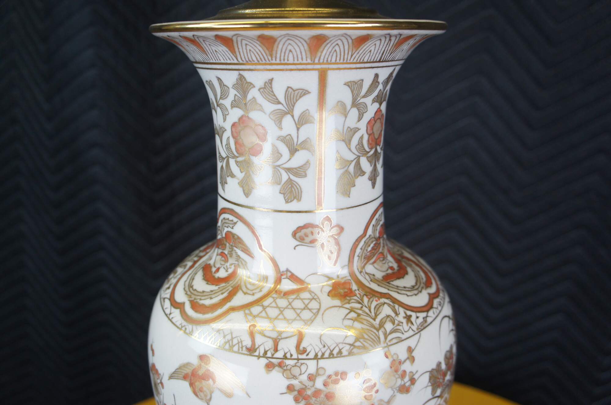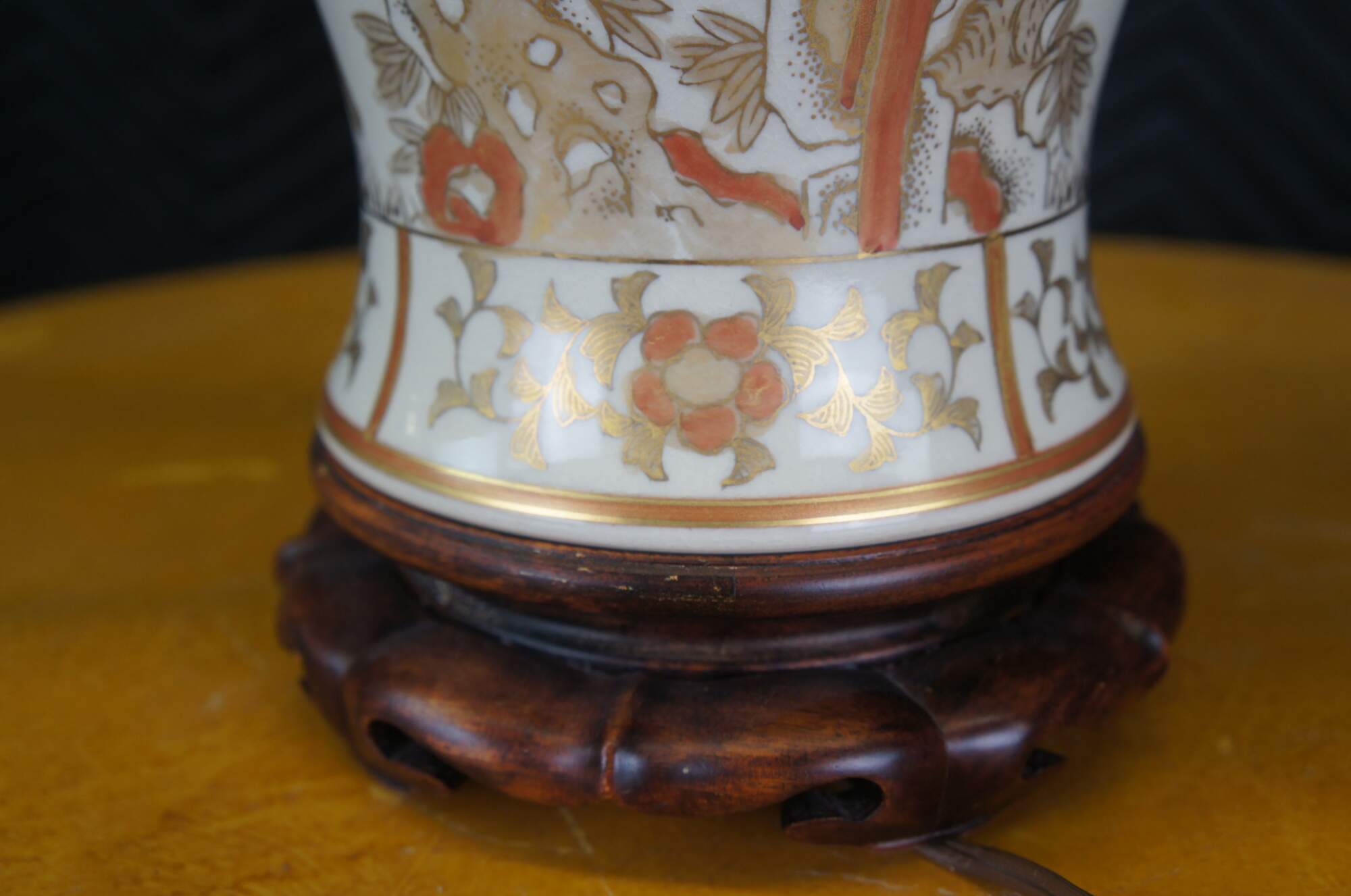 A Chinese porcelain table urn shaped table lamp. White with gold and orange colors. Features cherry blossoms and birds. The lamp is mounted to a wooden base. Features a jade finial and new shade.