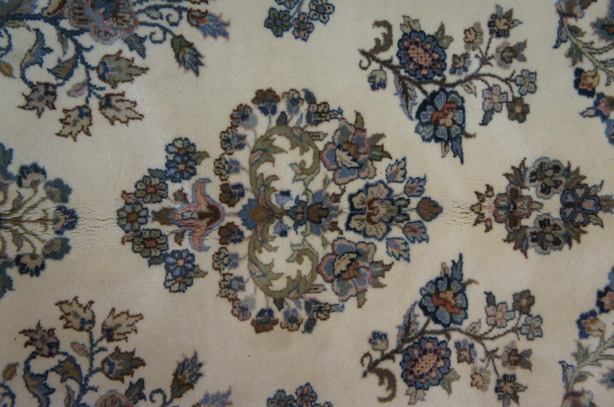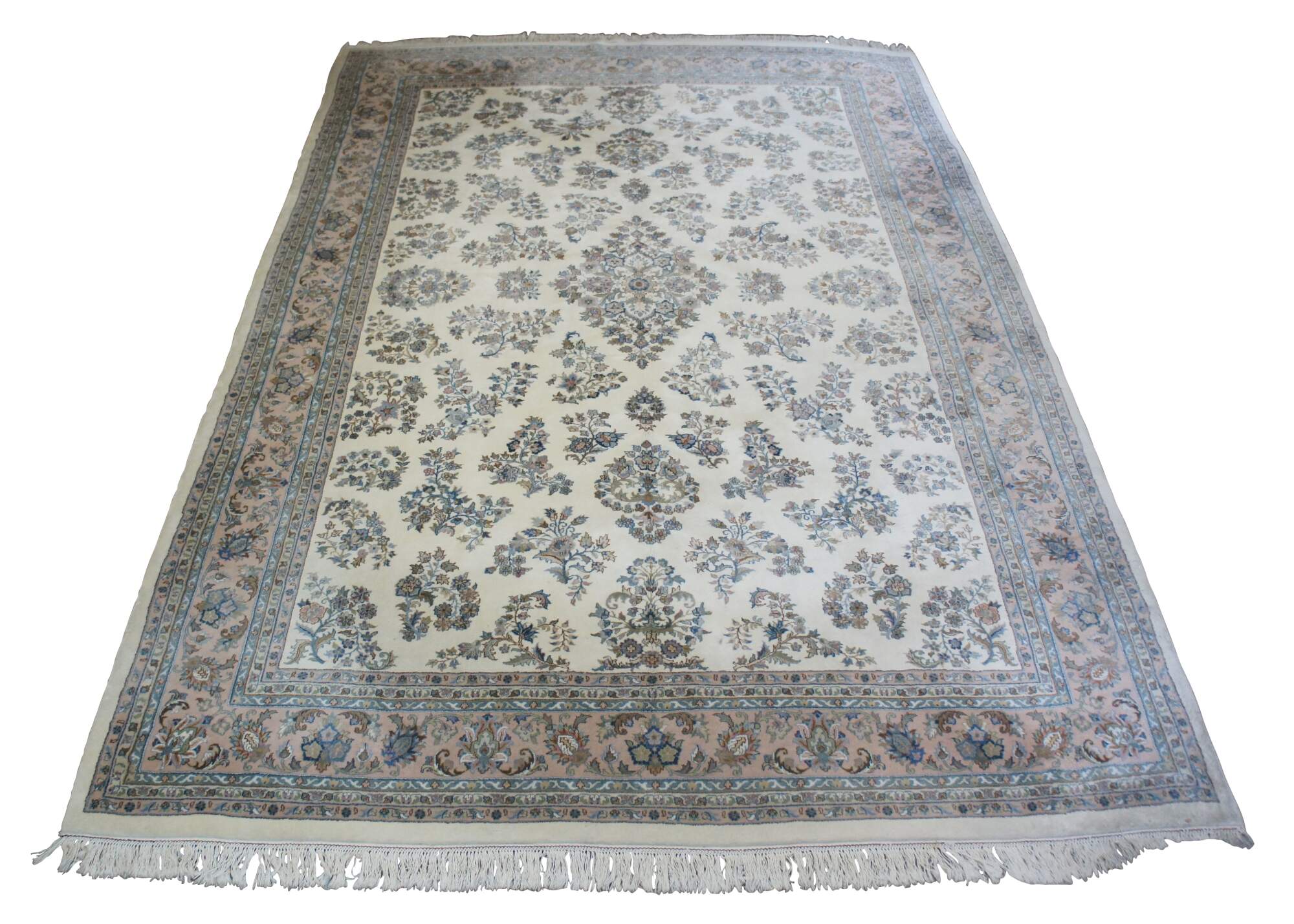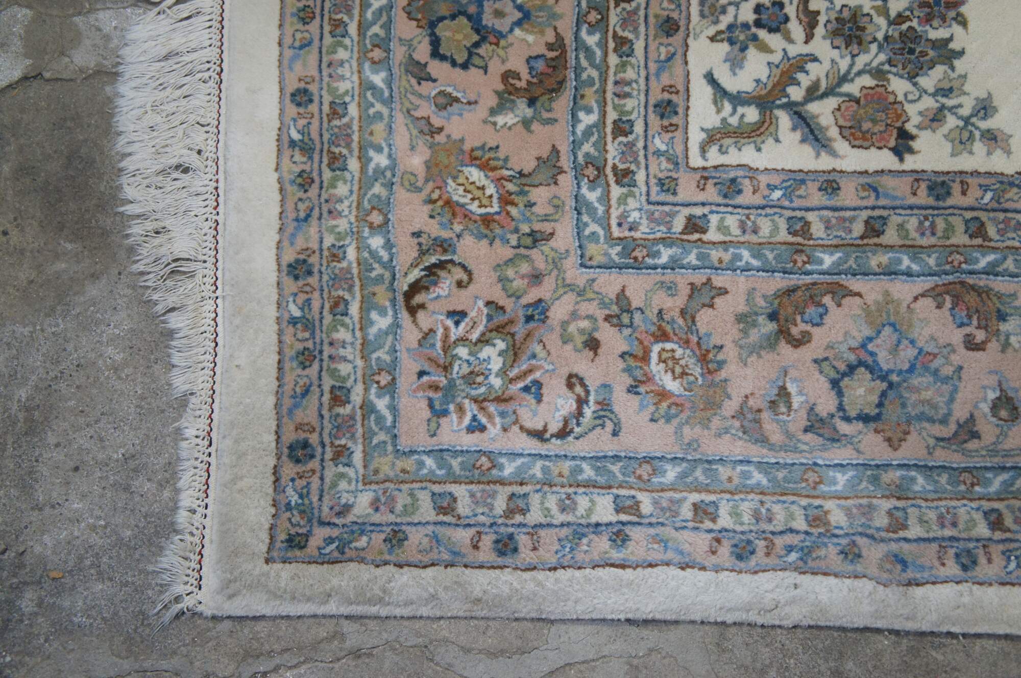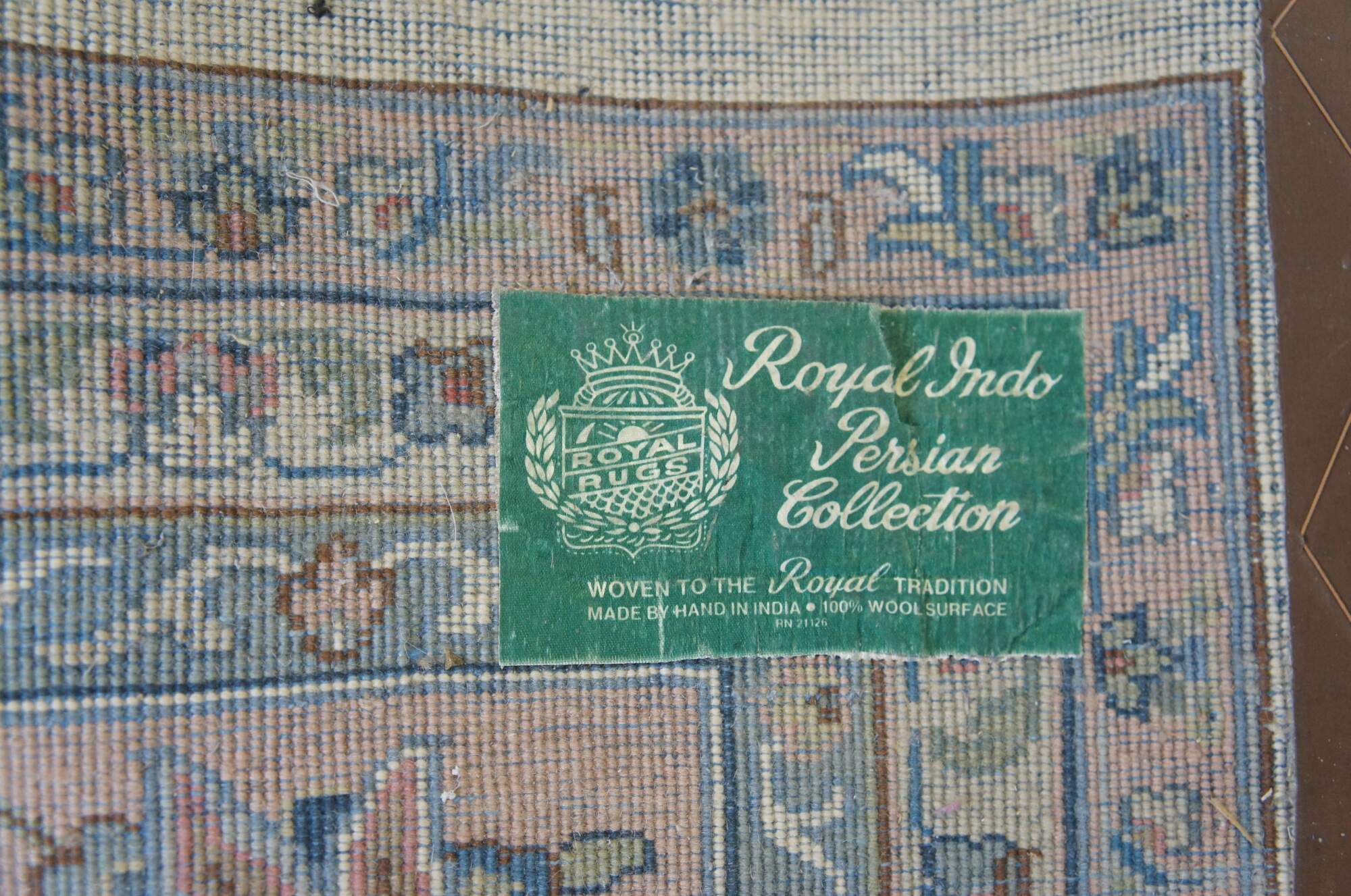Vintage Indo area rug by Royal Rugs, circa last quarter 20th century. Handmade from 100% wood. Features a floral all over pattern with beige/creme, peaches and blues. Royal rugs has been in business since the 1950s. The company was started by a first generation rug maker after the Chinese invasion of Nepal.
