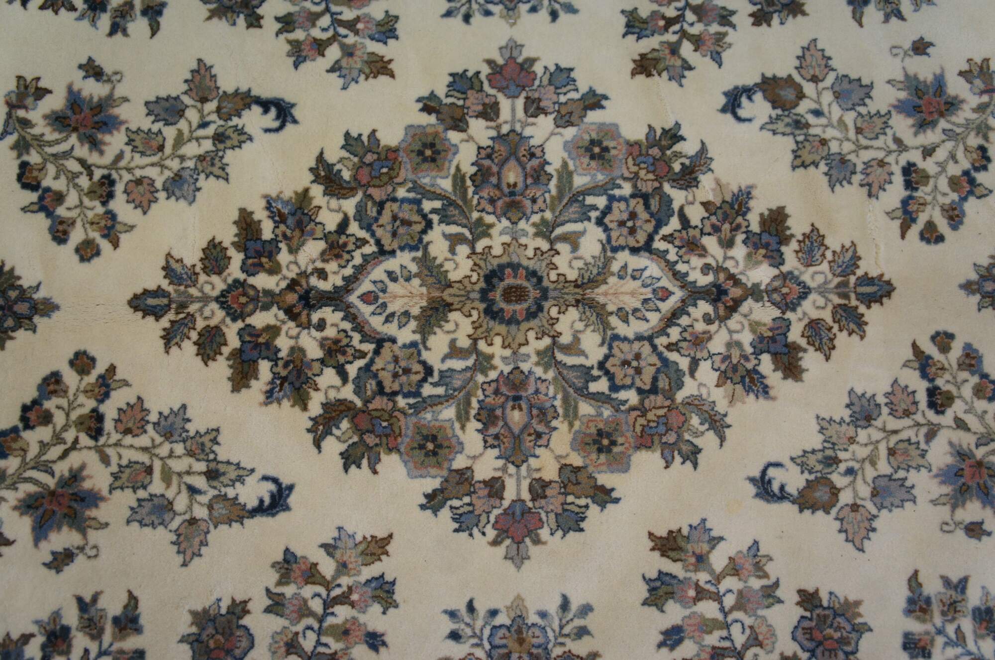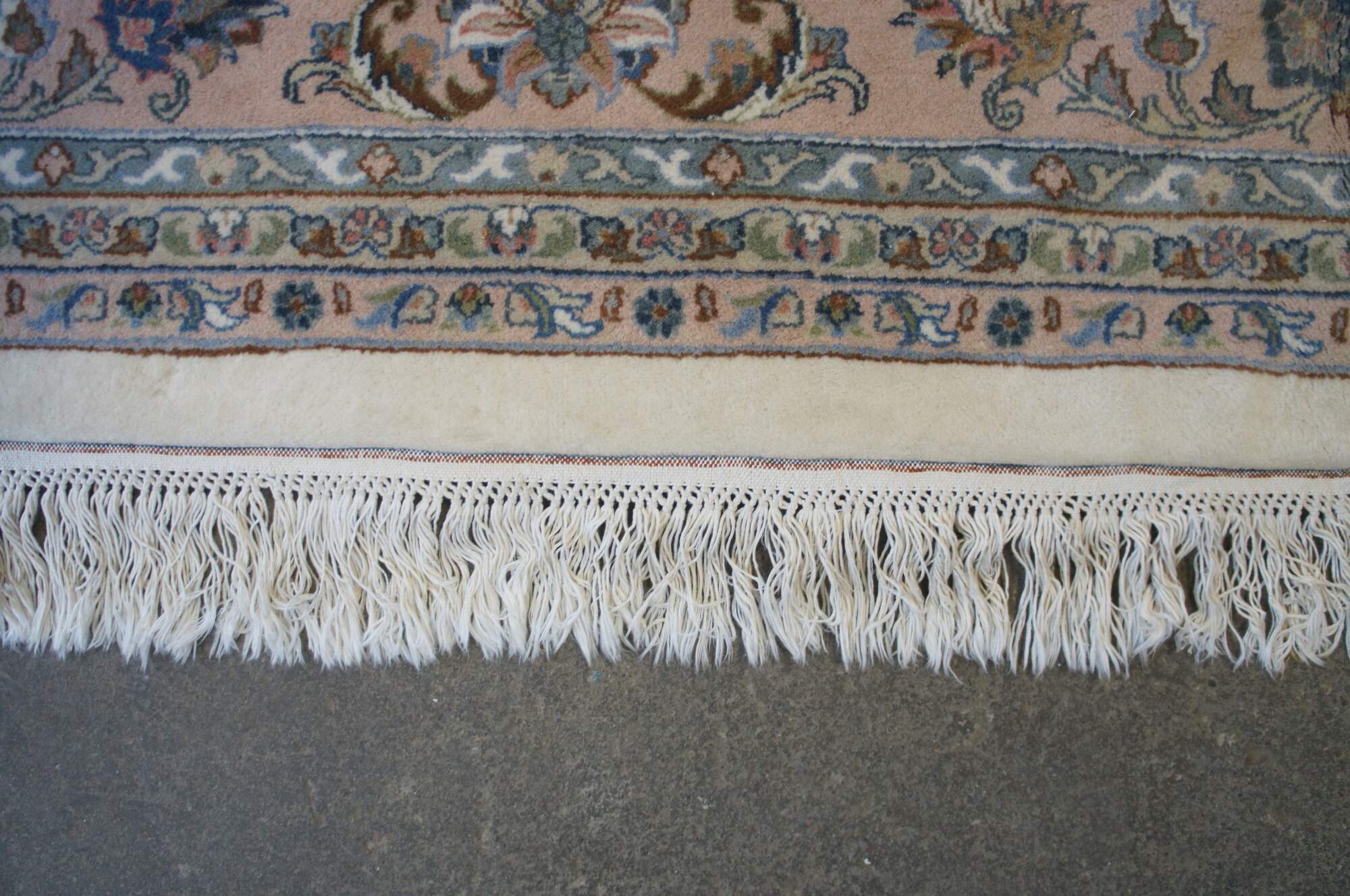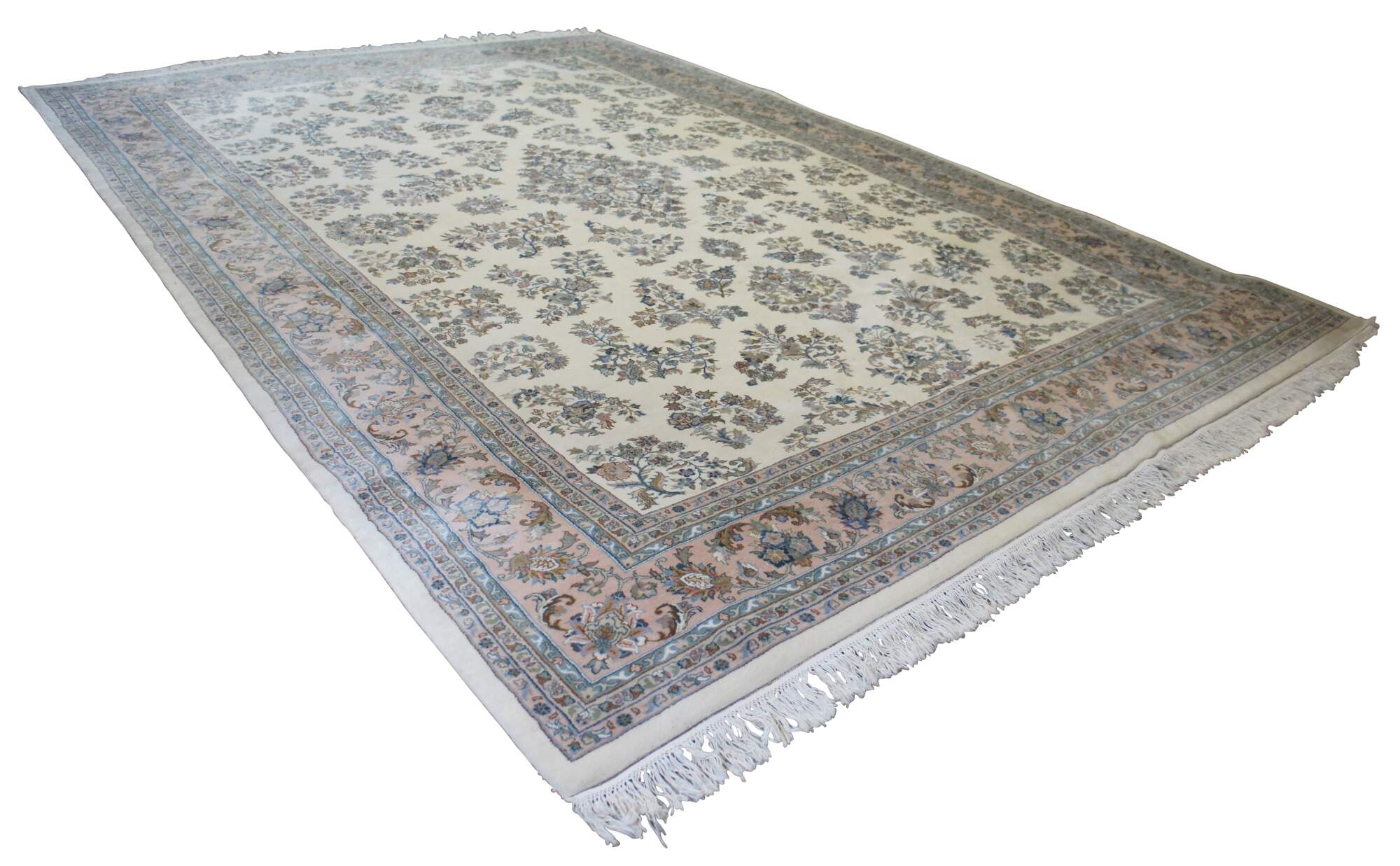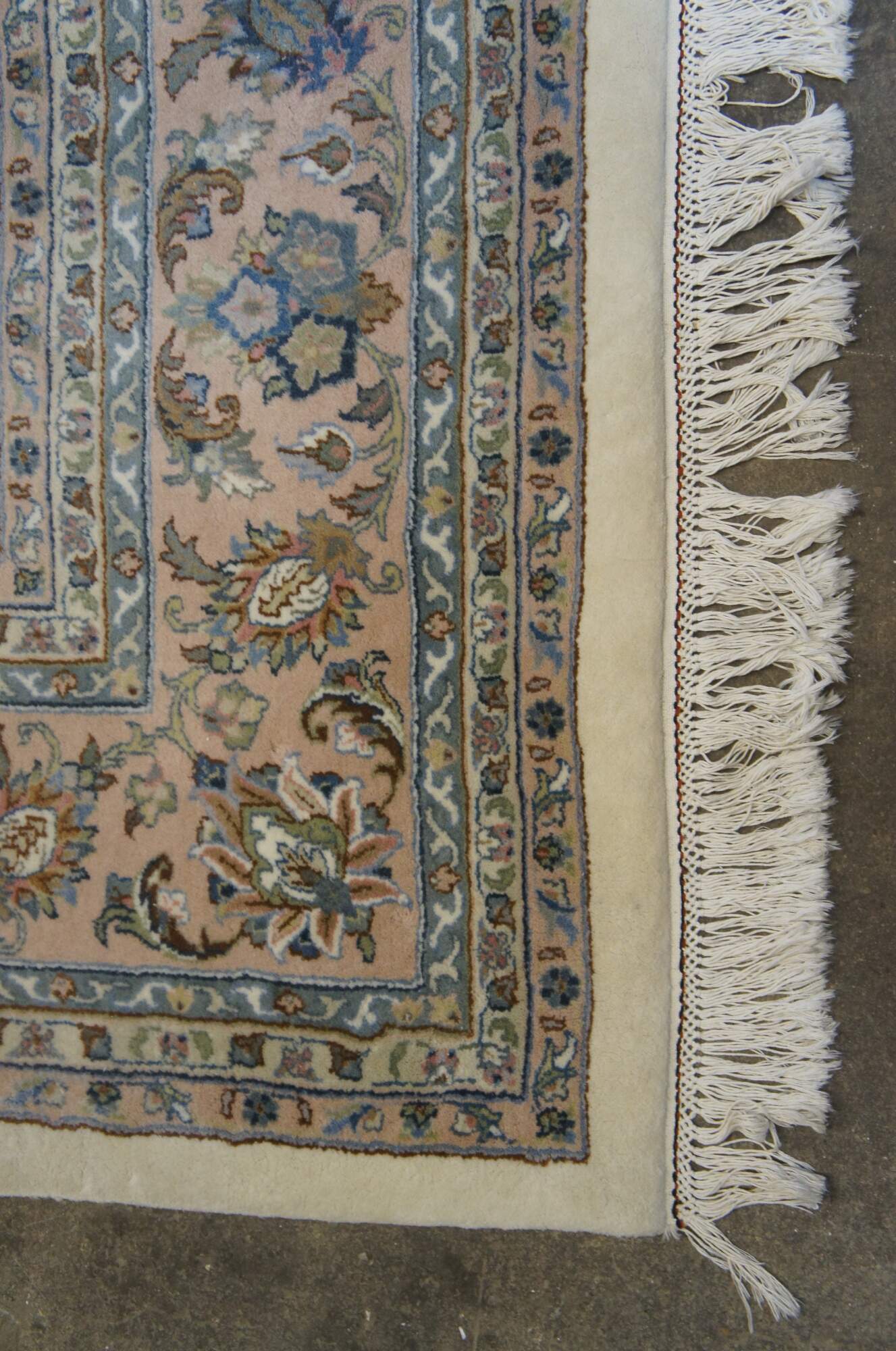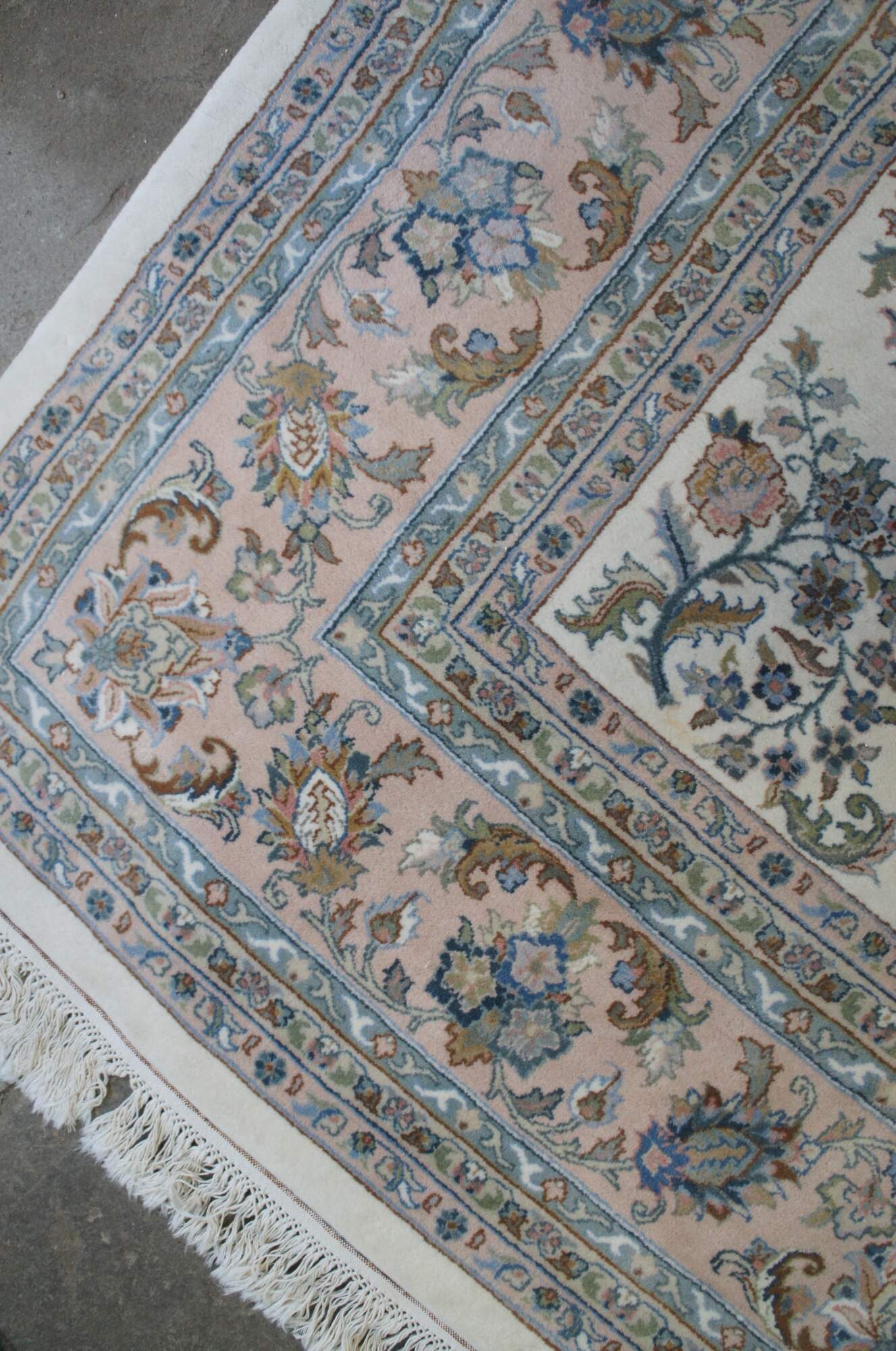 Vintage Indo area rug by Royal Rugs, circa last quarter 20th century. Handmade from 100% wood. Features a floral all over pattern with beige/creme, peaches and blues. Royal rugs has been in business since the 1950s. The company was started by a first generation rug maker after the Chinese invasion of Nepal.
