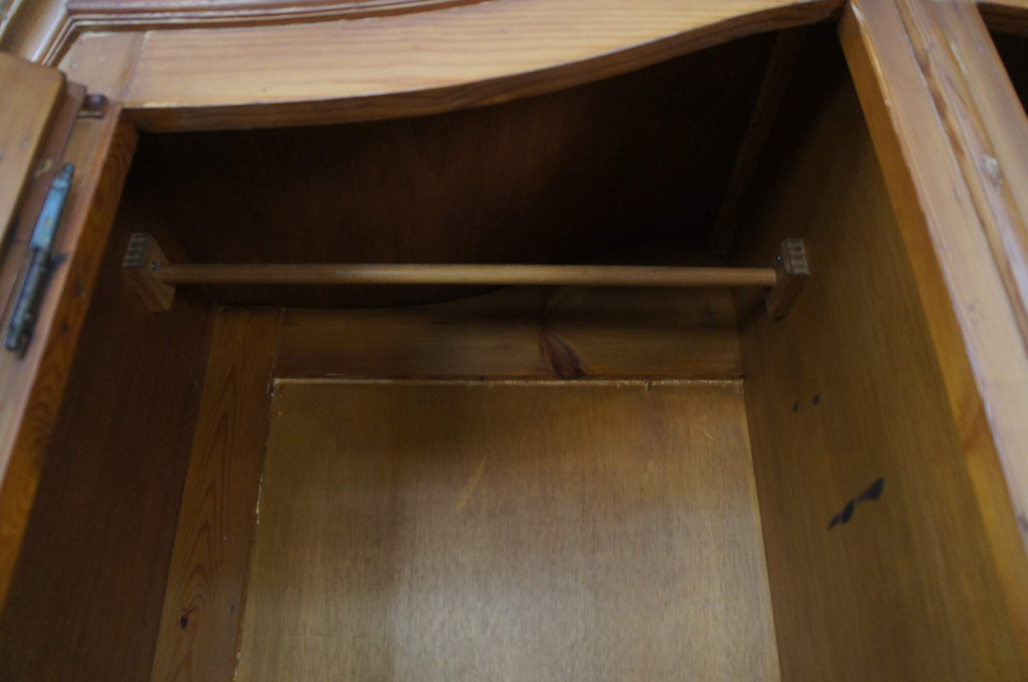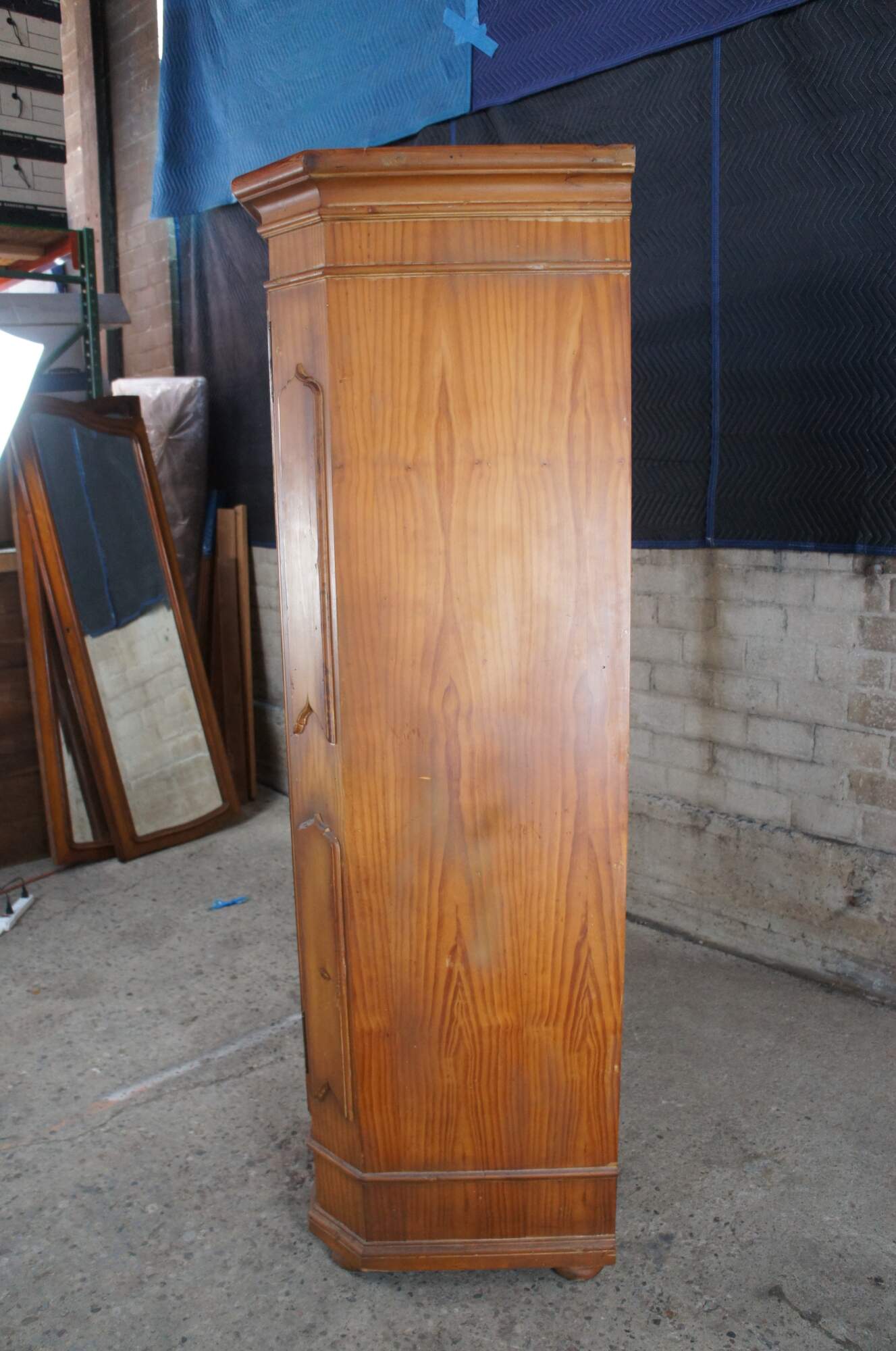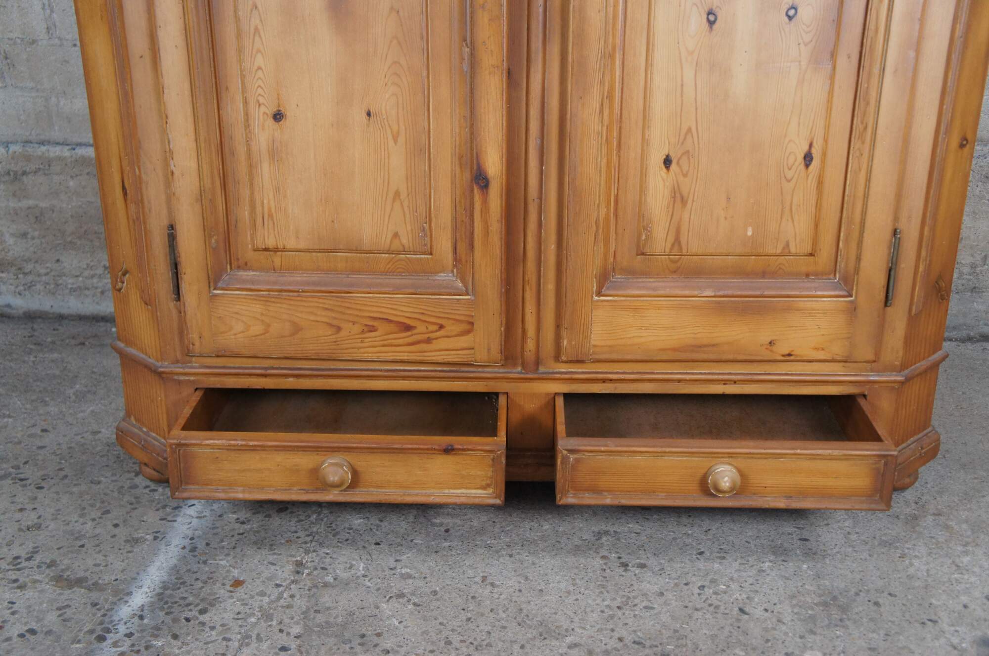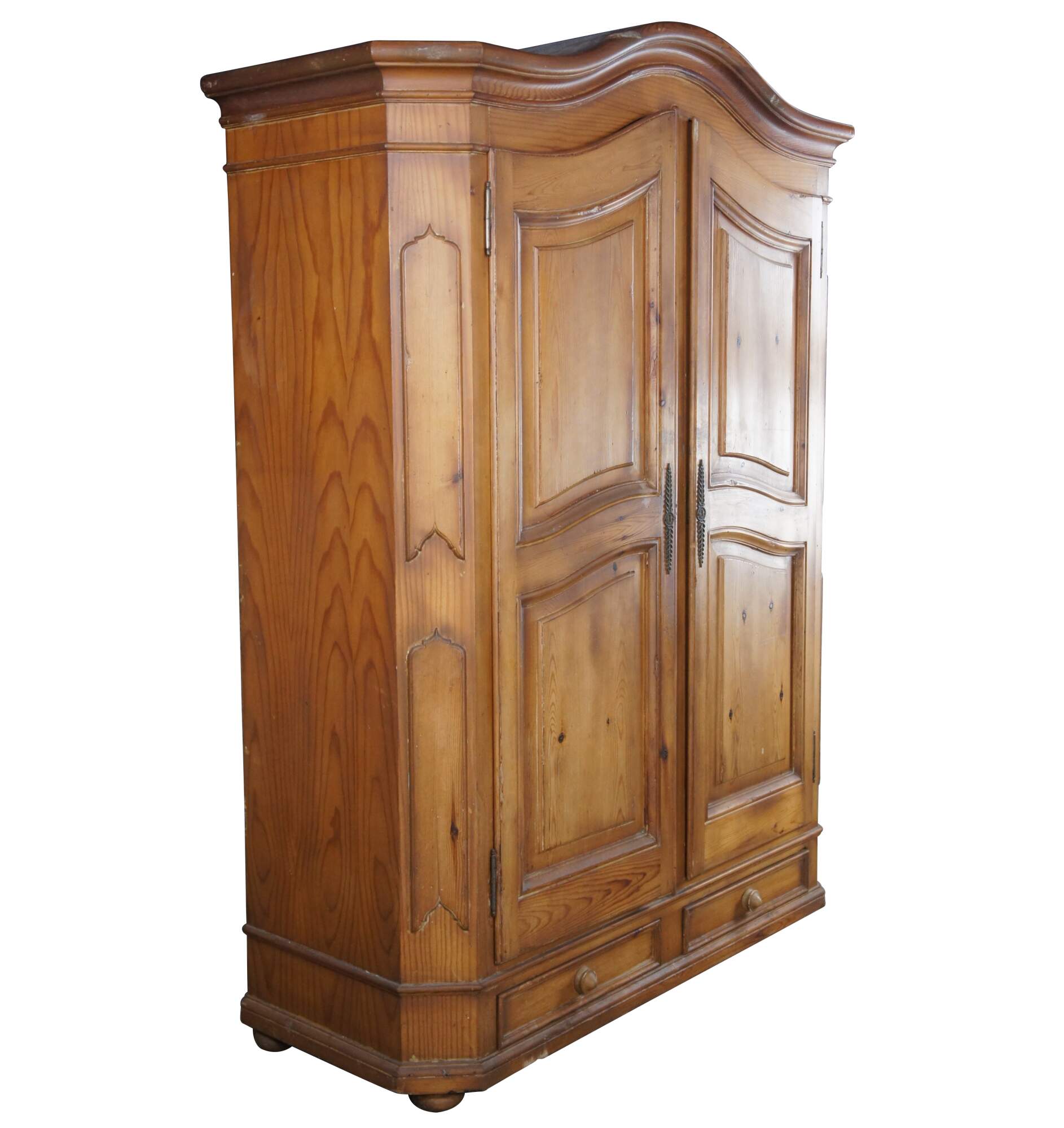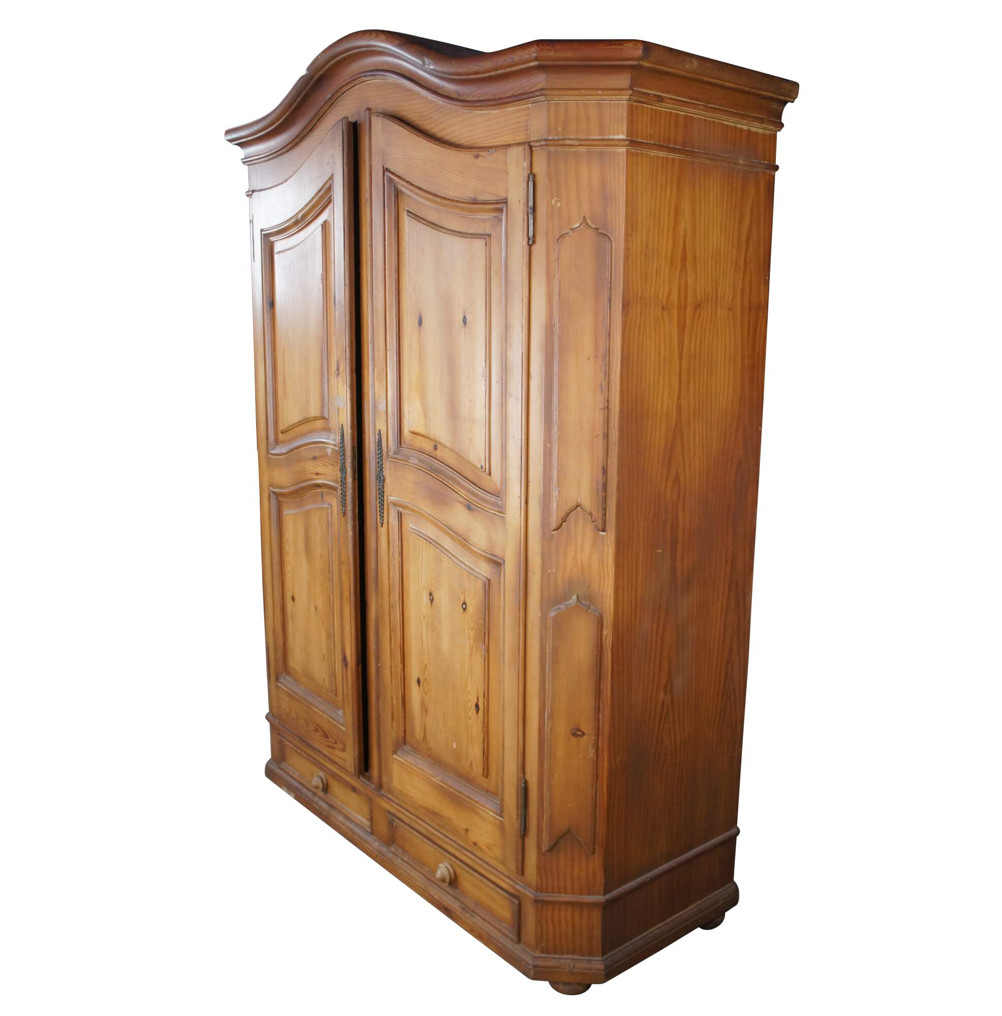An exquisite armoire from Garcia Imports. Made in Spain from a distressed pine. Includes a chifferobe setup with hanging bar along the left, 3 interior shelves to the right and lower drawers with a key for locking. Garcia specializes in reproducing old world designs using solid woods. A family business building off of 3 generations of craftsmanship.