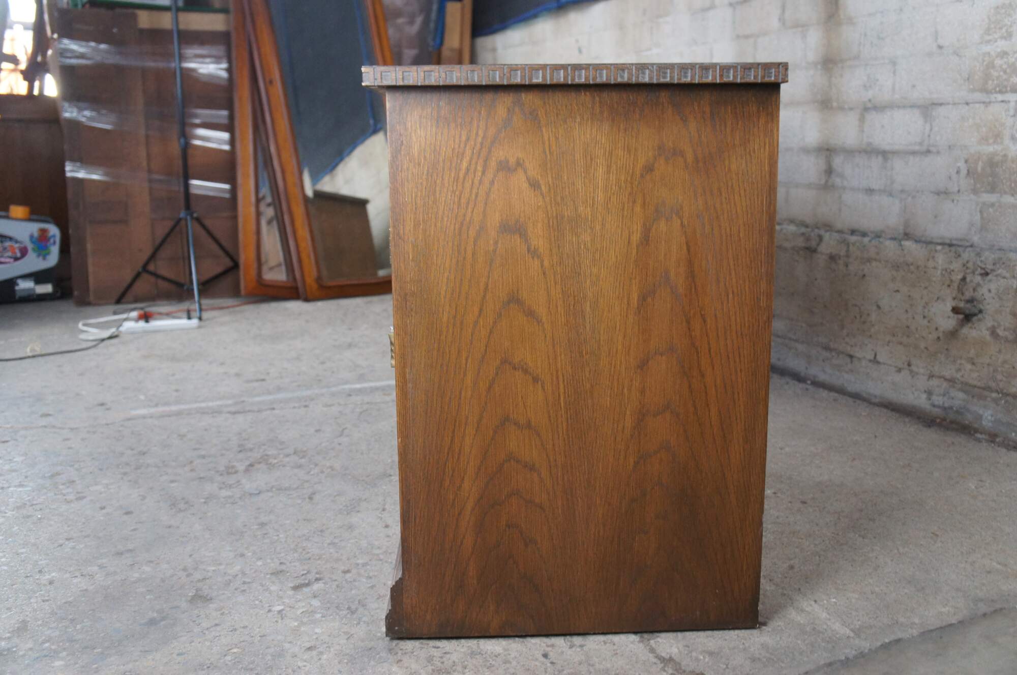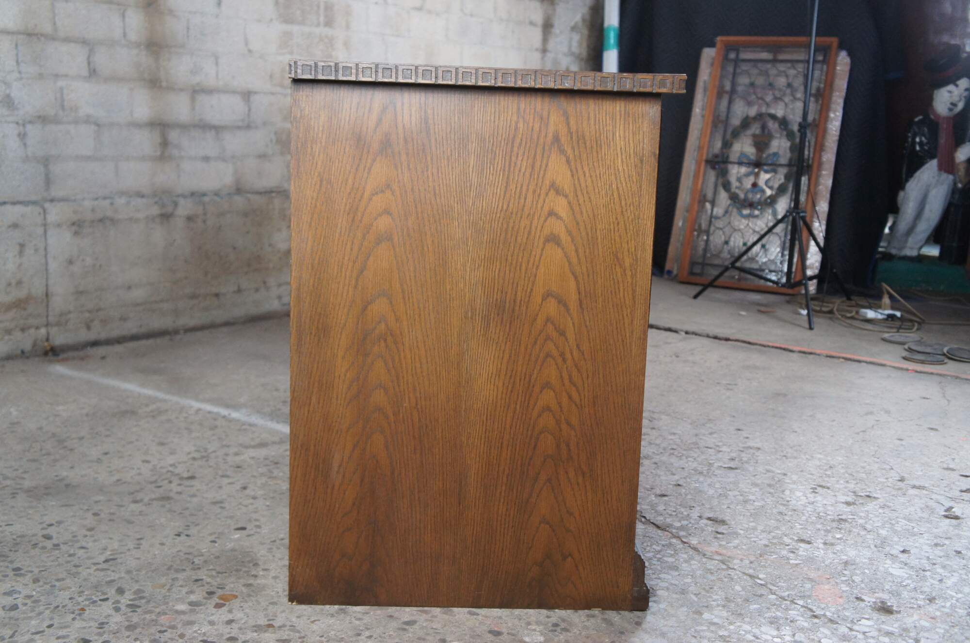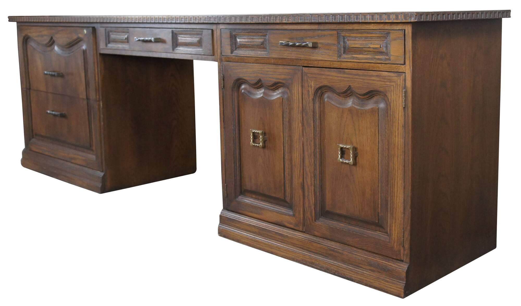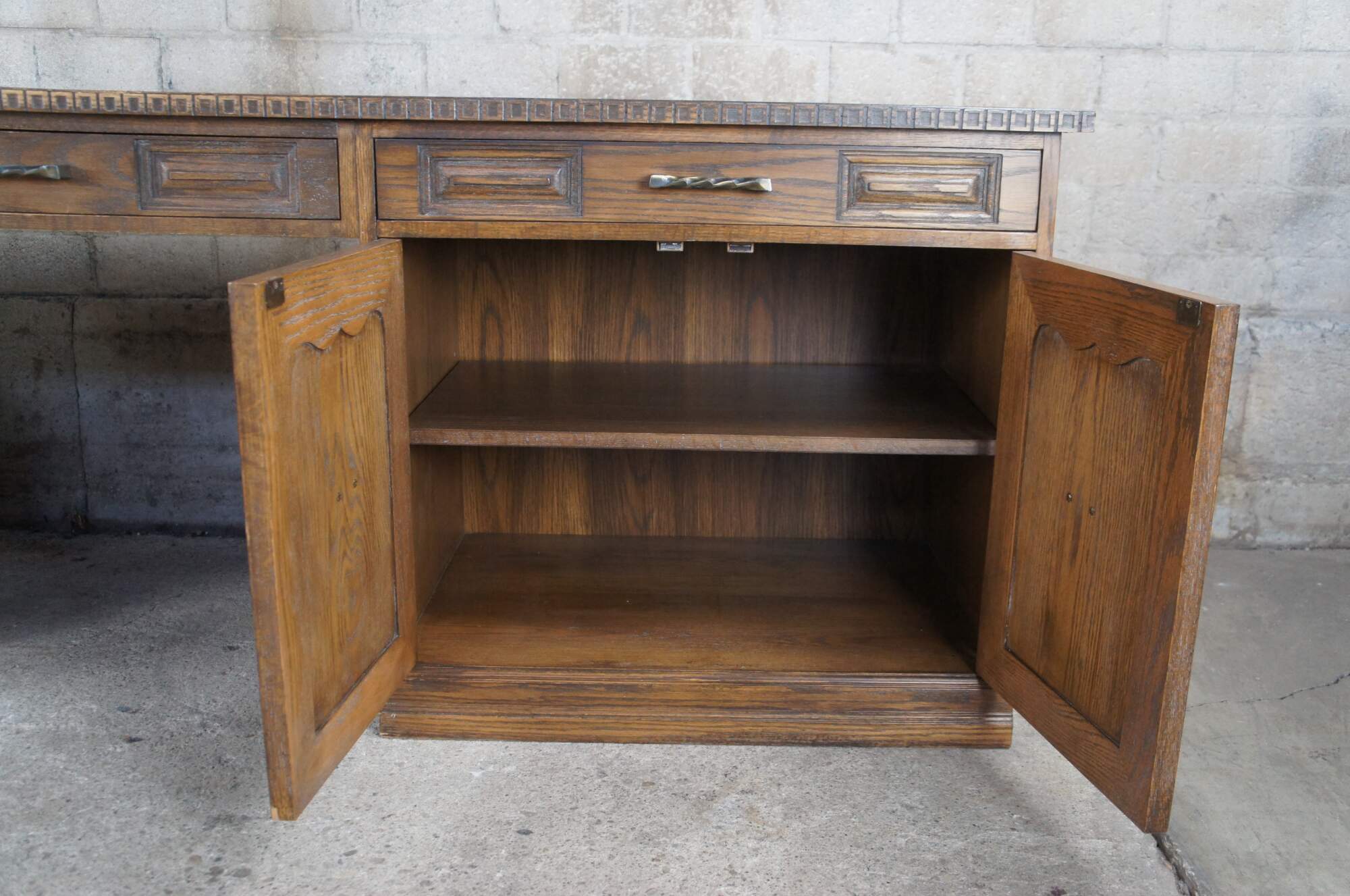 Romweber (R-13600) Viking Oak Executive Credenza Desk circa 1980s. Features a large oak top and square carved edge. The base of the desk has shapely Nordic inspired moldings and twisted brass hardware. Opens to two file drawers along the left and a cabinet with shelf to the right. Includes two additional smaller drawers and a pencil or pen tray.