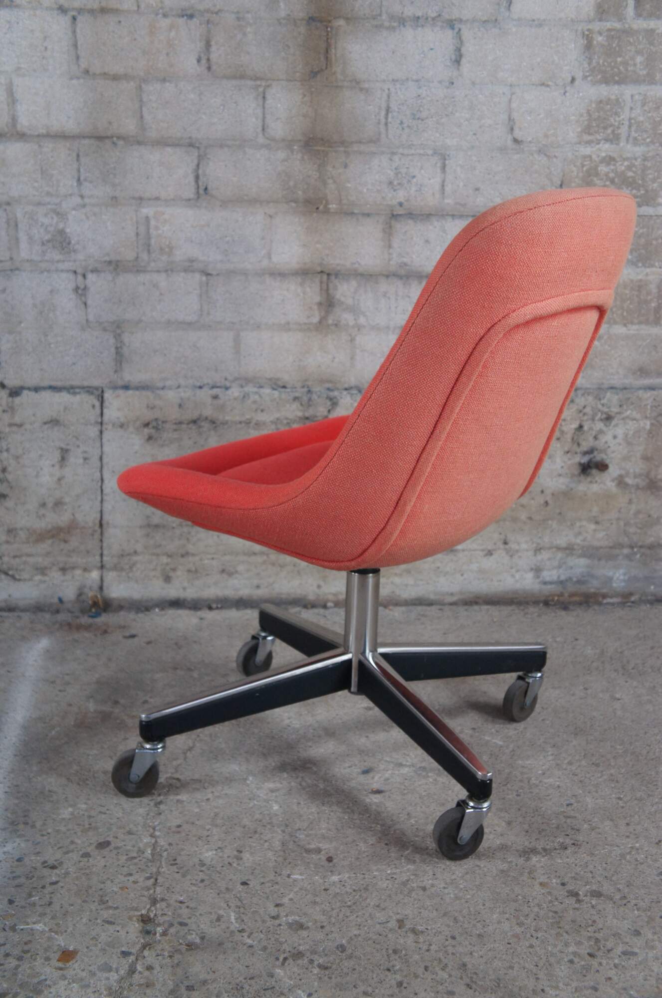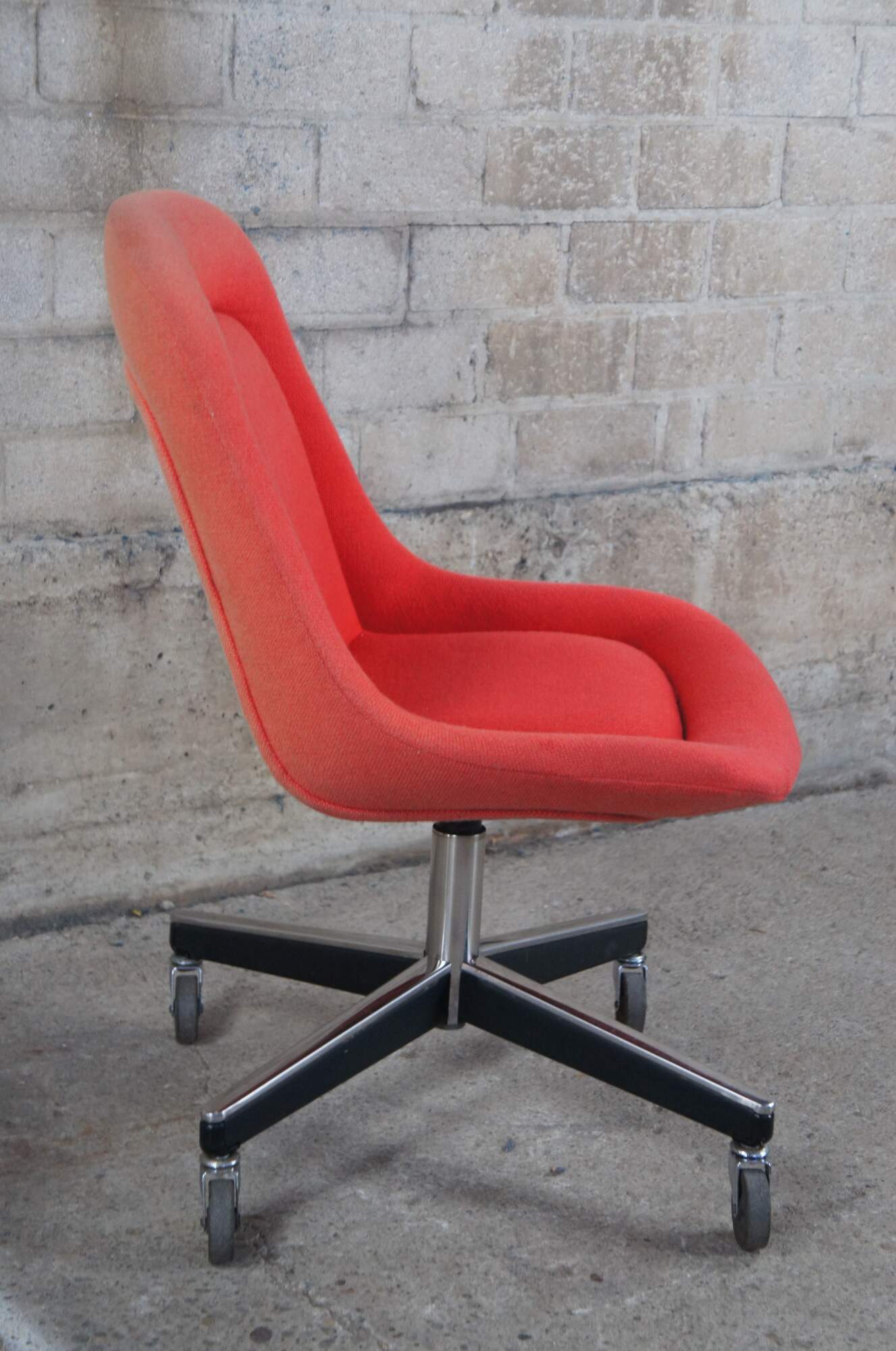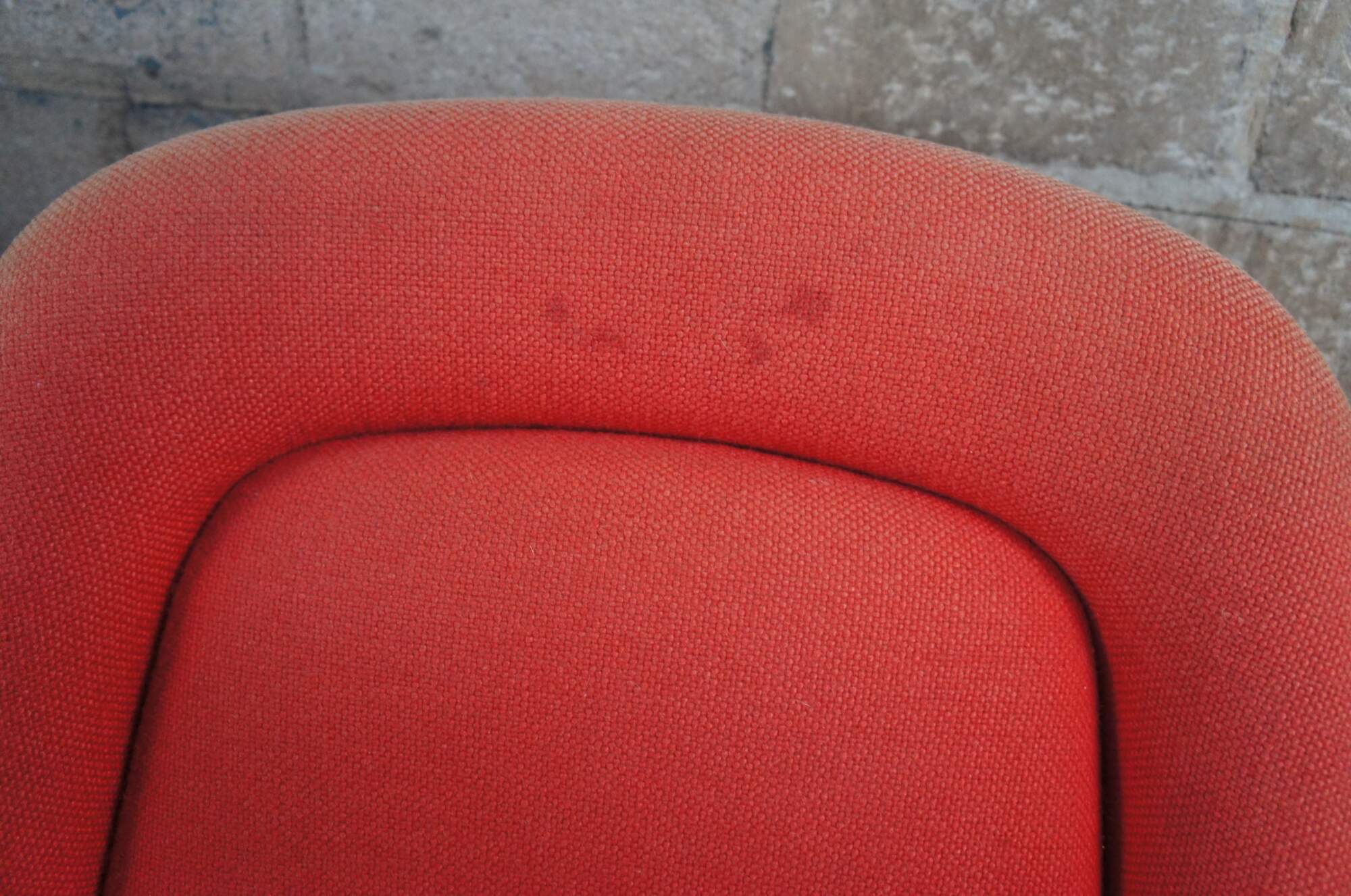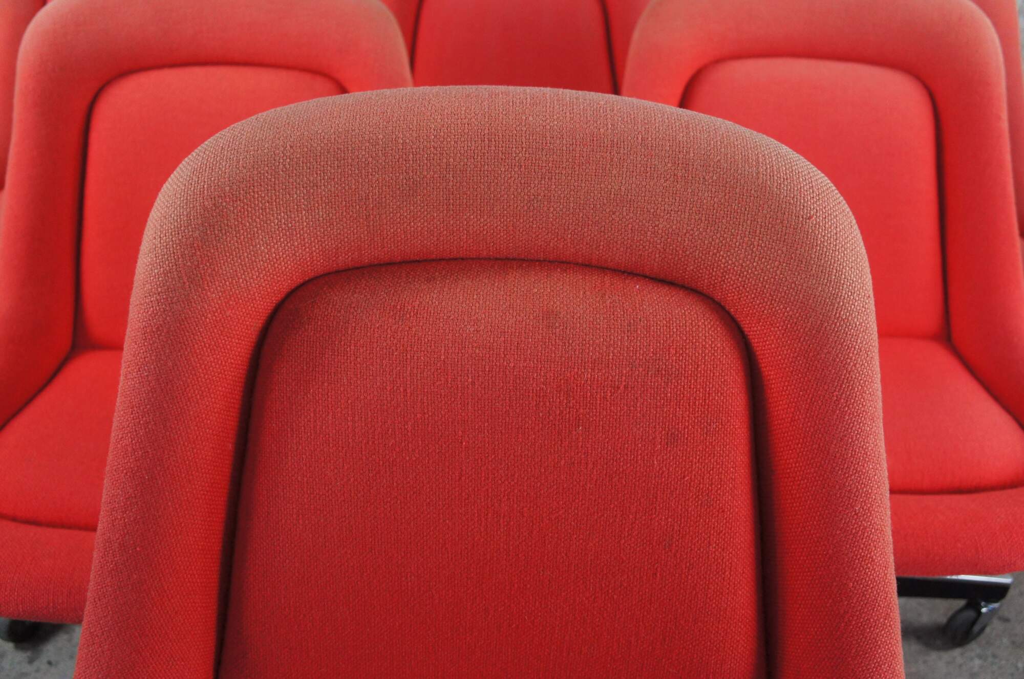 8 Max Pearson for Knoll International red wool upholstered rolling swivel chairs, circa 1960s. Great for conference table or dining use. Tulip shaped padded seats over steel swivel rolling base. marked along underside.