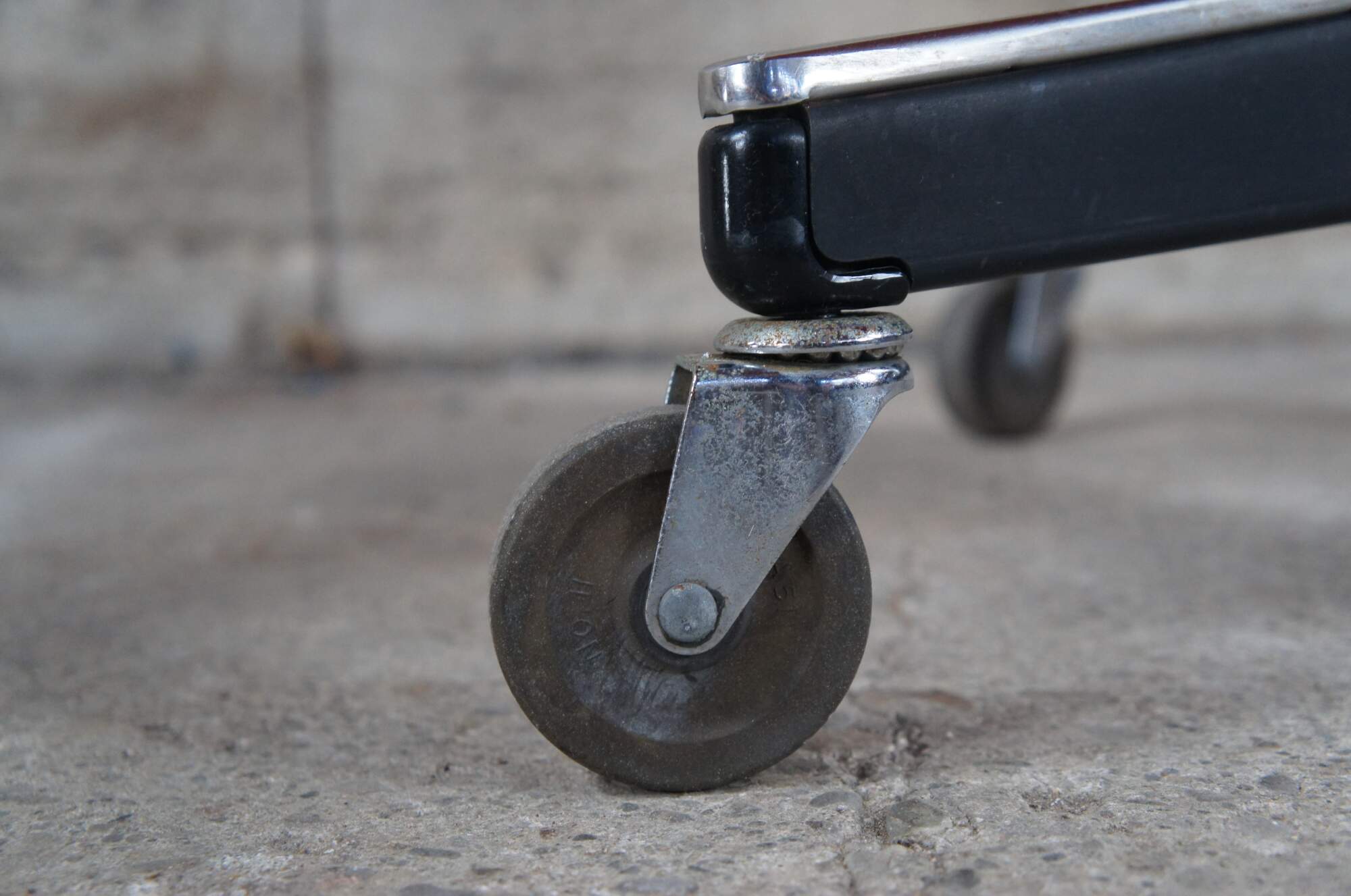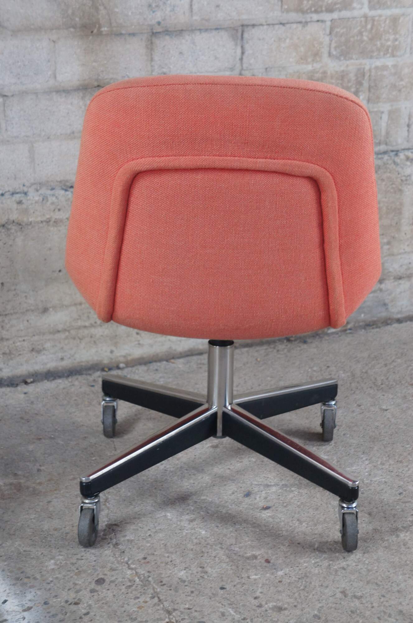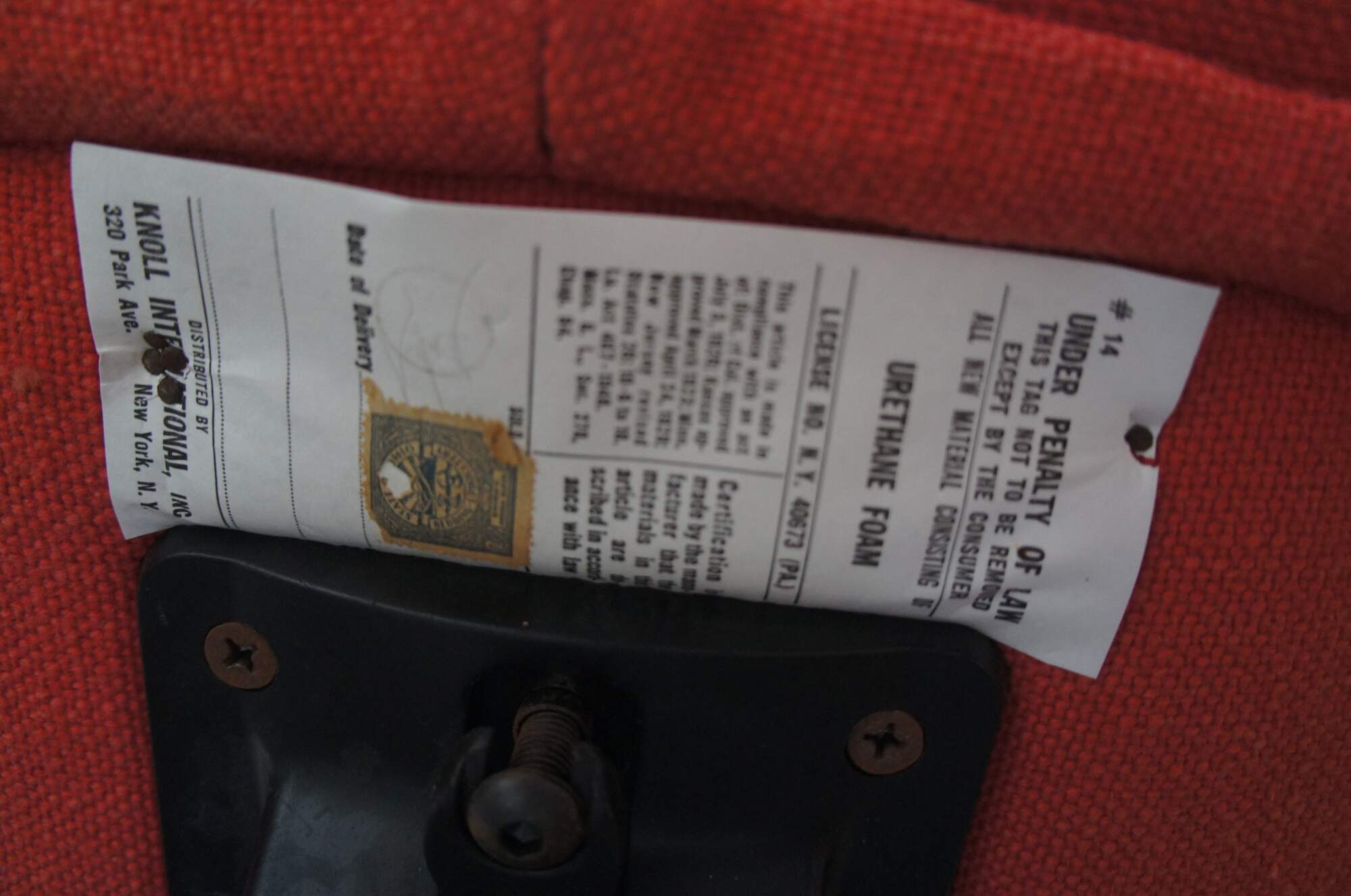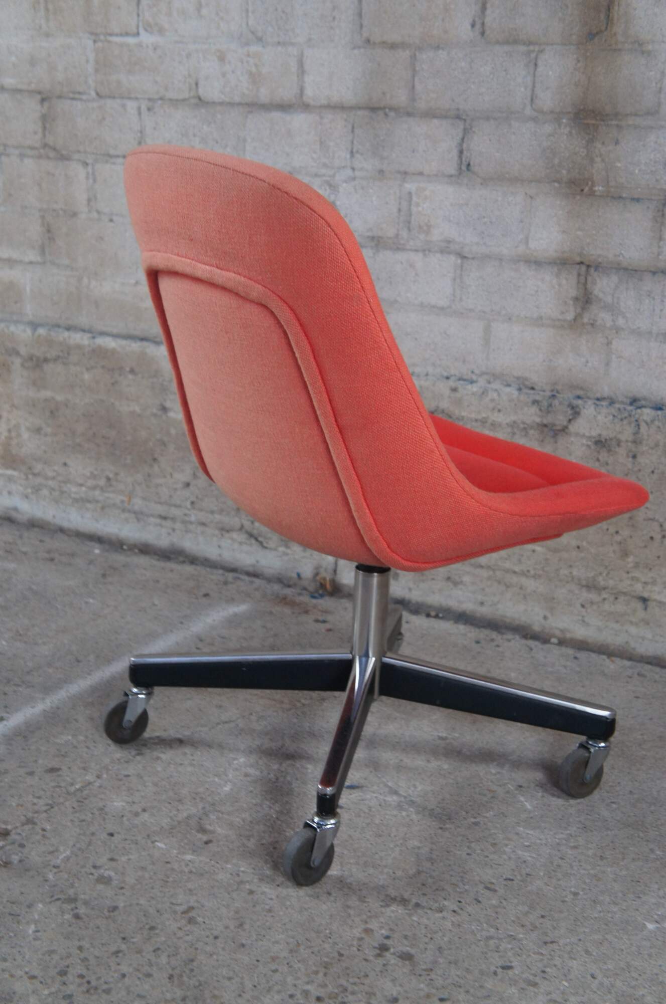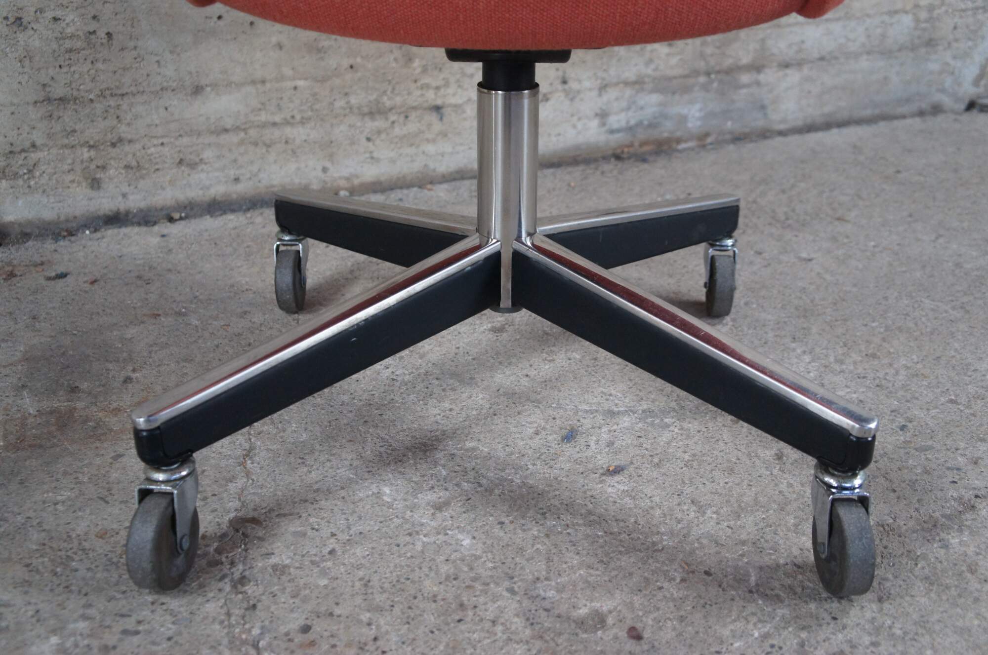 8 Max Pearson for Knoll International red wool upholstered rolling swivel chairs, circa 1960s. Great for conference table or dining use. Tulip shaped padded seats over steel swivel rolling base. marked along underside.