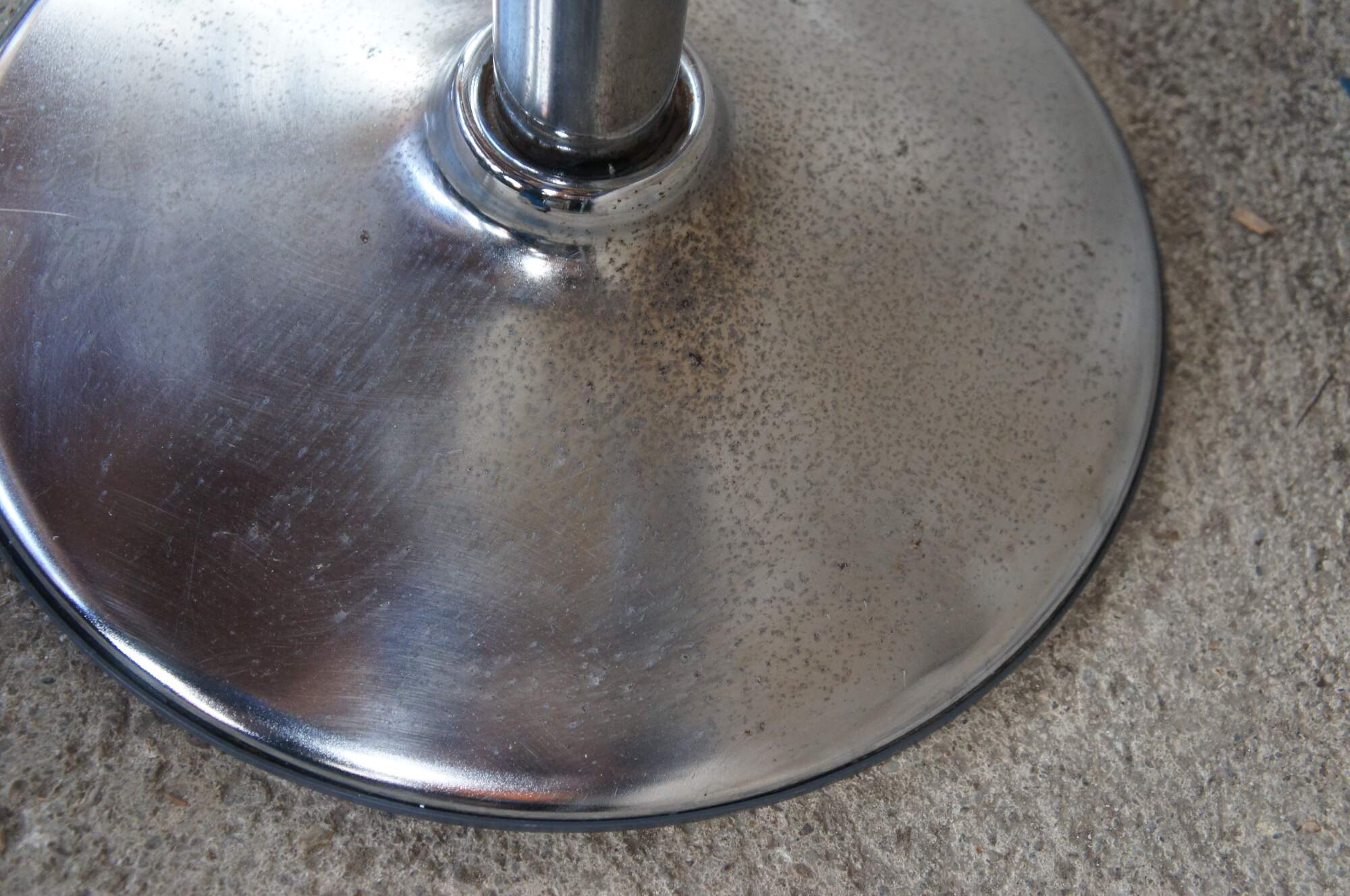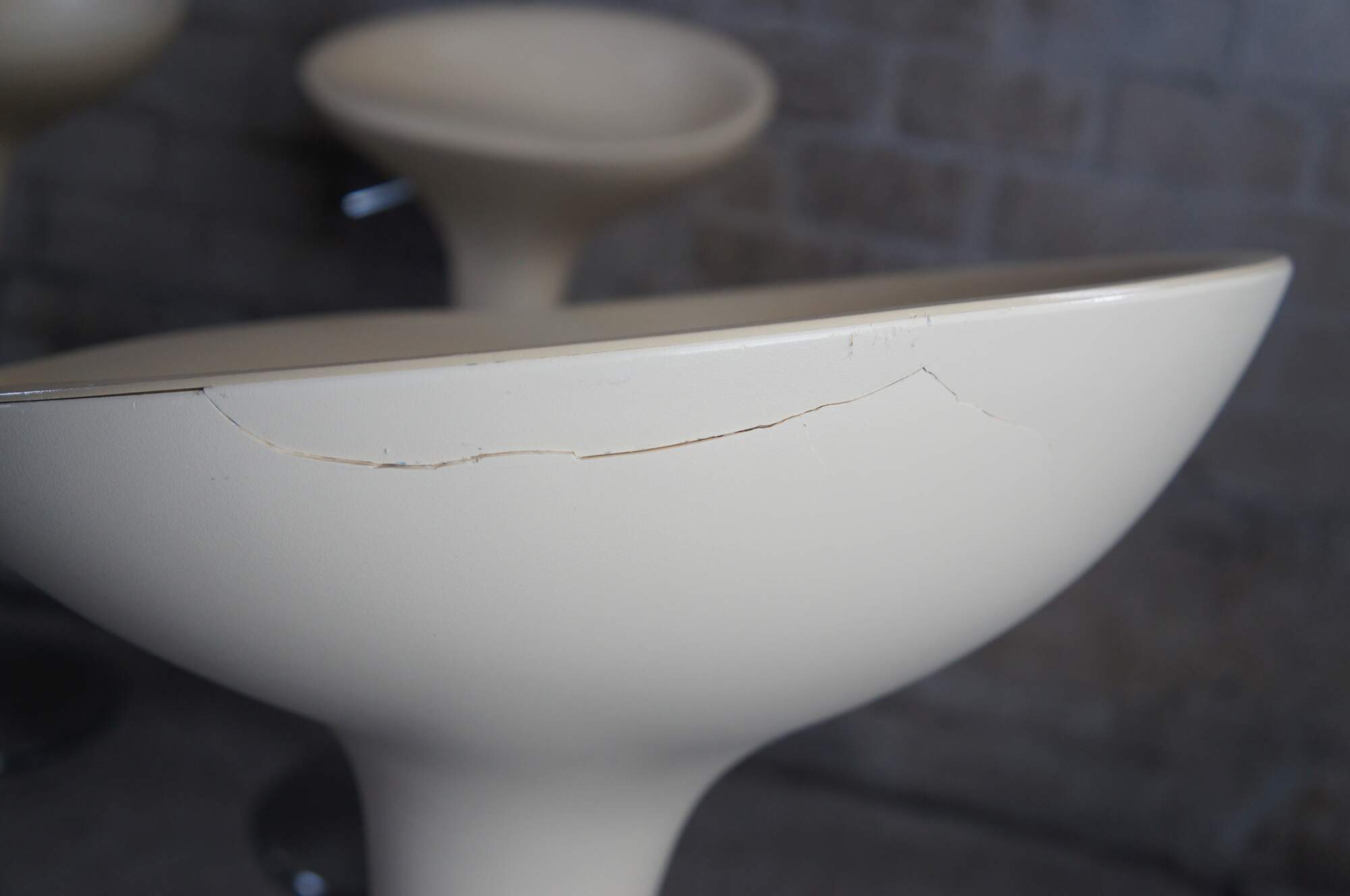Good Vintage Condition; some pitting to the bases from use and age. One of the chair has a crack along the back and is still functional.