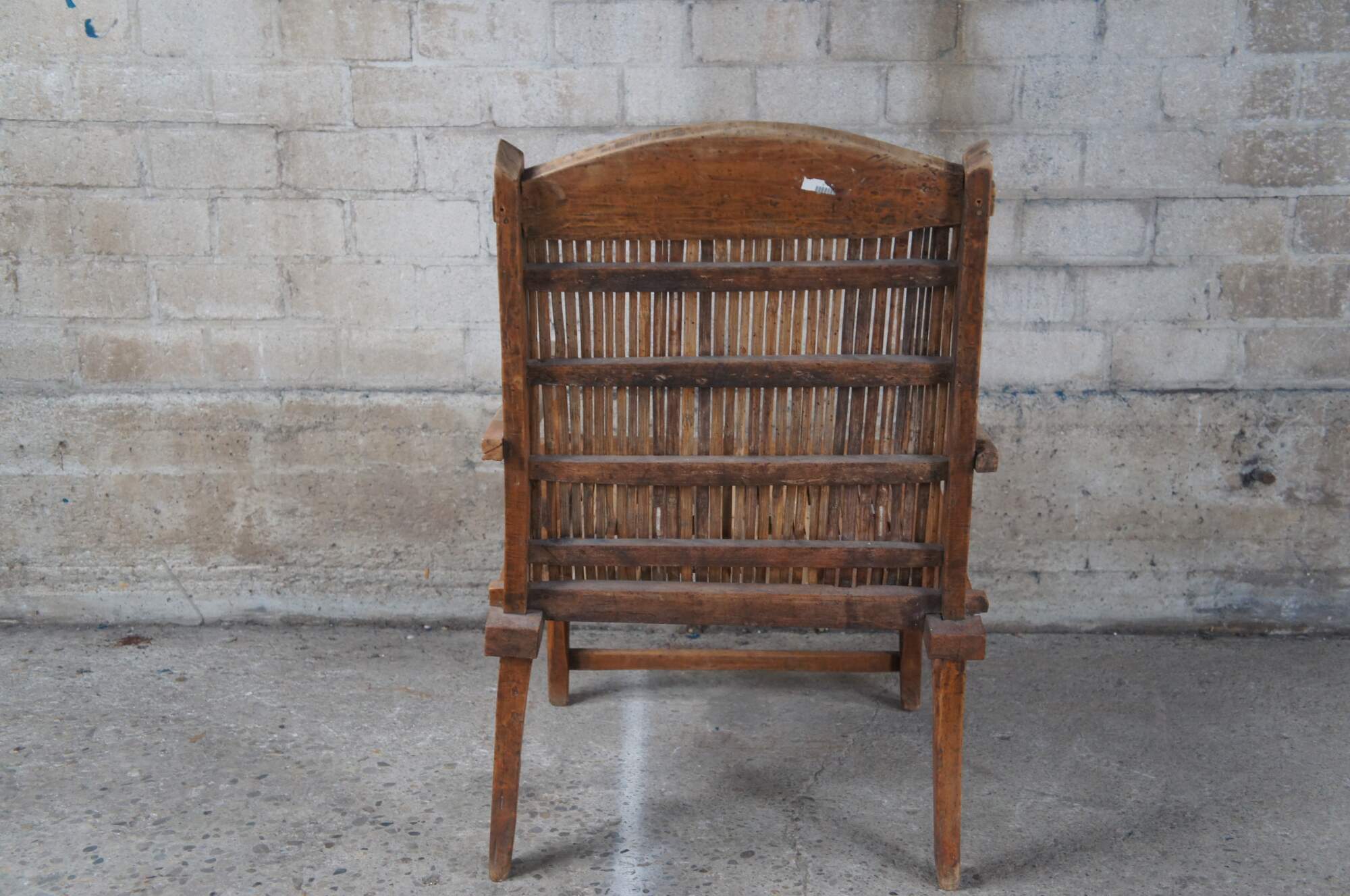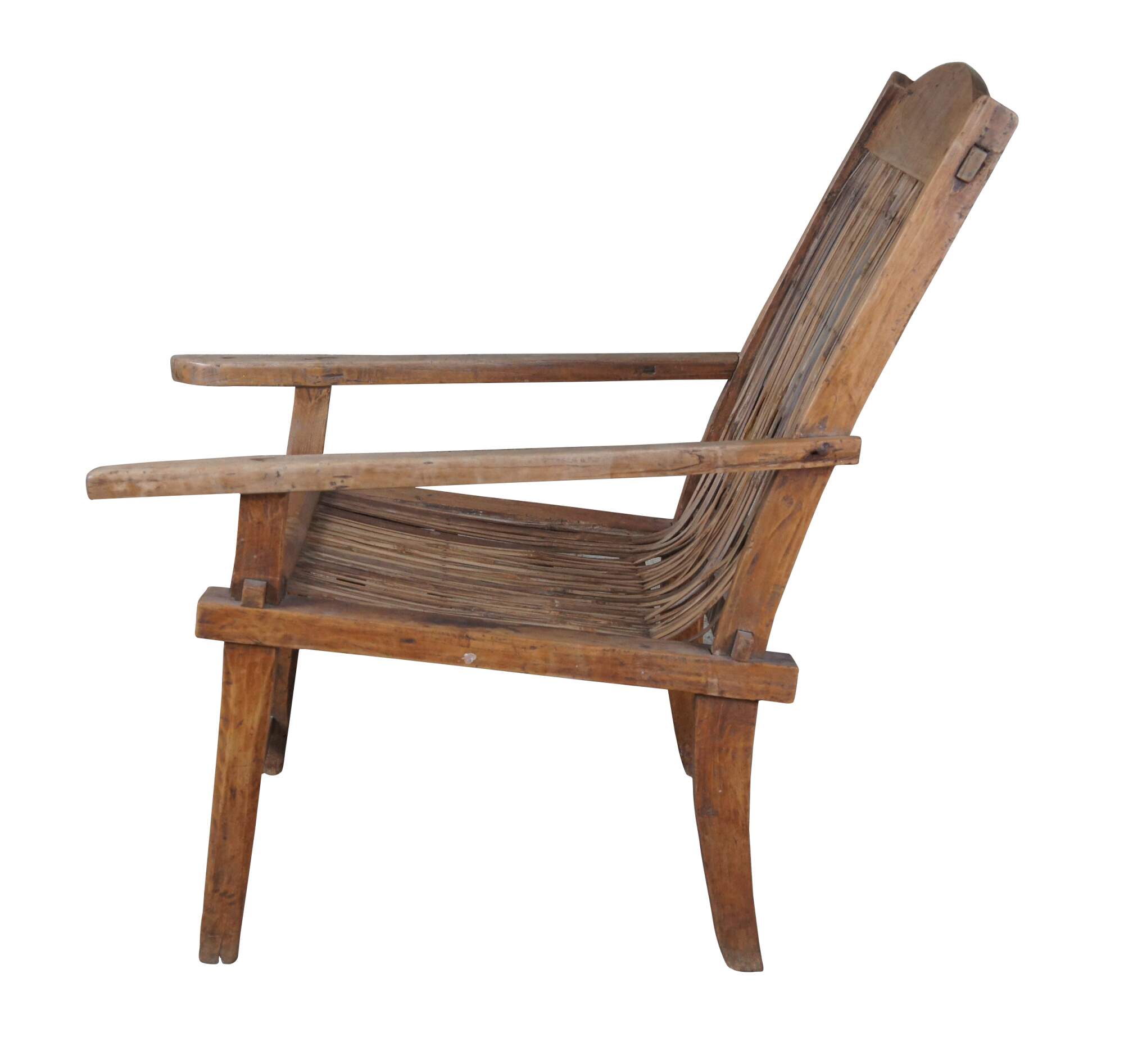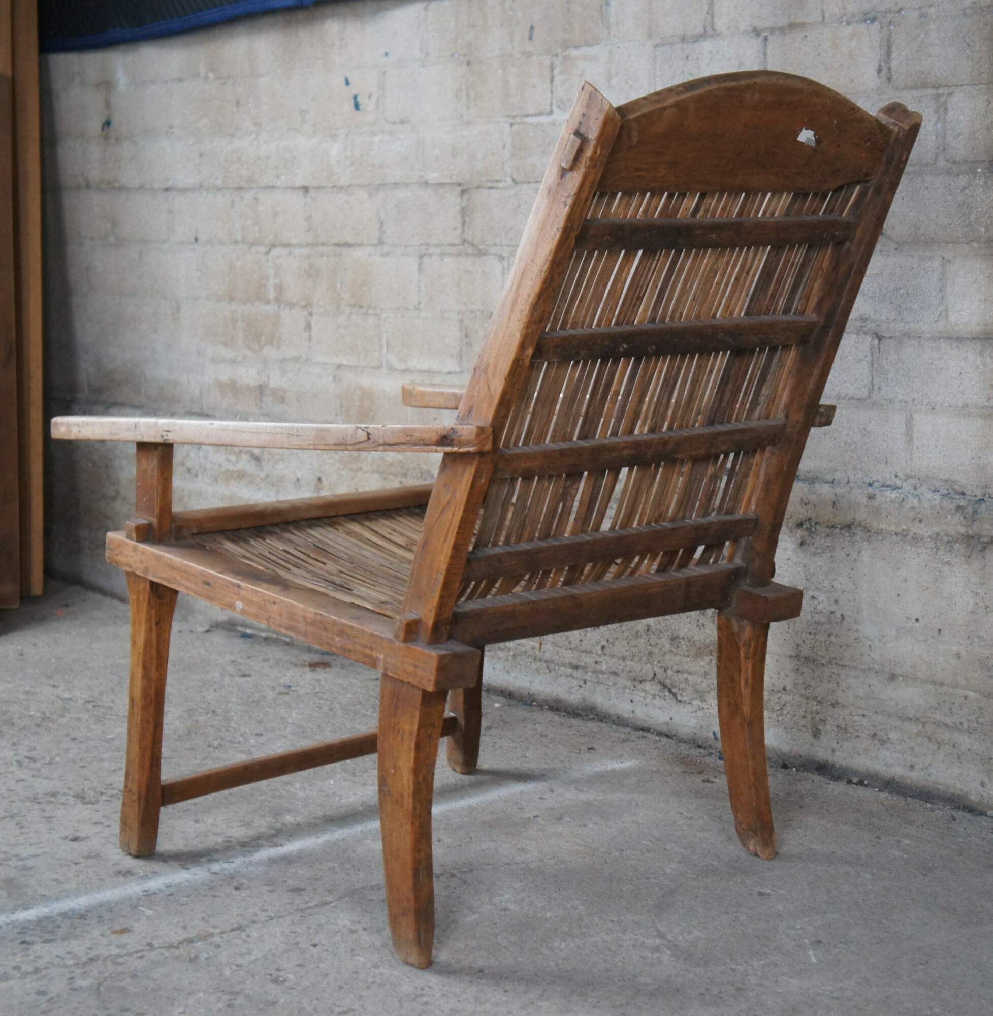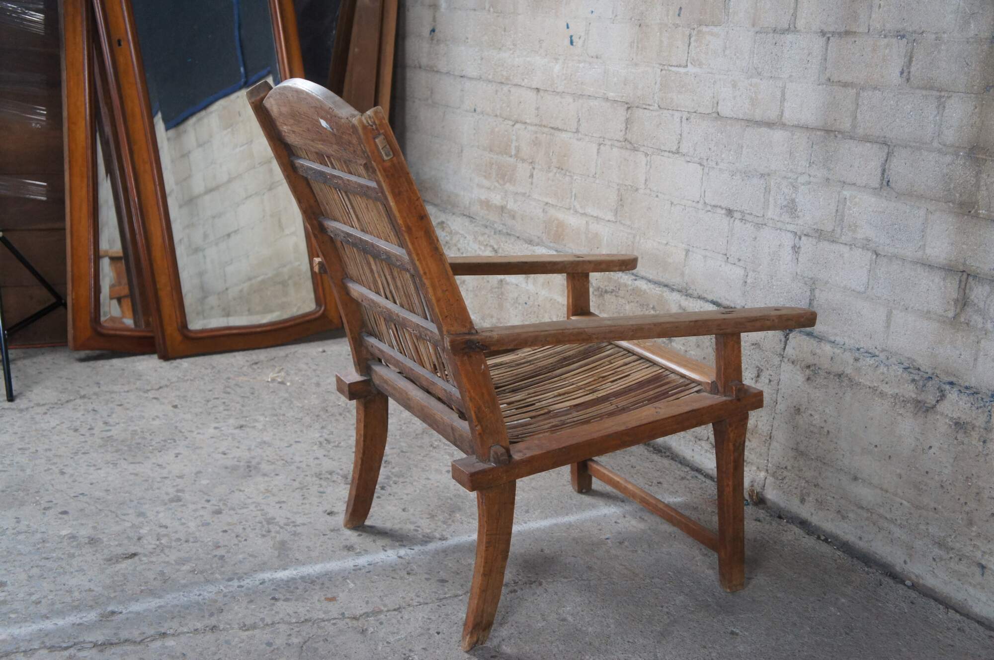 Early 20th century British Colonial Anglo Indian plantation chair. Made from teak in mortise and tenon joinery with a relaxed lounged frame and long arms. Features a curved crest rail and split reed bent rattan seat.
