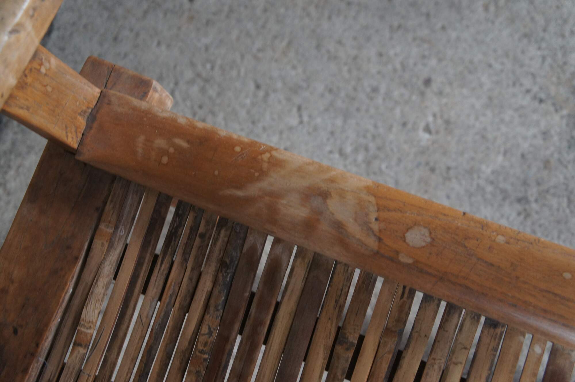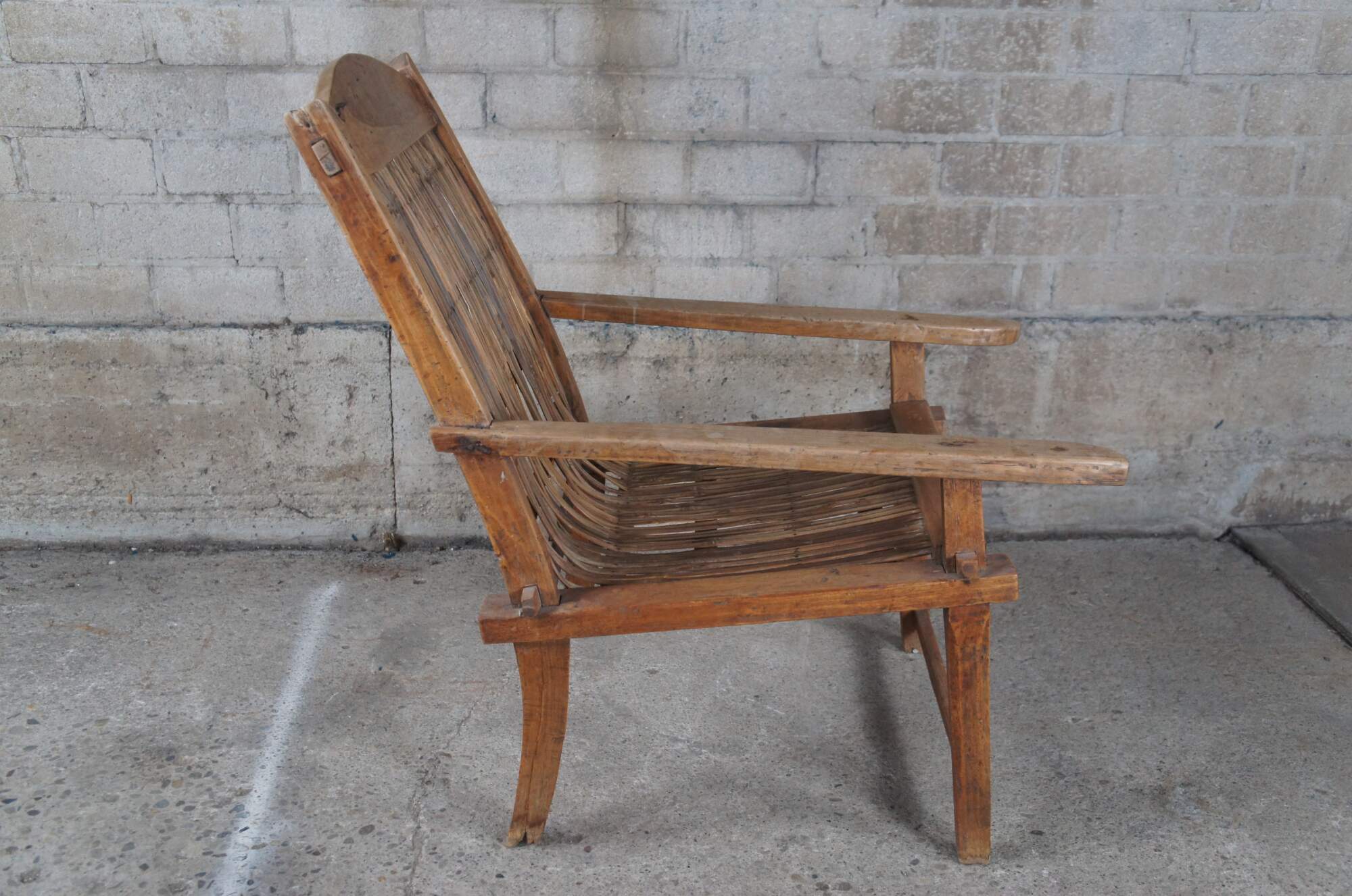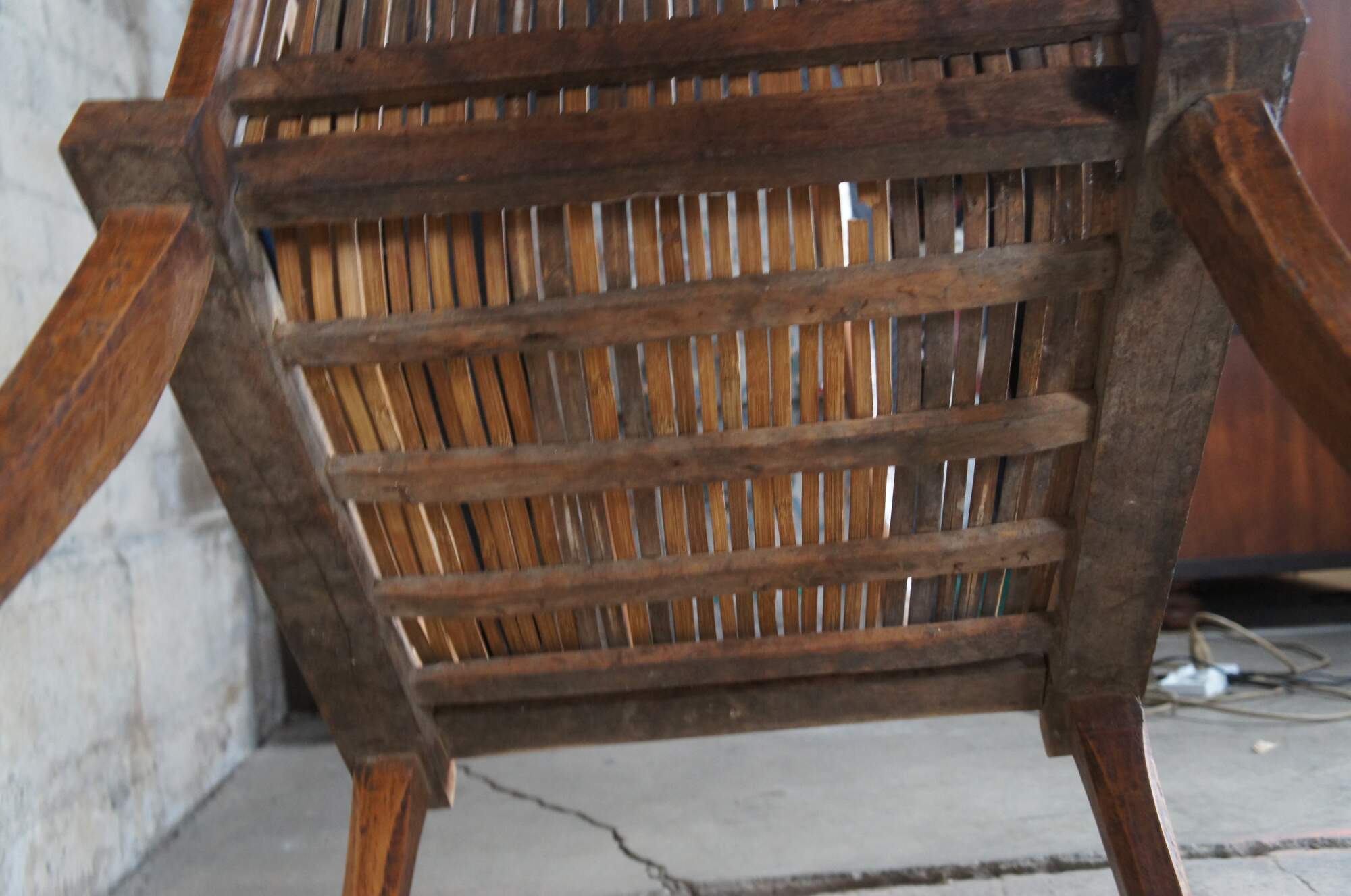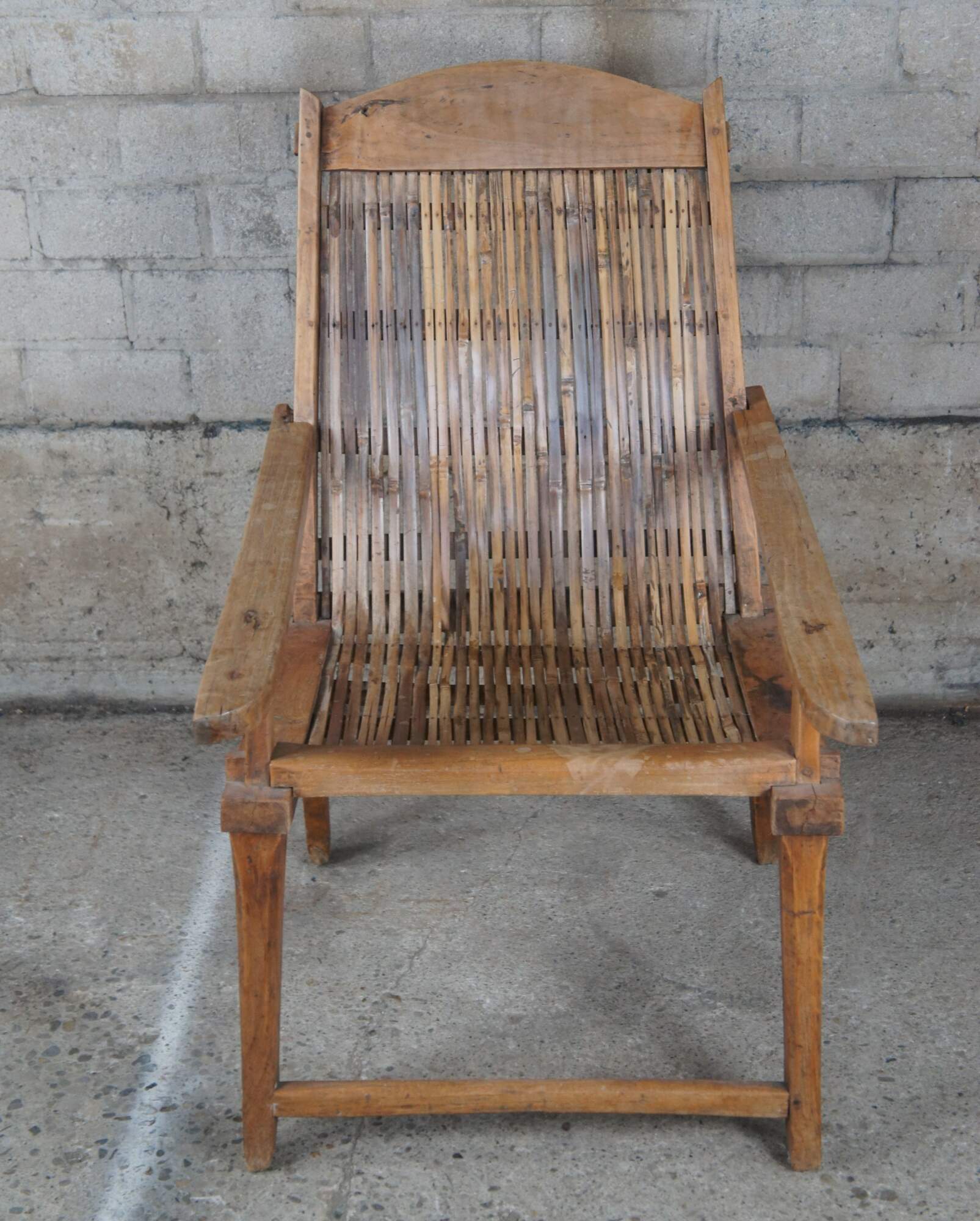 Early 20th century British Colonial Anglo Indian plantation chair. Made from teak in mortise and tenon joinery with a relaxed lounged frame and long arms. Features a curved crest rail and split reed bent rattan seat.