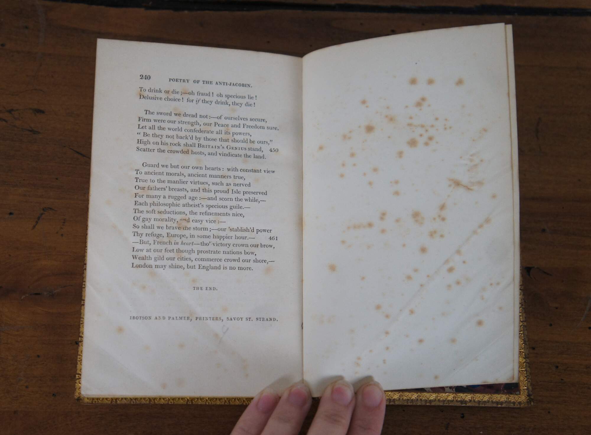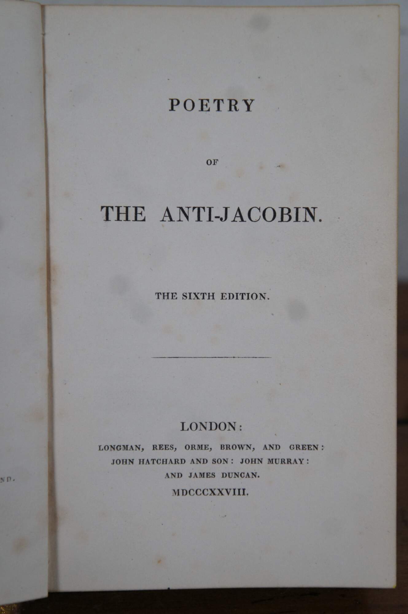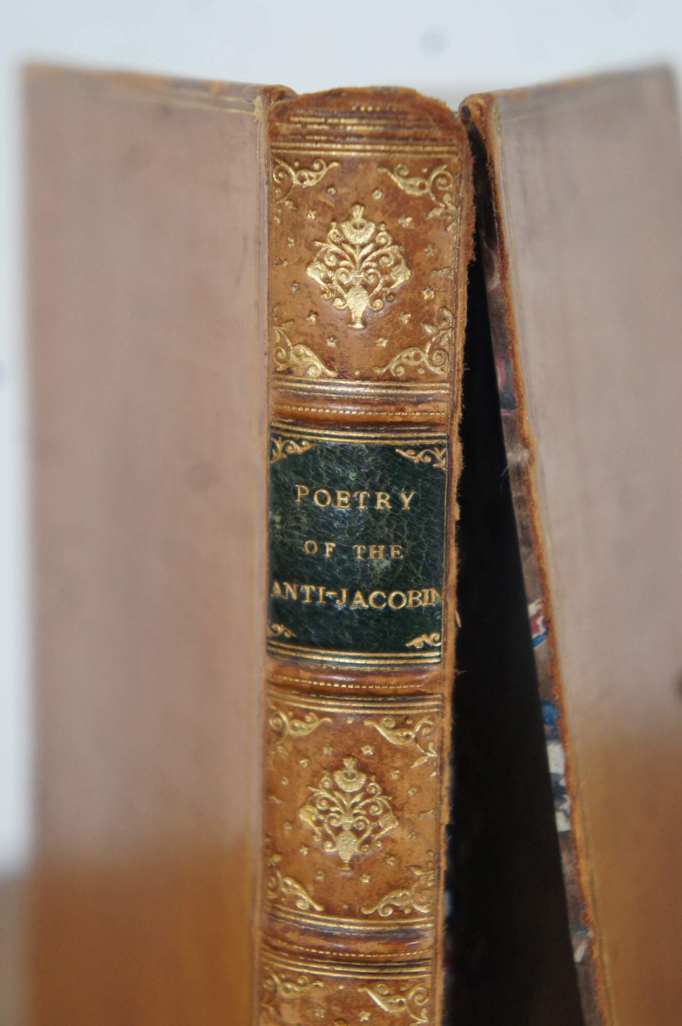 Antique Regency era brown leather bound hard cover book titled “Poetry of the Anti-Jacobin” by a variety of anonymous authors – The Sixth Edition – printed by Ibotson and Palmer, London - published by Longman, Rees, Orme, Brown, and Green; John Hatchard and Son; John Murray; and James Duncan, London – 1828.