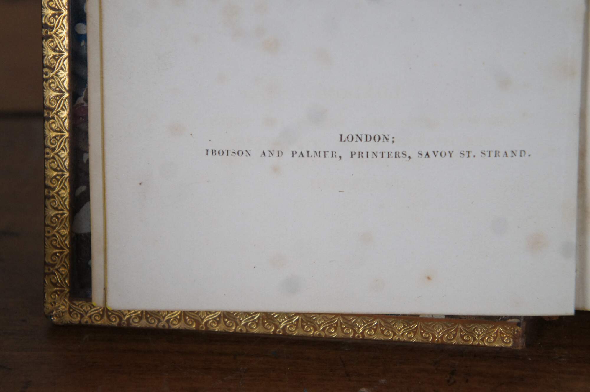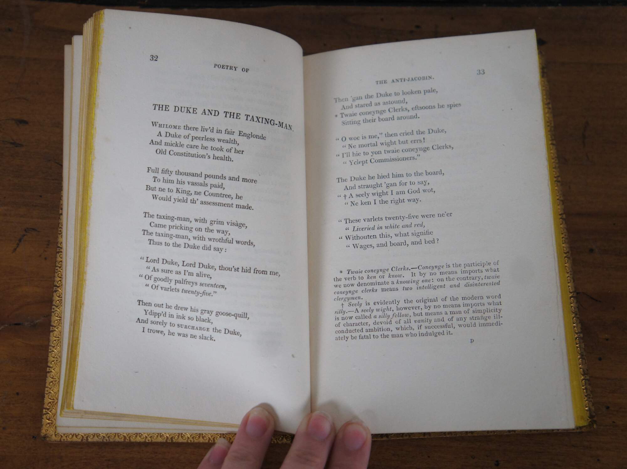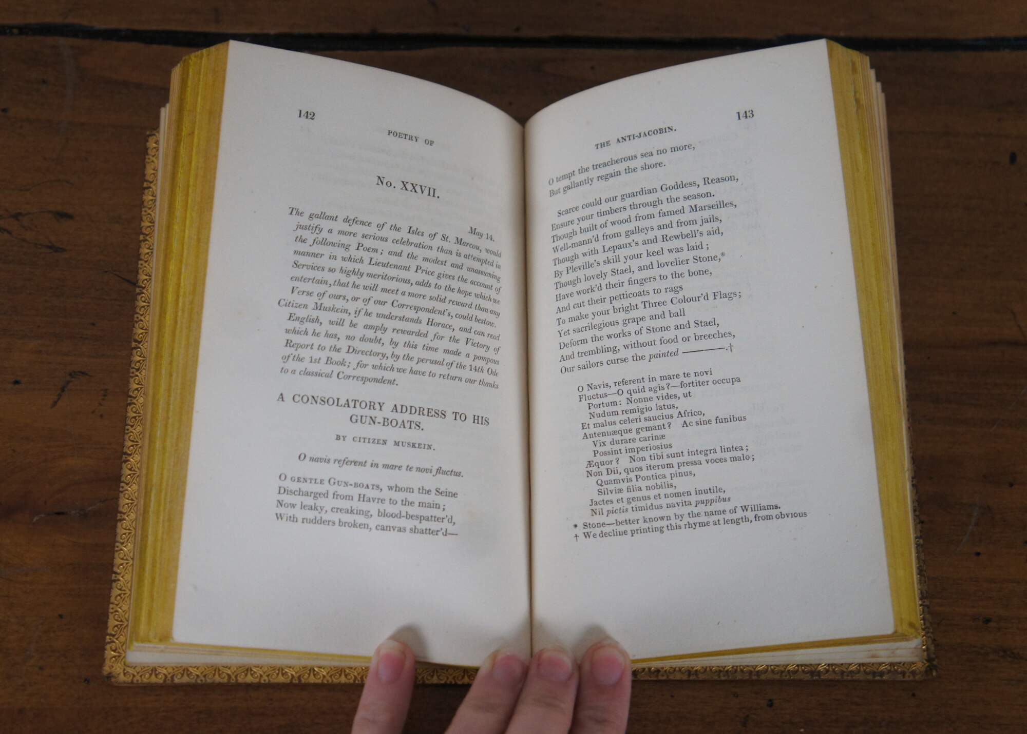 Antique Regency era brown leather bound hard cover book titled “Poetry of the Anti-Jacobin” by a variety of anonymous authors – The Sixth Edition – printed by Ibotson and Palmer, London - published by Longman, Rees, Orme, Brown, and Green; John Hatchard and Son; John Murray; and James Duncan, London – 1828.
