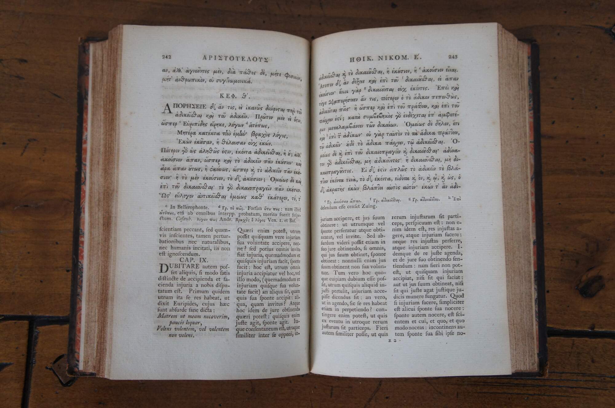 Antique Victorian era leather bound hard cover book titled “Aristotelis Ethicorum Nicomacheorum” (The Nicomachean Ethics of Aristotle) by Aristotle, printed in a parallel text of Greek and Latin. No publisher details found.