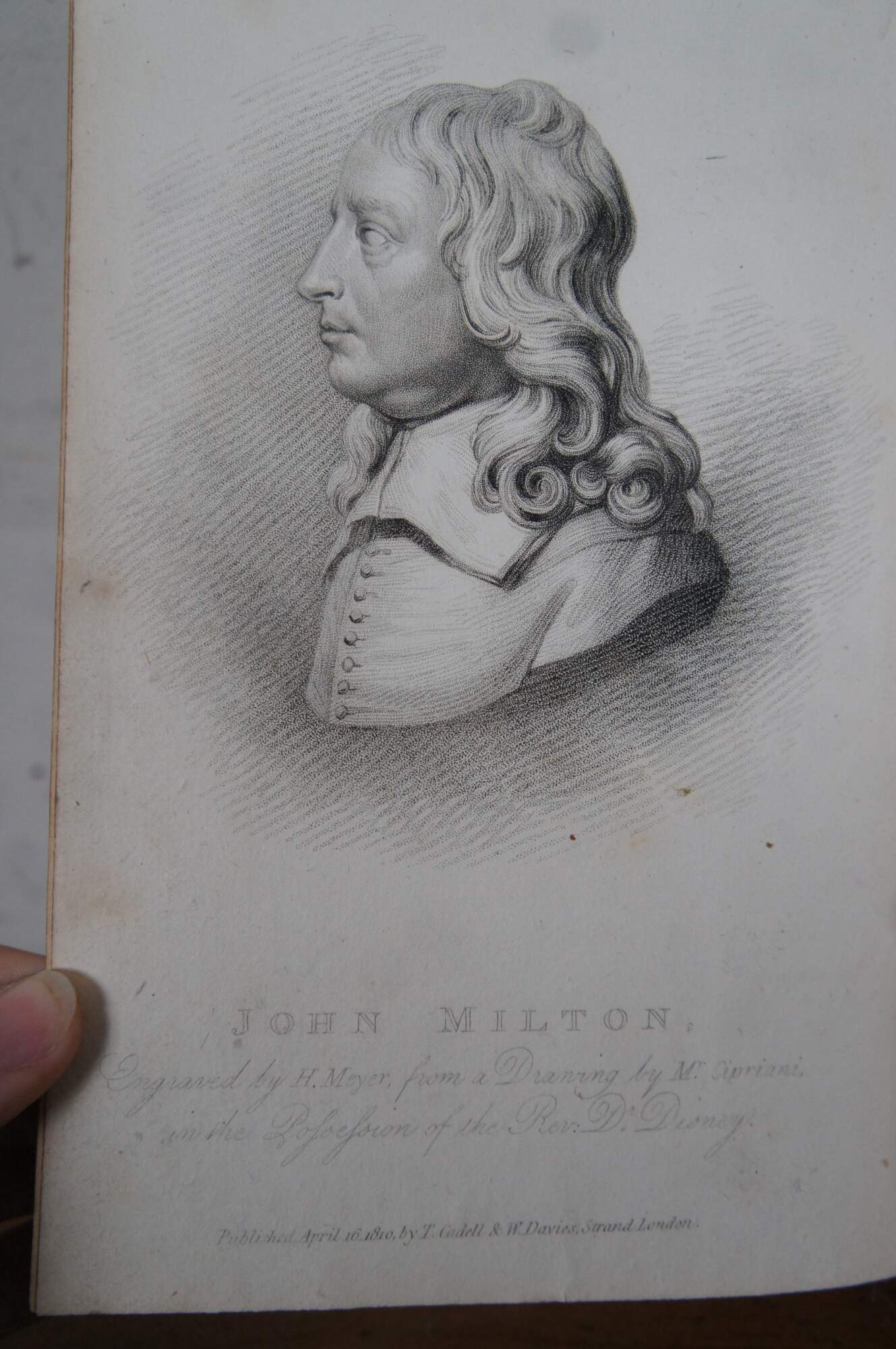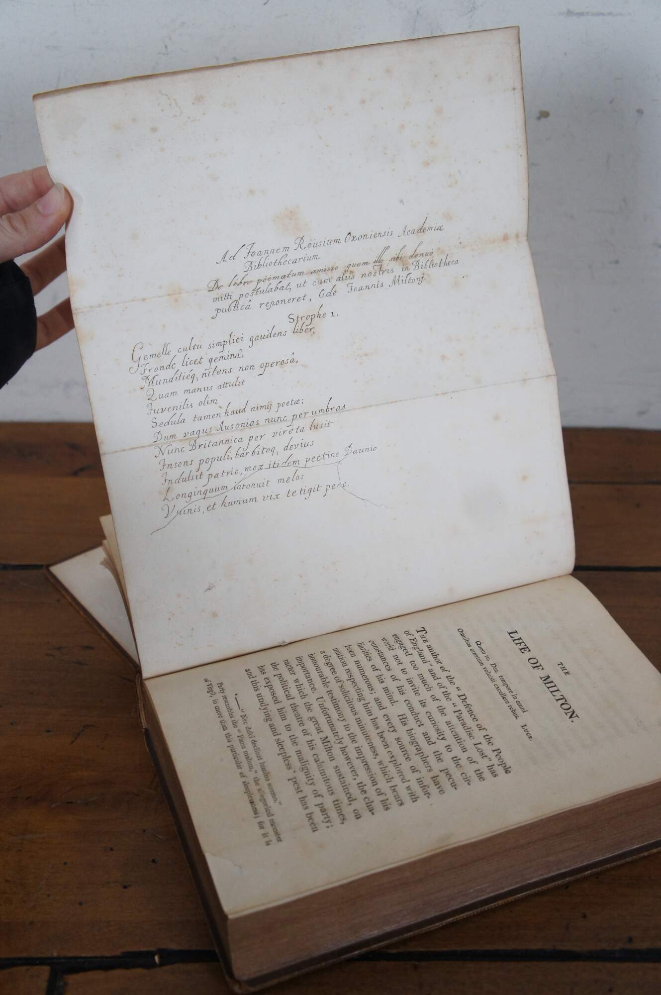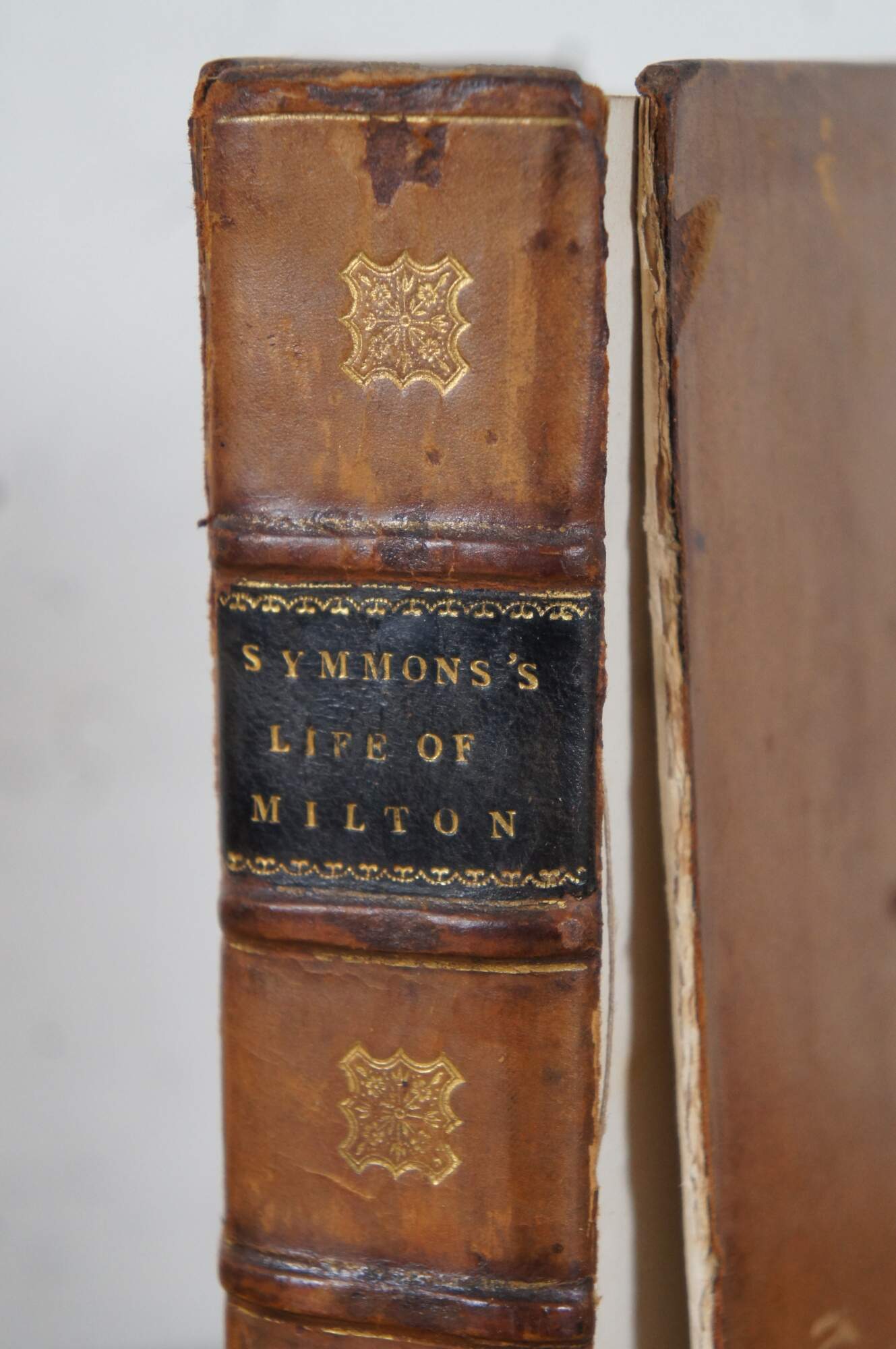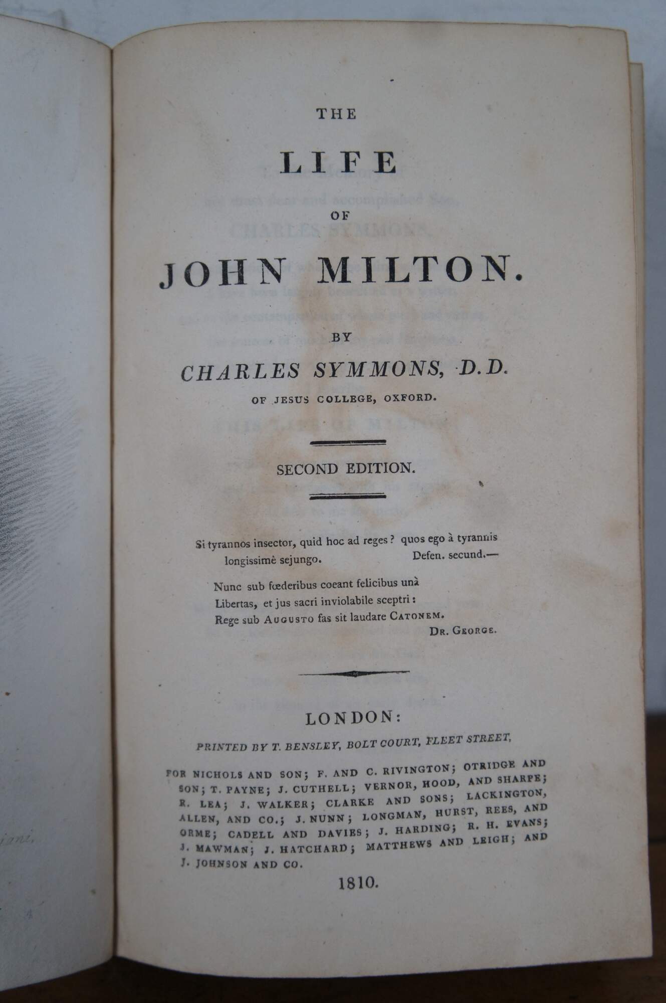 Antique Georgian era brown leather book titled “The Life of John Milton” by Charles Symmons, D.D. of Jesus College, Oxford – Second edition – printed by T. Bensley, London, for Nichols and Son, et al, 1810. Name of original owner written inside front cover.