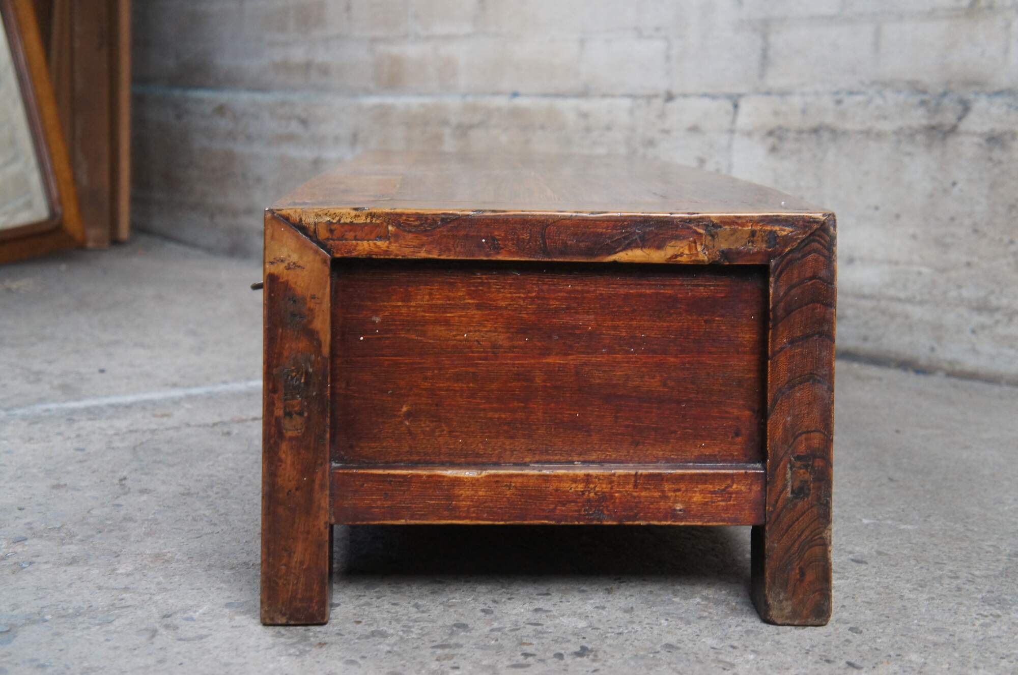 Antique Chinese Qing Dynasty Ming inspired console or coffee table, circa 1870s. A rectangular form made from Elm in mortise and tenon construction with inset panels. Includes three hand dovetailed drawers with brass hardware. A versatile piece that works well as a coffee / cocktail table, altar console or TV/ Media Stand.