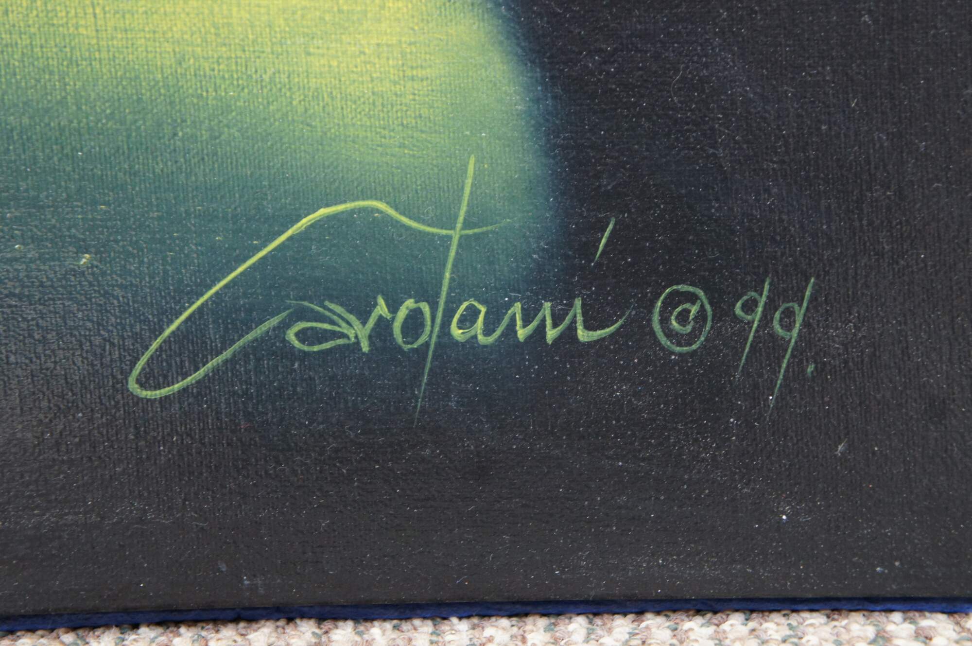 Vintage 1999 large scale oil on canvas painting of a pair of pears, done with intense chiaroscuro. Chiaroscuro in art, is the use of strong contrasts between light and dark, usually bold contrasts affecting a whole composition. Signed and dated in the lower right.