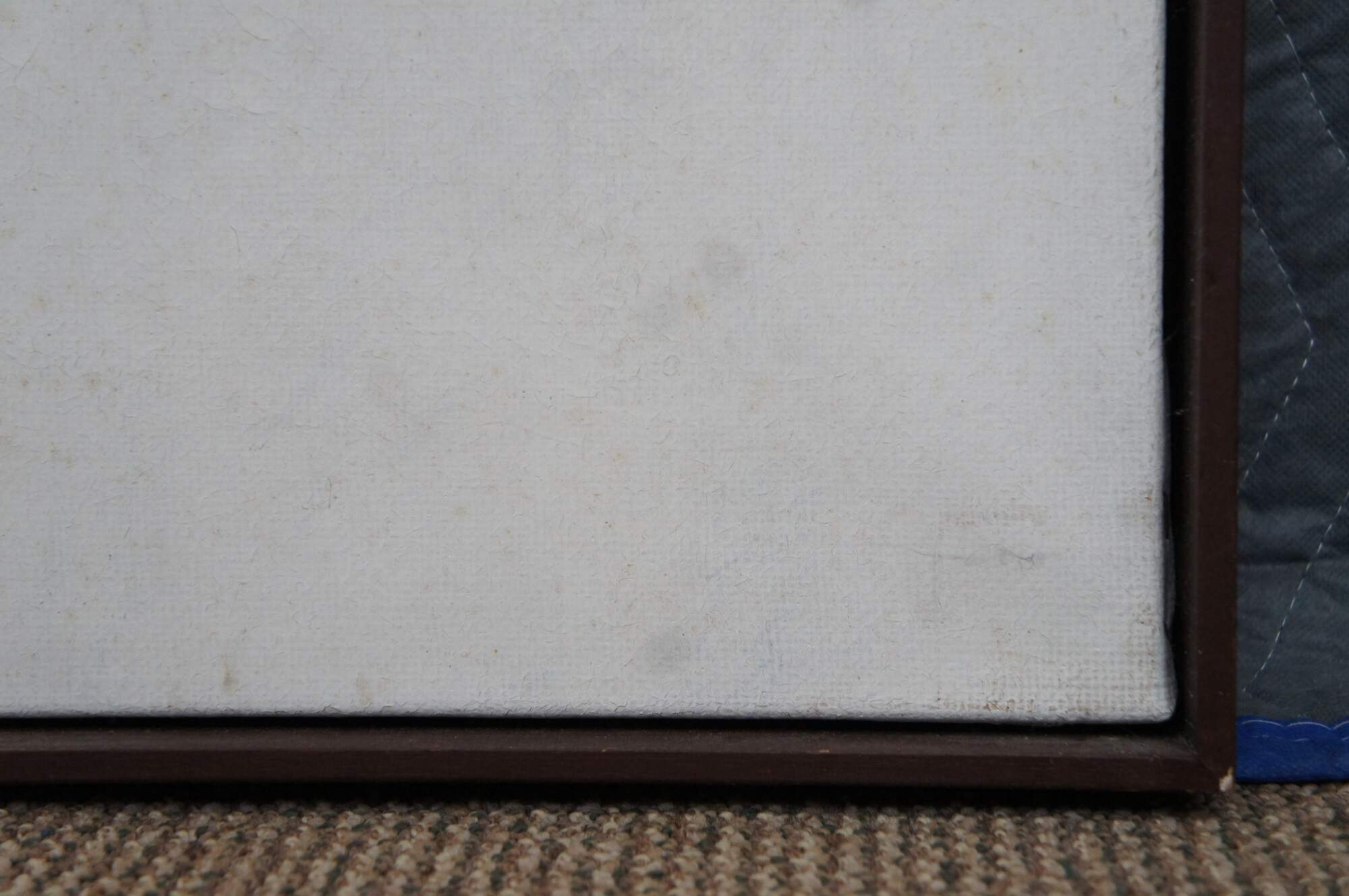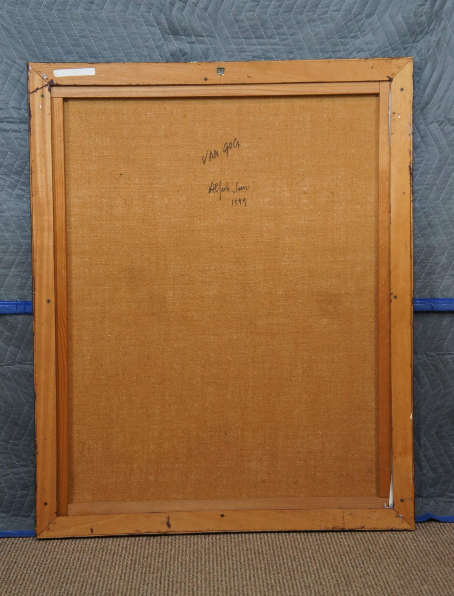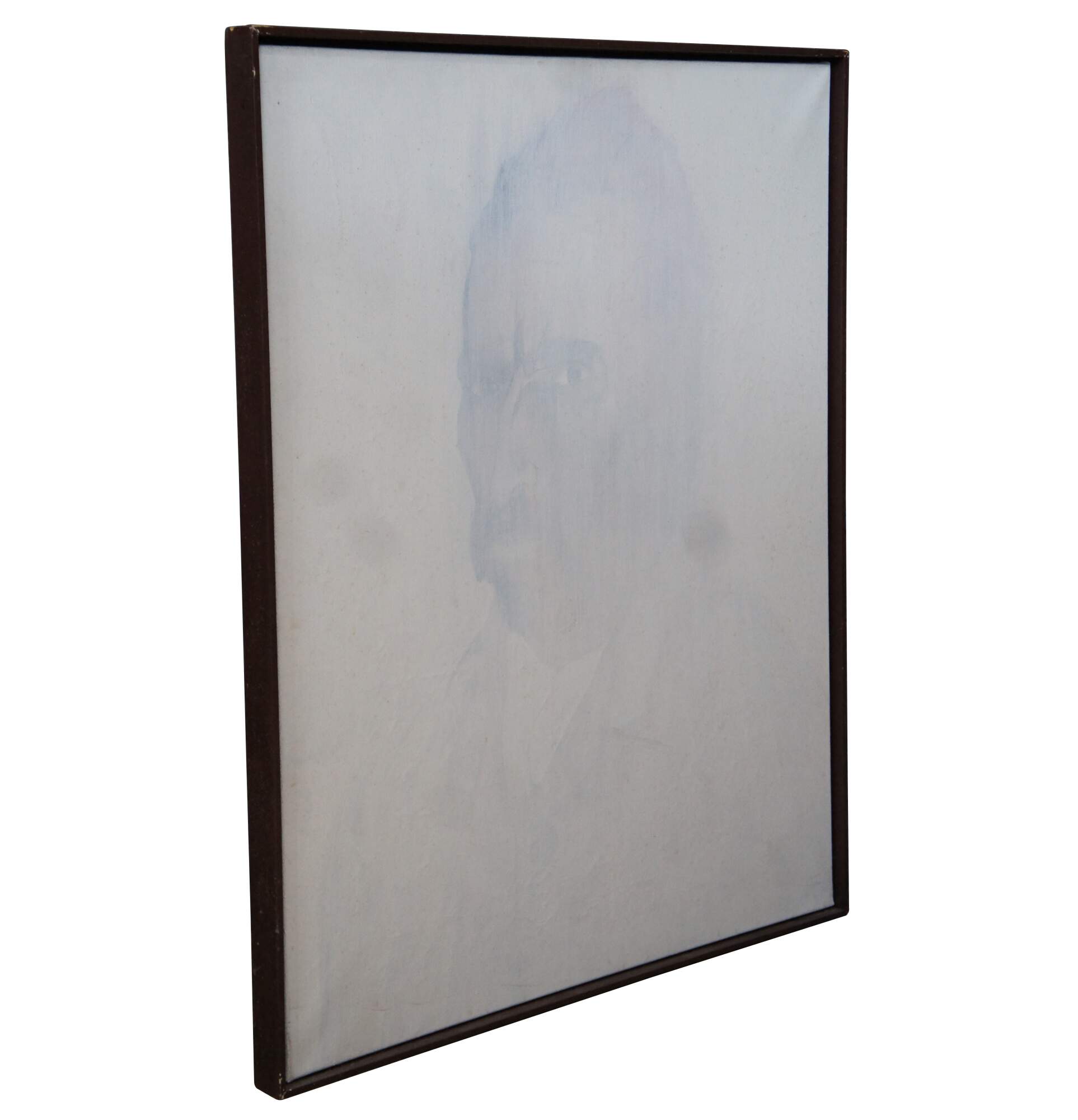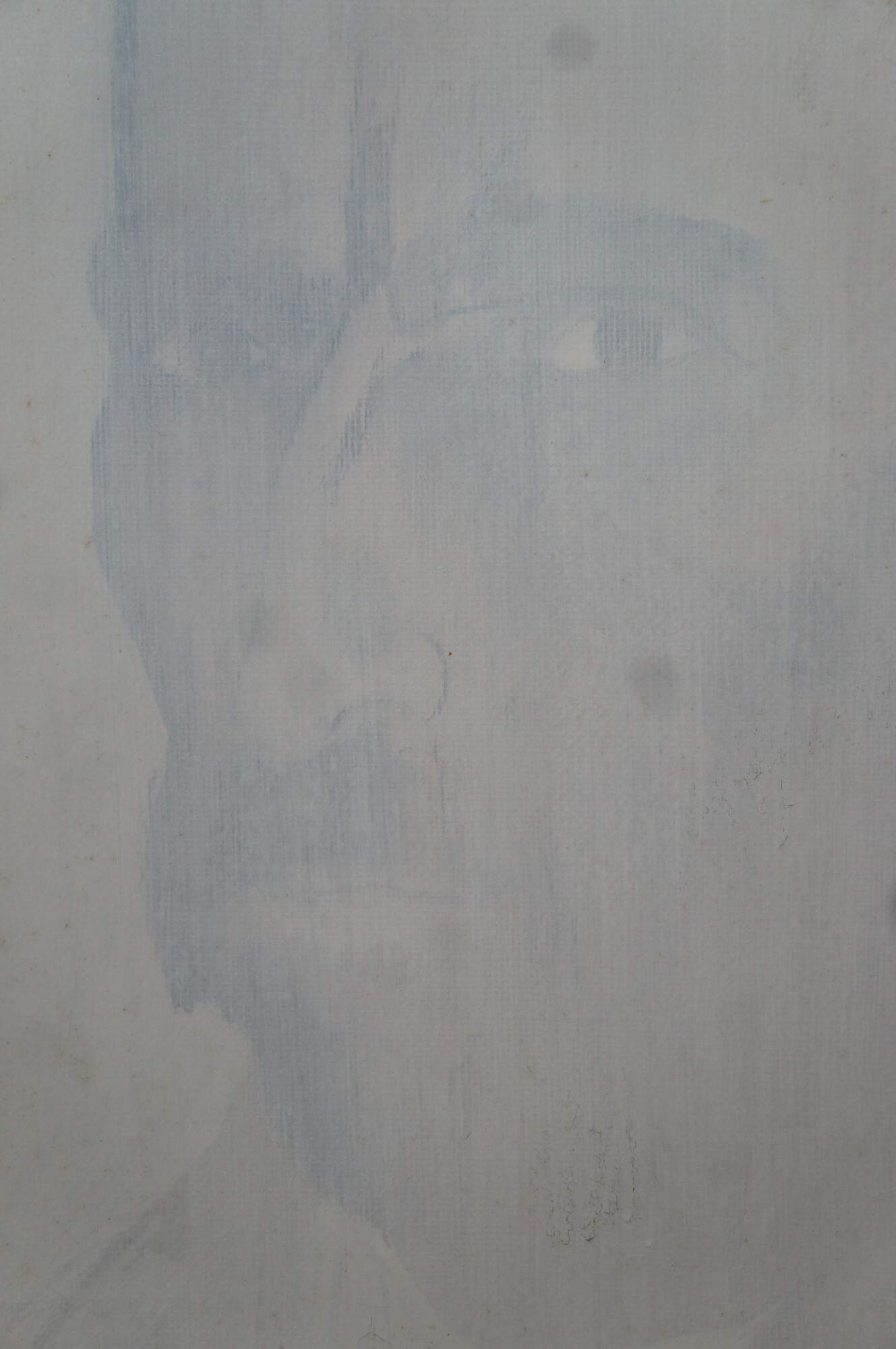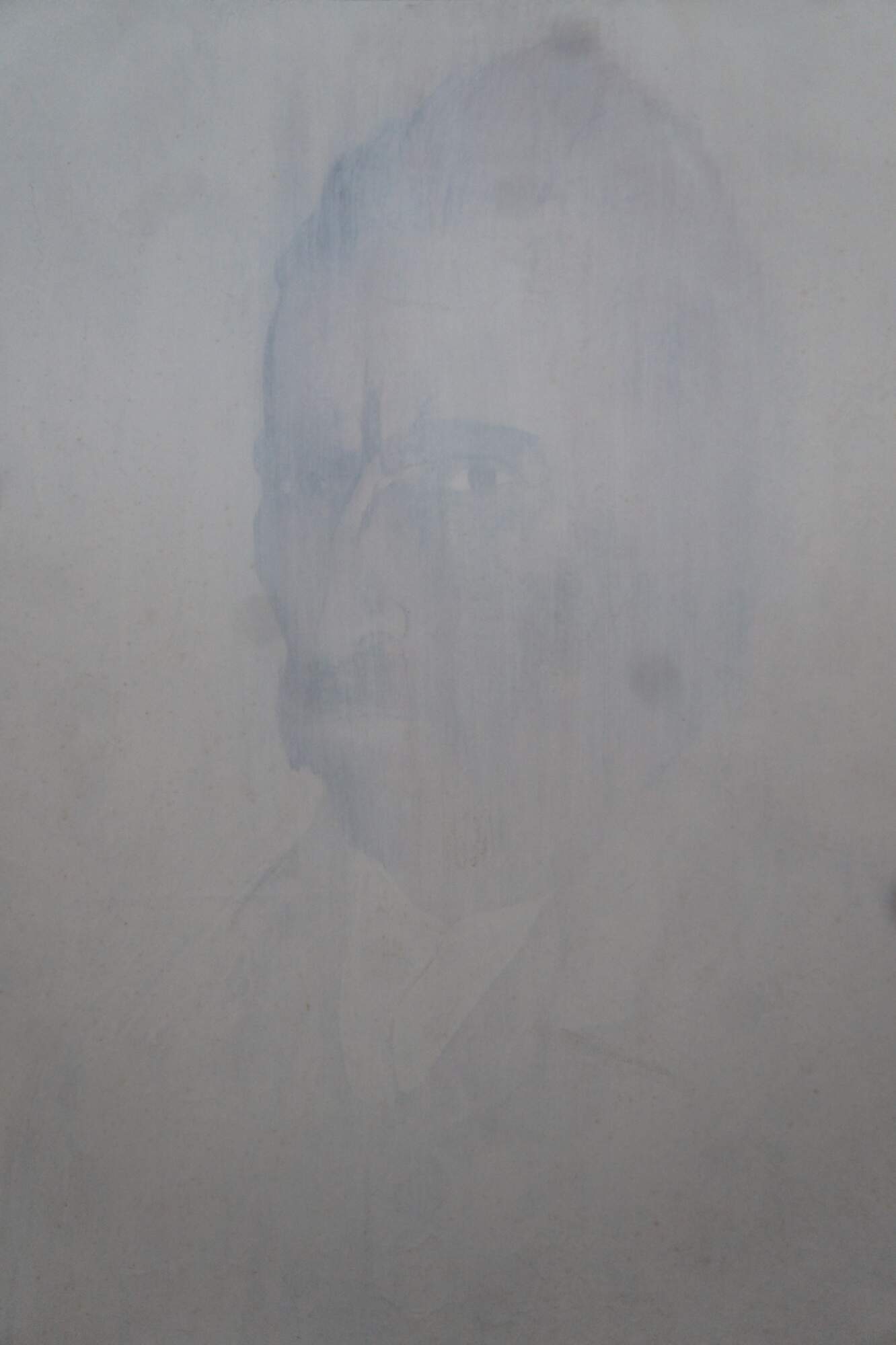 A unique modern portrait painting on burlap of Vincent van Gogh, with a white wash finish / overlay. Signed and dated by artist on verso.