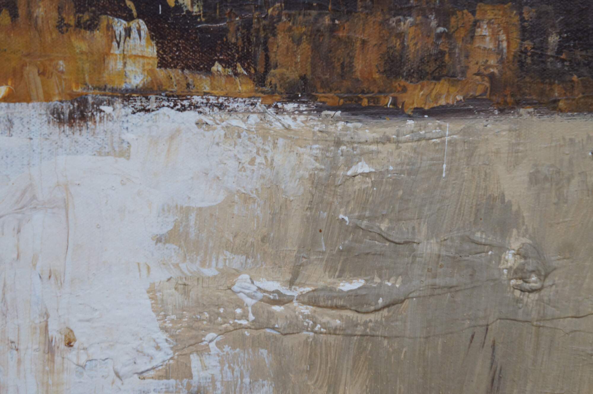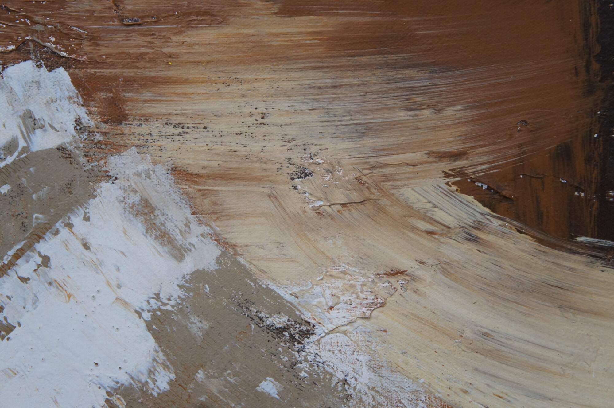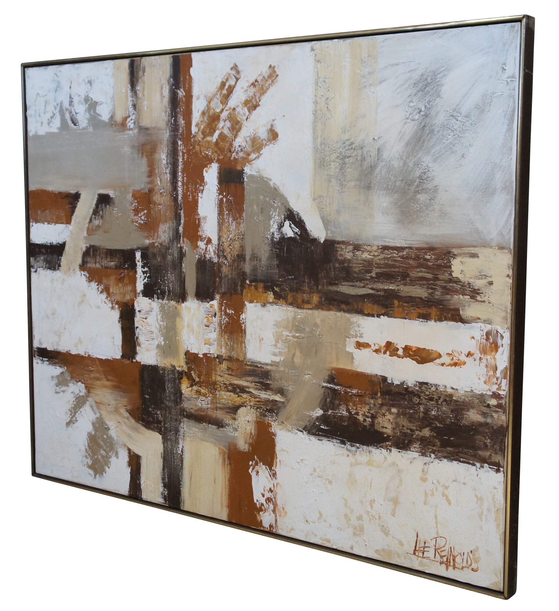 Large scale mid 20th century abstract oil painting on canvas signed Lee Reynolds, crafted in shades of brown and gray.