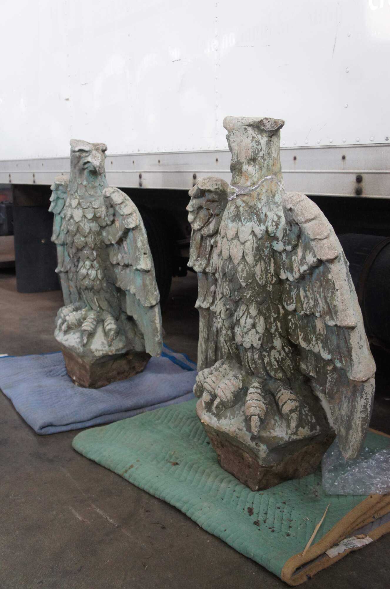 An impressive pair of early 20th century concrete / cast stone eagle sculptures. Lifelike in size with apposing faces, oustretched wings and large talons. The bases of the statues are tapered allowing them to inset into the ground nicely. Thes statues were originally mounted to the rooftop facade of an Indianapolis building.