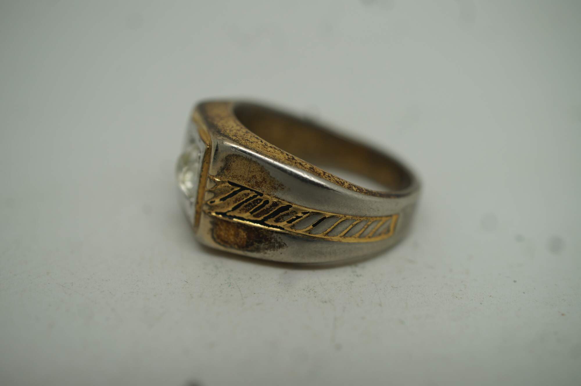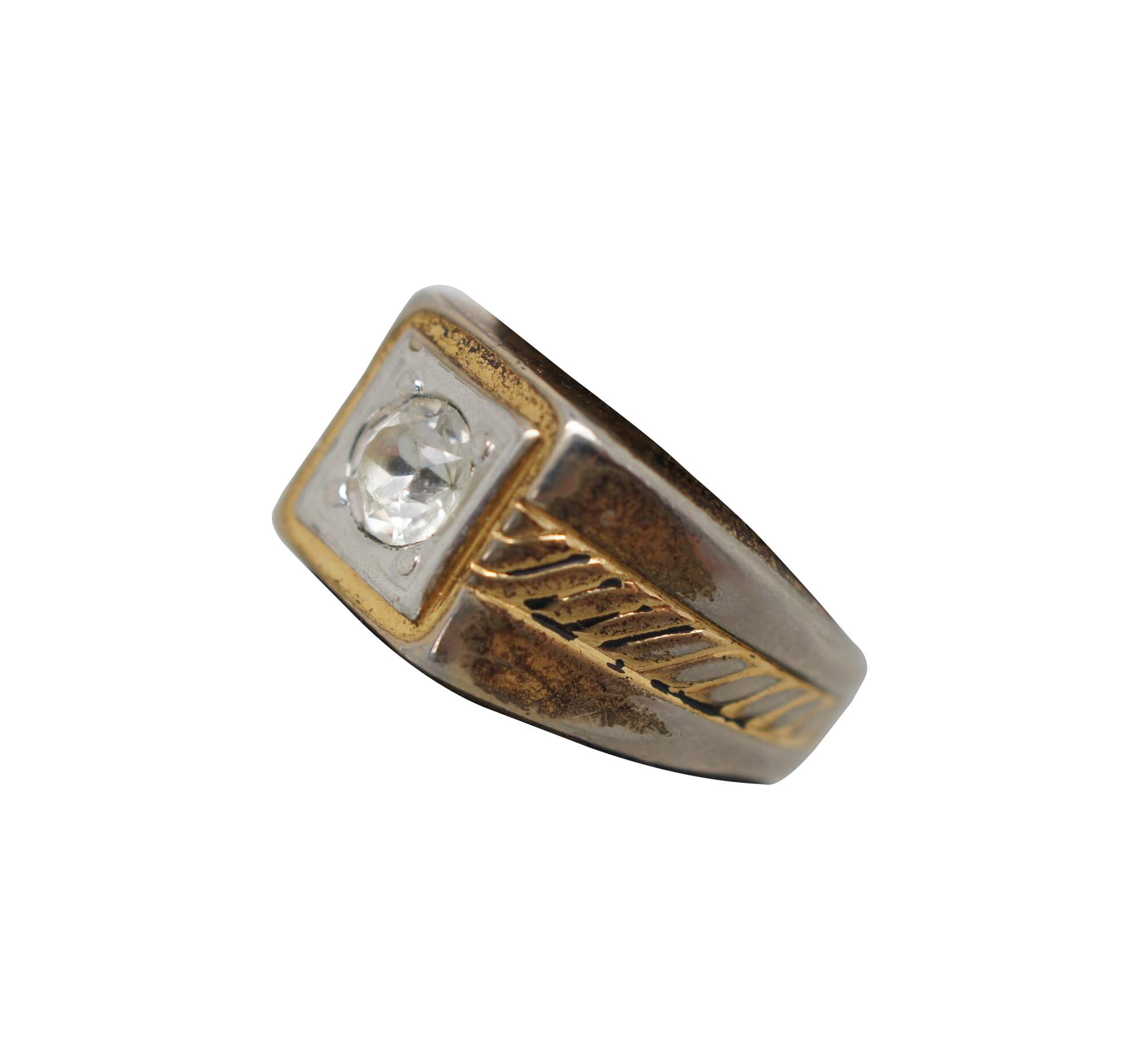 Vintage 14 karat gold filled signet style ring with white rhinestone setting and rope twist accent.