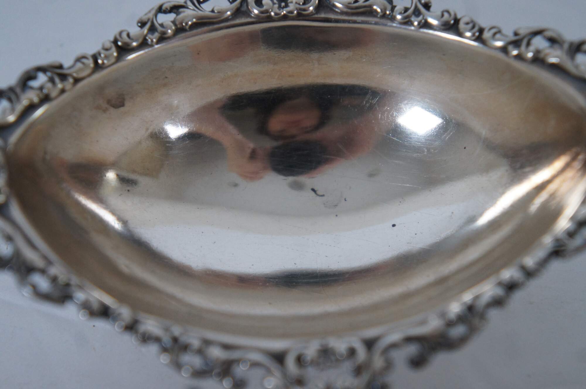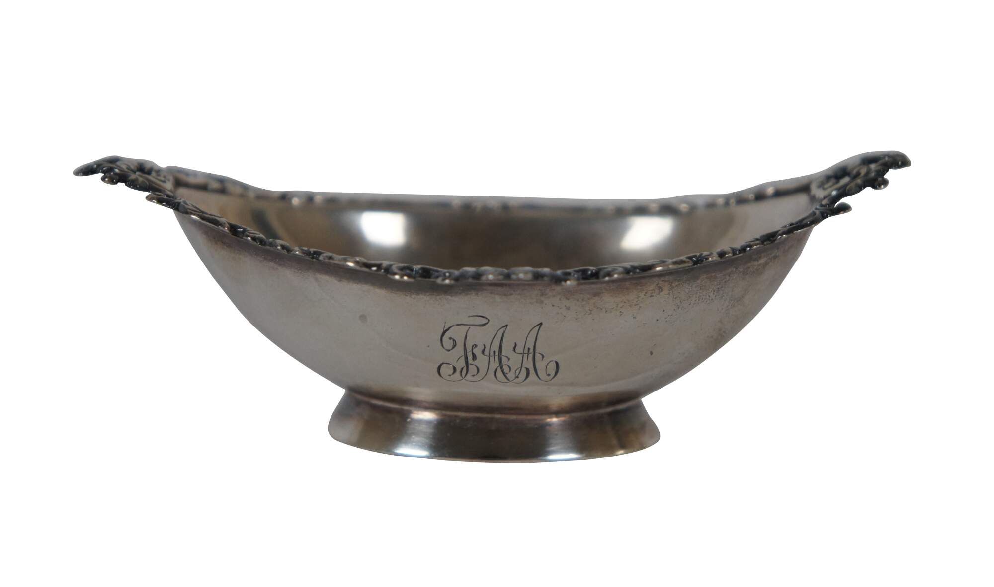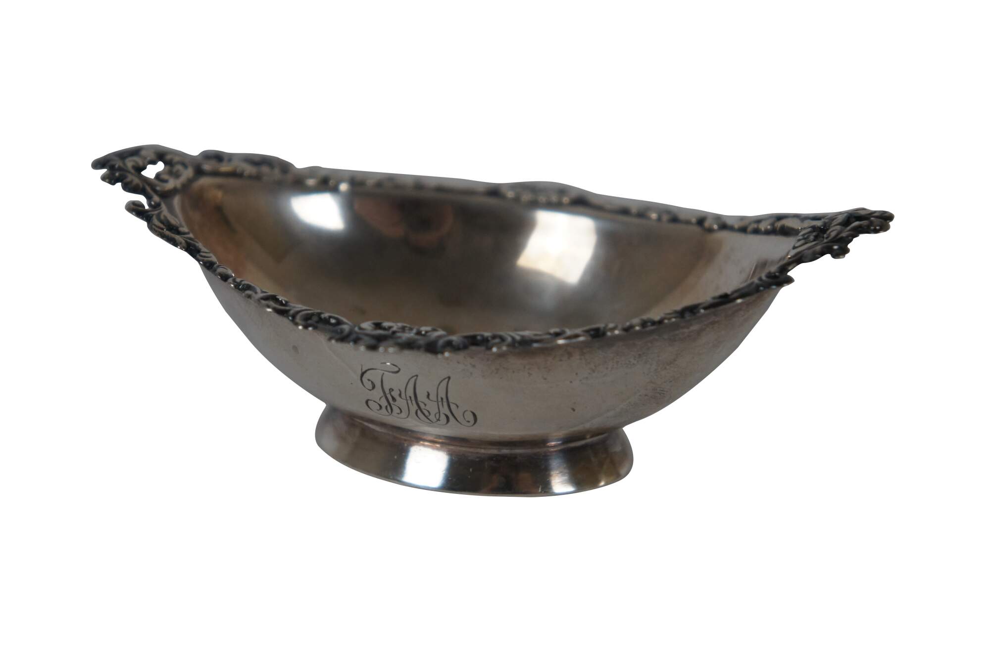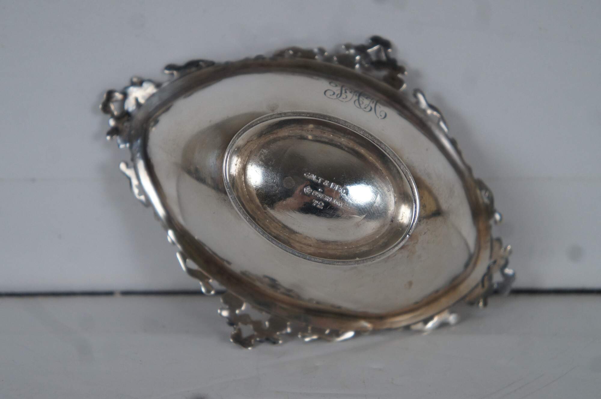 Antique Galt & Bro number 72 sterling silver nut / bone dish featuring an oval boat shape with foliate and floral pierced edge. Monogrammed with the initials FAA.