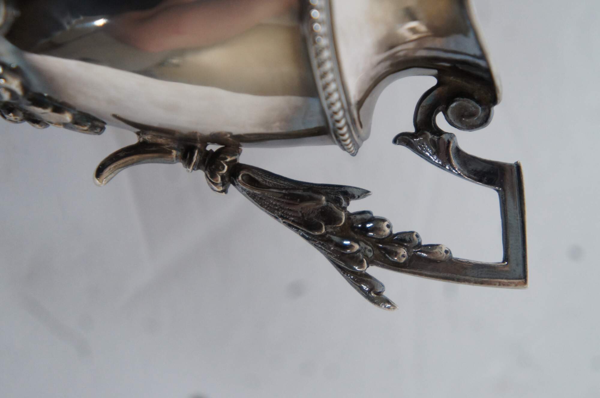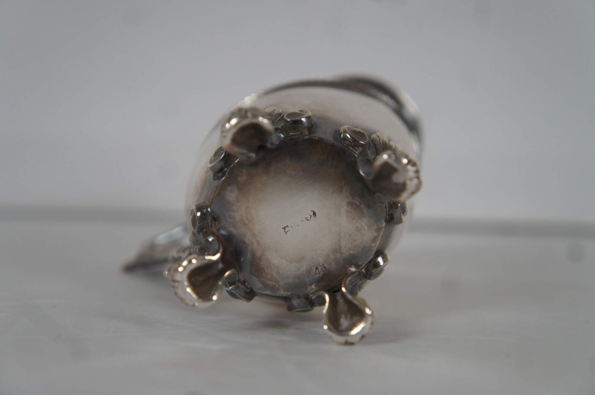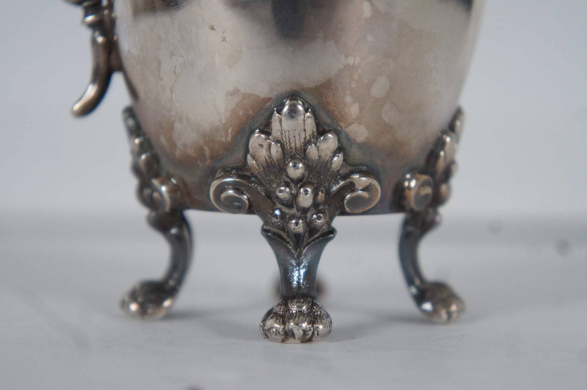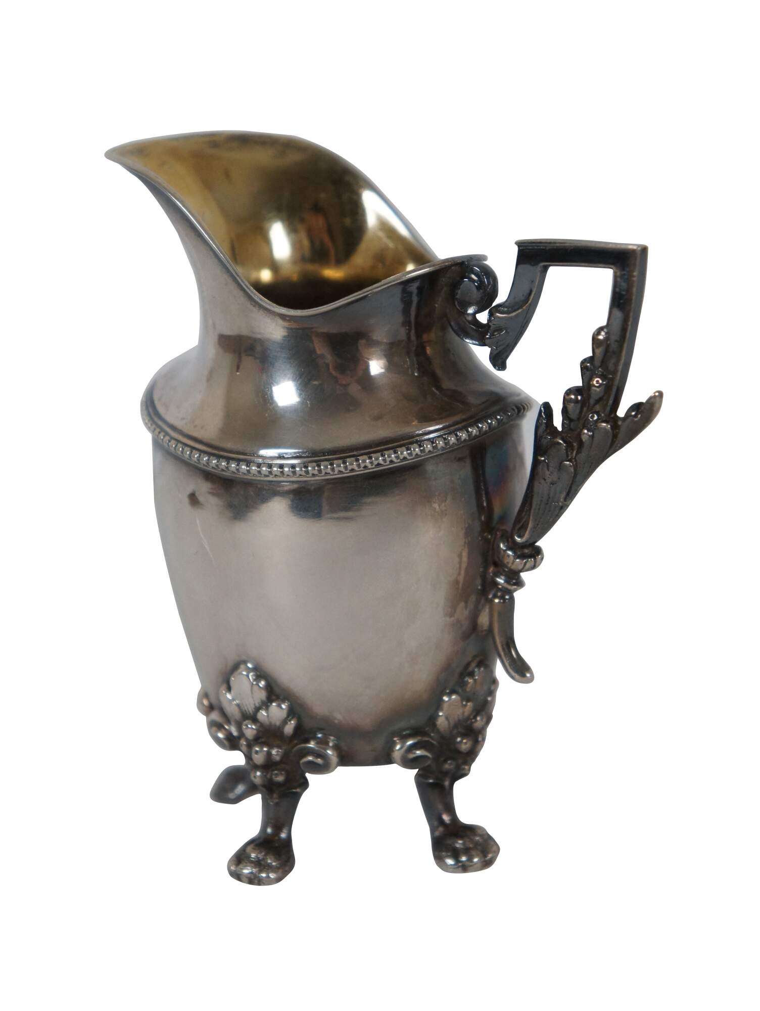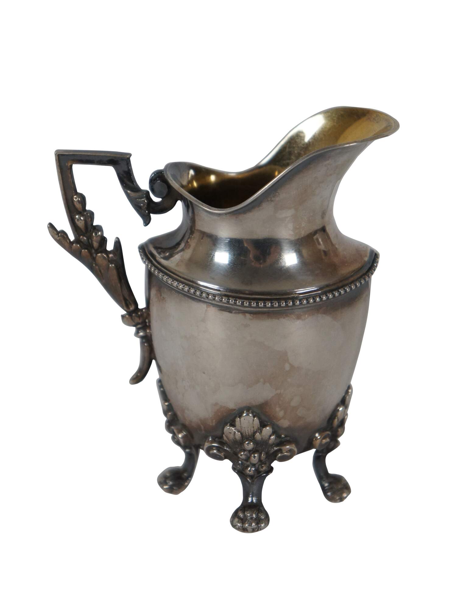 Antique Bruckmann & Sohne German 800 sterling silver cream pitcher/creamer, featuring beaded trim, squared off handle, paw feet, and a leaf and berry motif.
