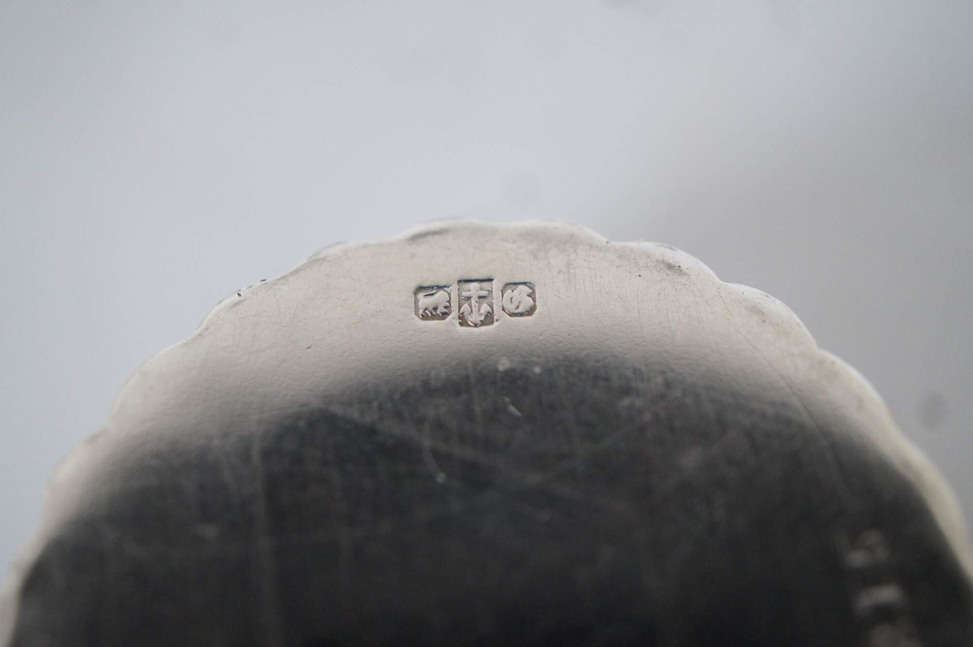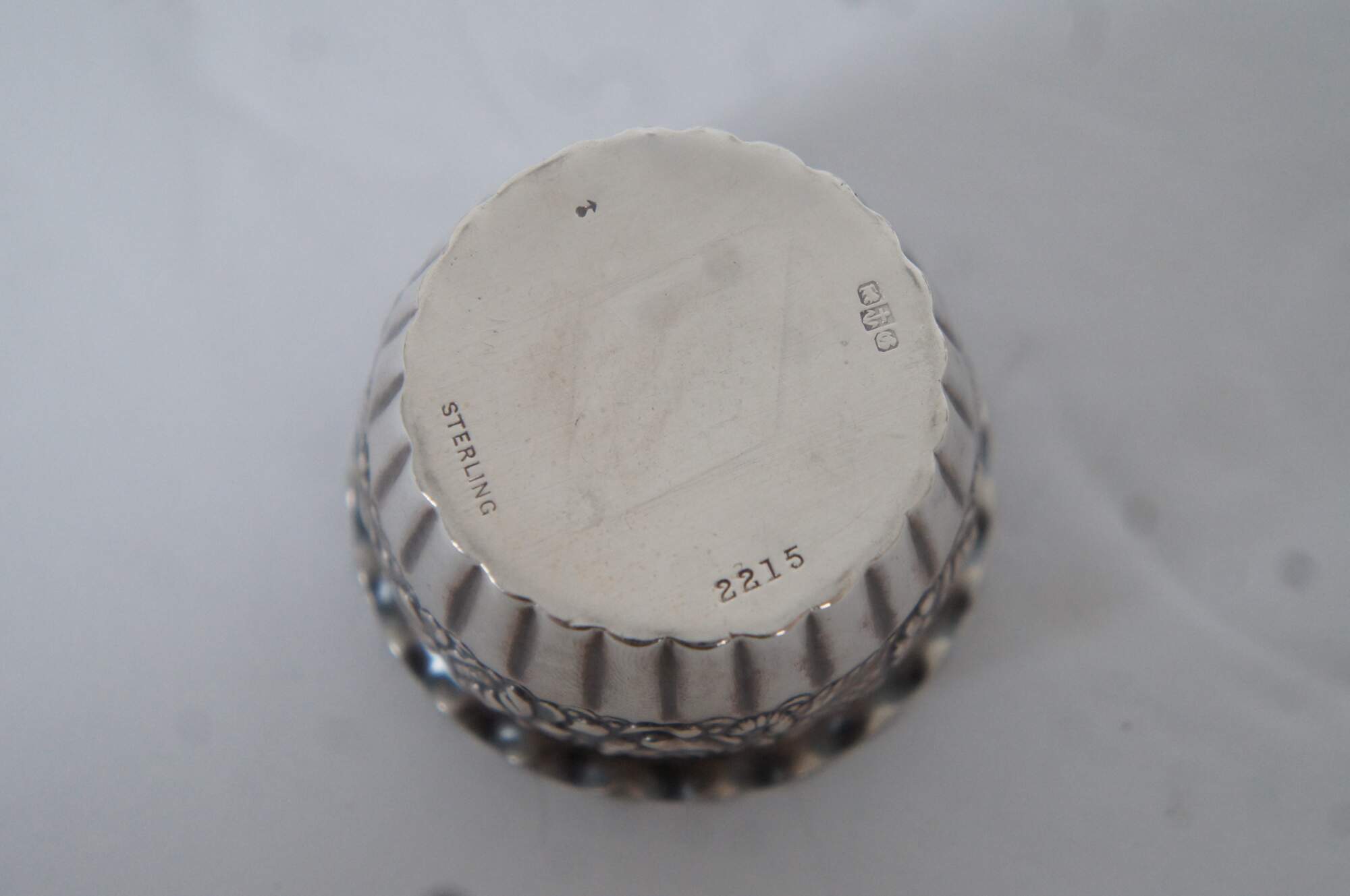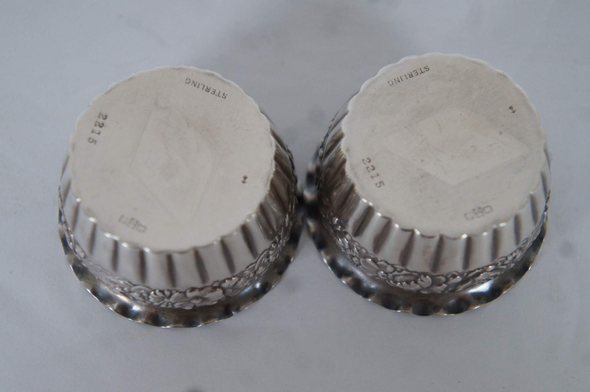 Pair of antique Victorian era Gorham number 2215 repousse sterling silver salt cellars featuring a round tapered form, rippling scalloped upper edge, and a band of flowers. Manufactured in 1894, according to arrow shaped date mark.