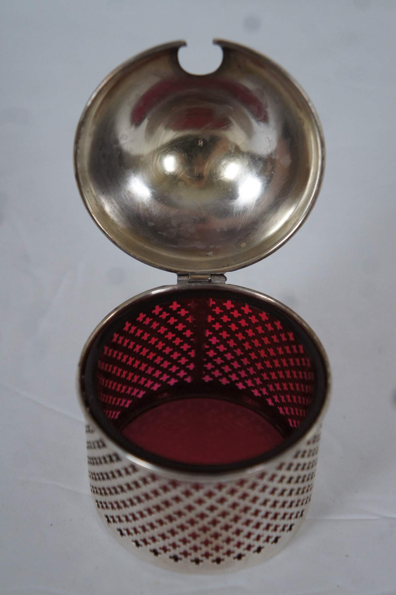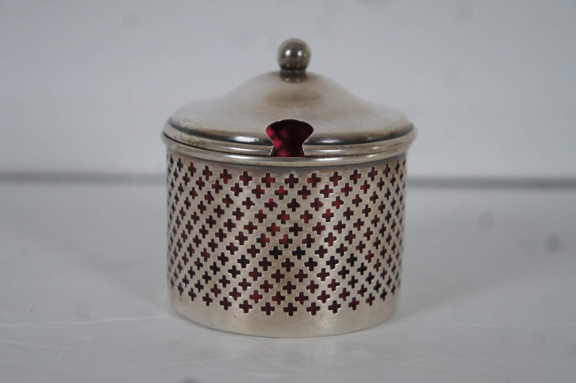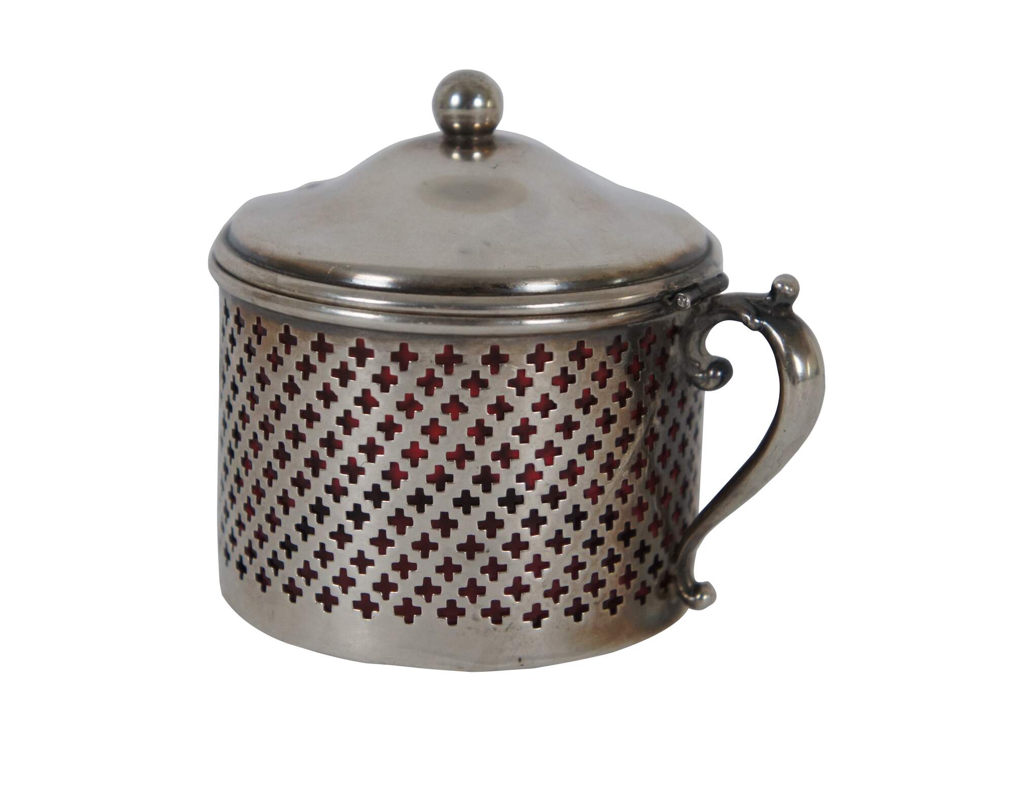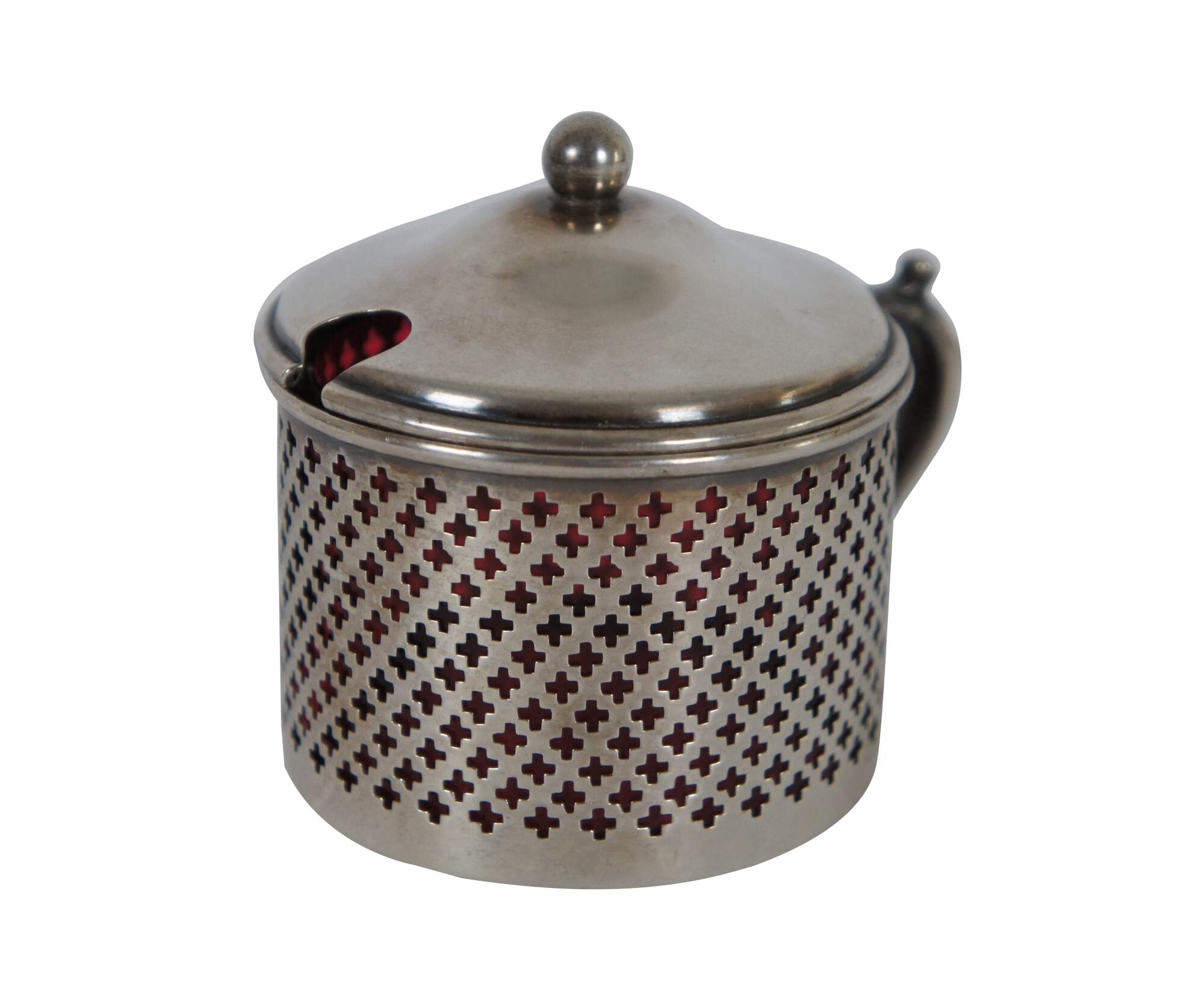 Antique Whiting number 3534 sterling silver lidded jam / mustard / condiment pot with cranberry glass insert. Handled overlay features reticulated cross sides and a ball finial on the lid. No monogram.