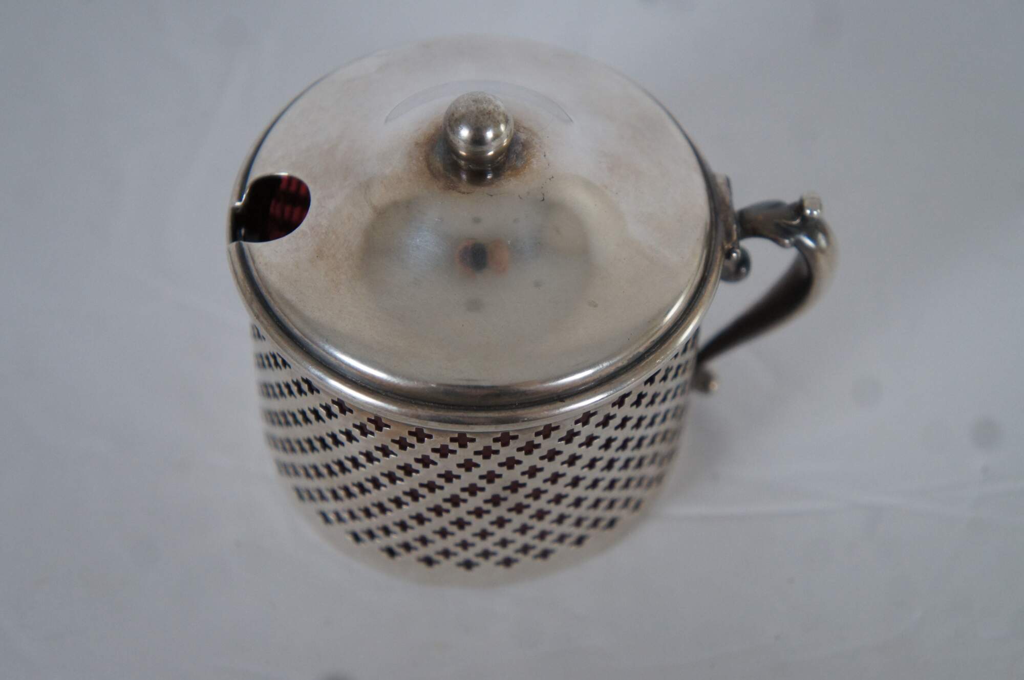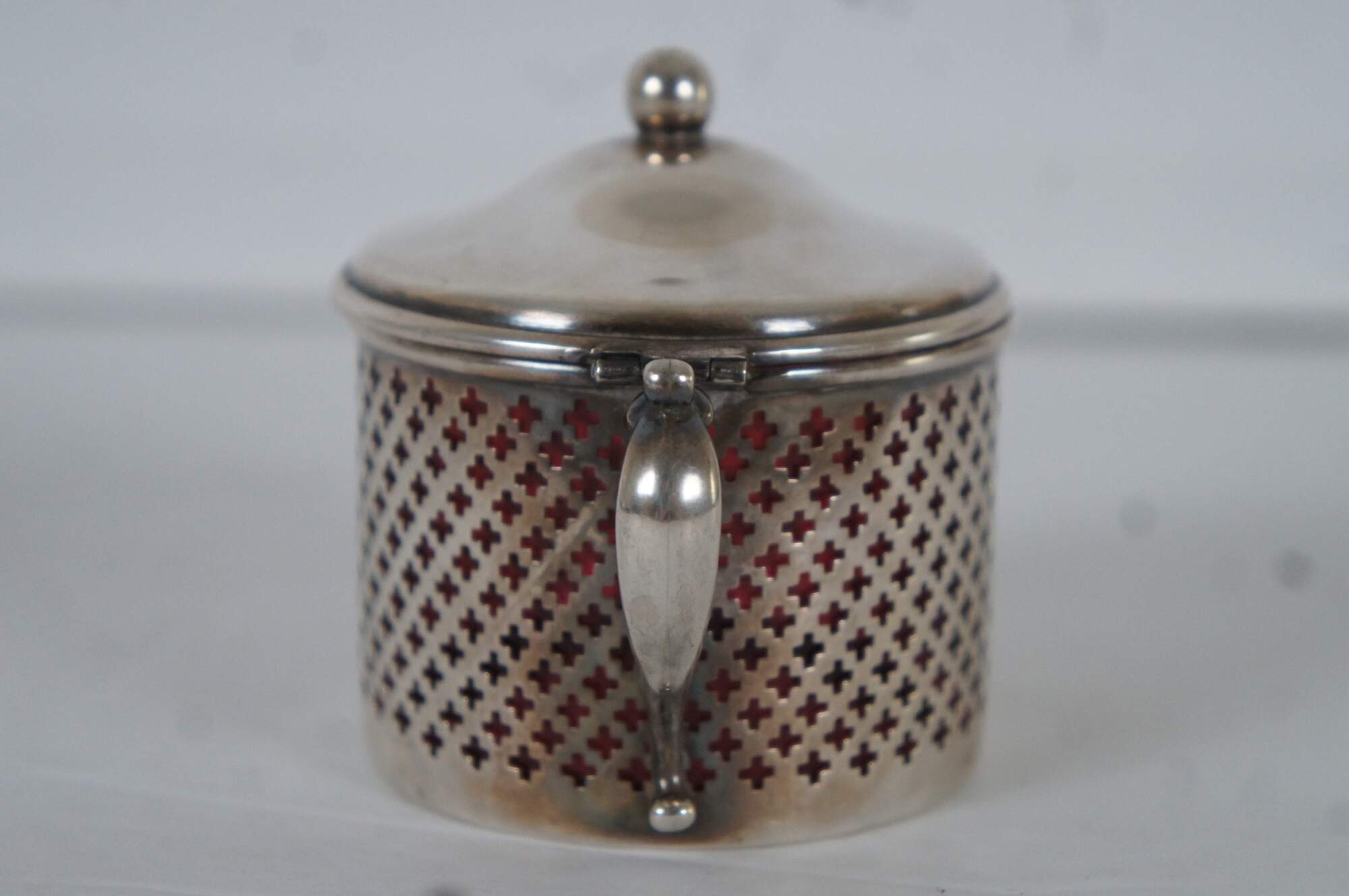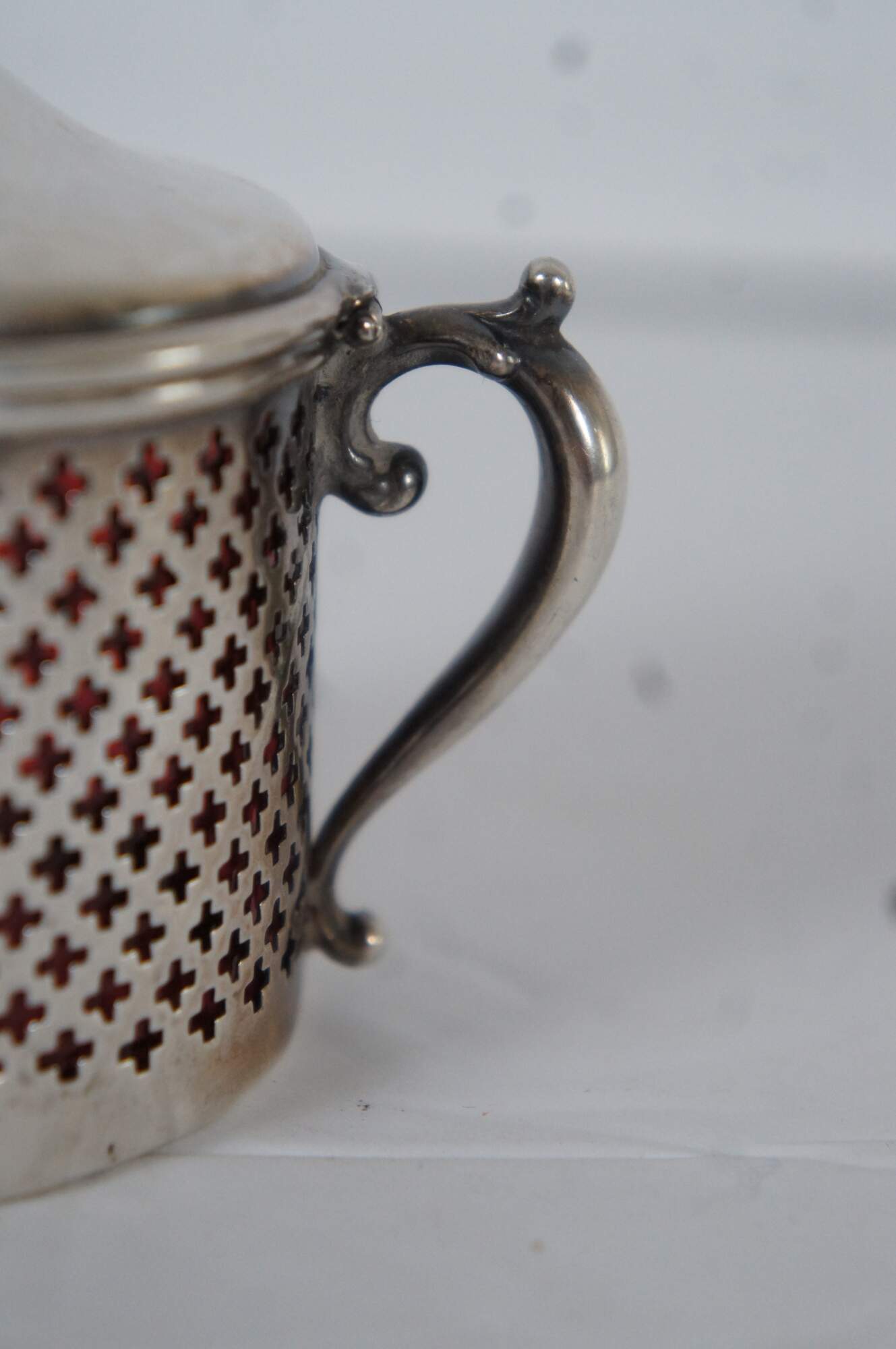 Antique Whiting number 3534 sterling silver lidded jam / mustard / condiment pot with cranberry glass insert. Handled overlay features reticulated cross sides and a ball finial on the lid. No monogram.