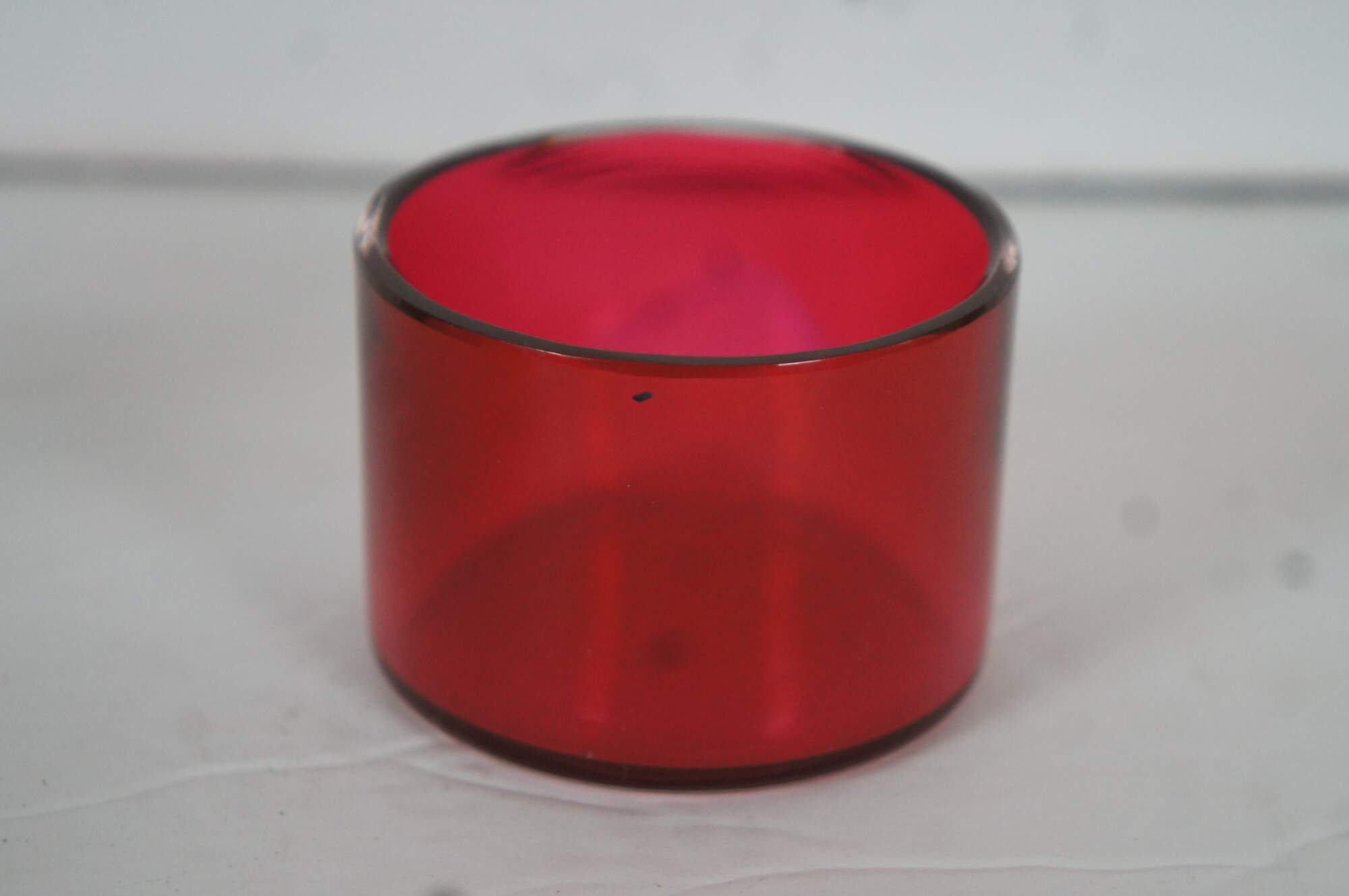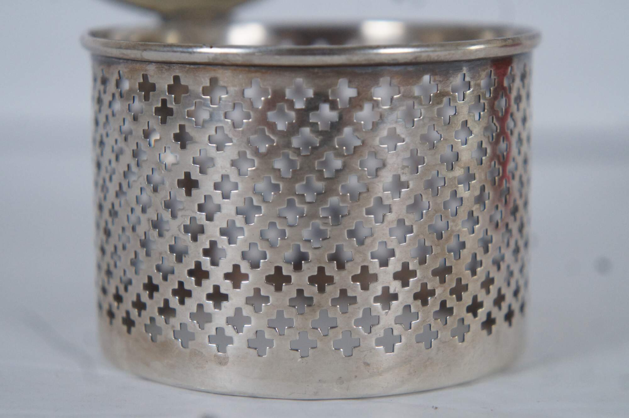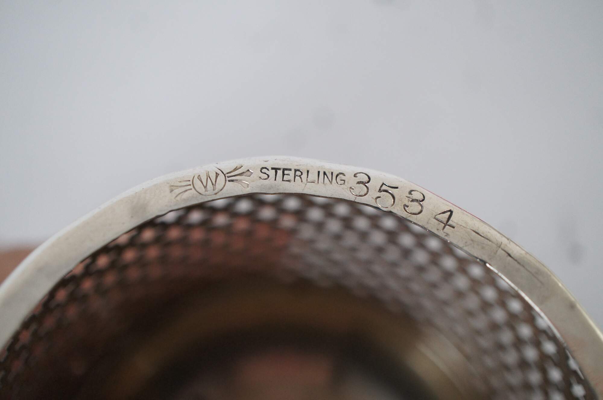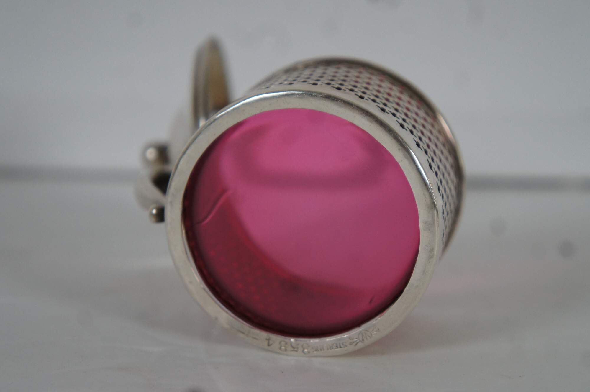 Antique Whiting number 3534 sterling silver lidded jam / mustard / condiment pot with cranberry glass insert. Handled overlay features reticulated cross sides and a ball finial on the lid. No monogram.