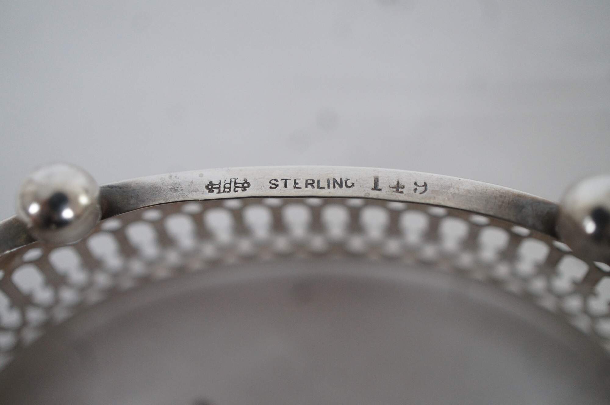 Early 20th century George A. Henckel & Company number 149 sterling silver oval salt cellar / nut / bonbon dish with pierced sides, space for a monogram, ball feet, and cobalt glass insert.