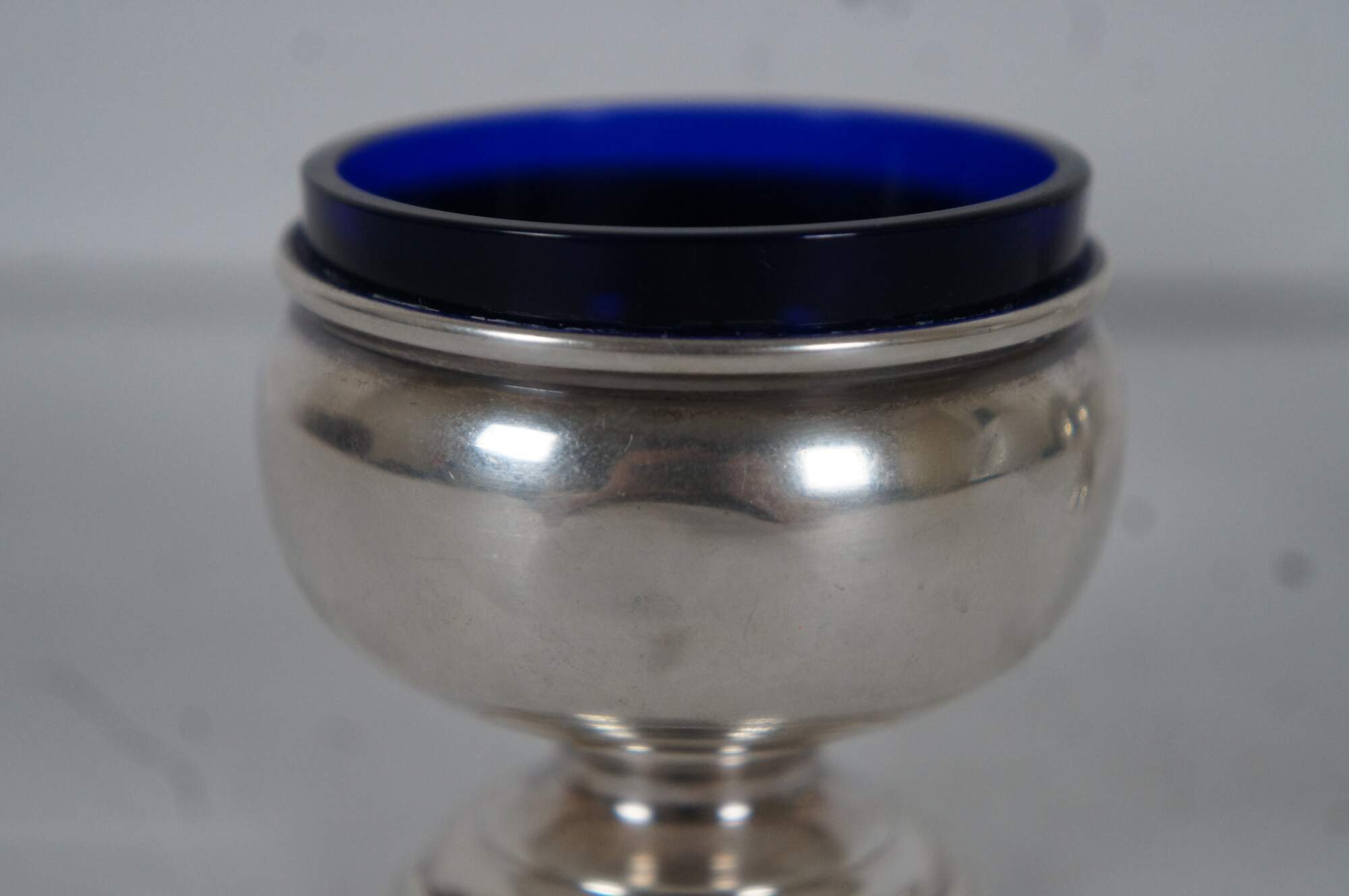 Late 1940s / mid 20th century Dunkirk Silversmiths number 10B sterling silver footed salt cellars with cobalt glass inserts. Inserts likely not original – one not flush, both stuck.