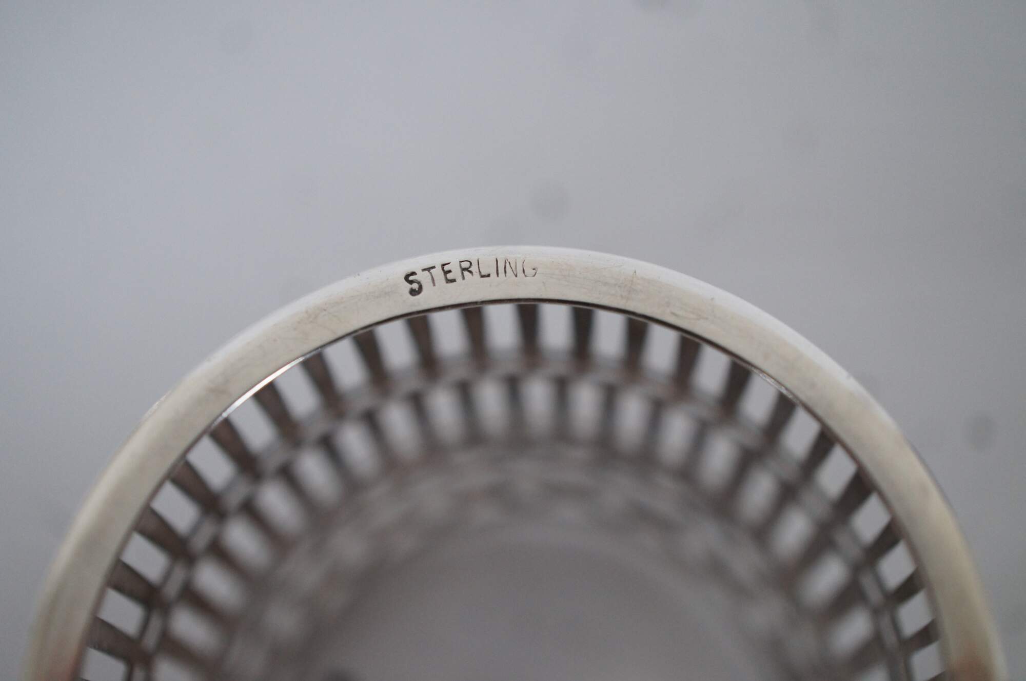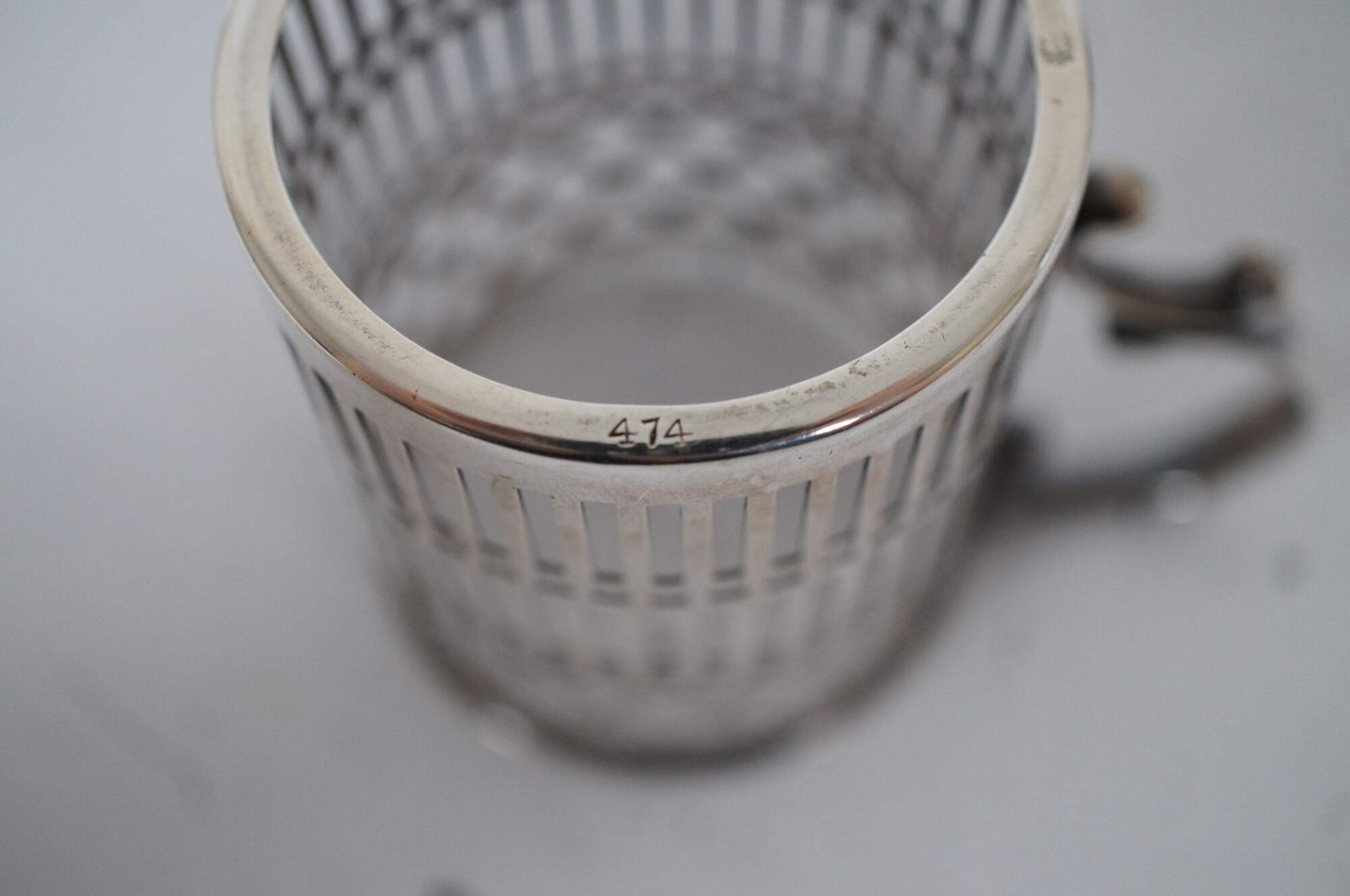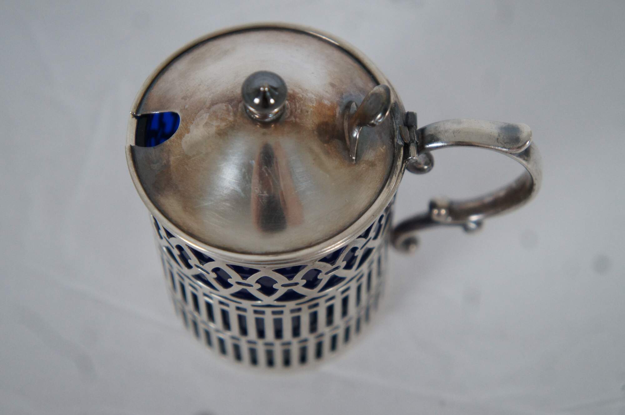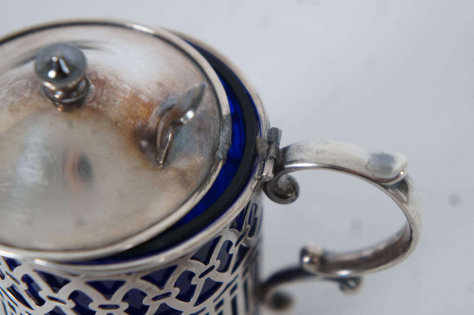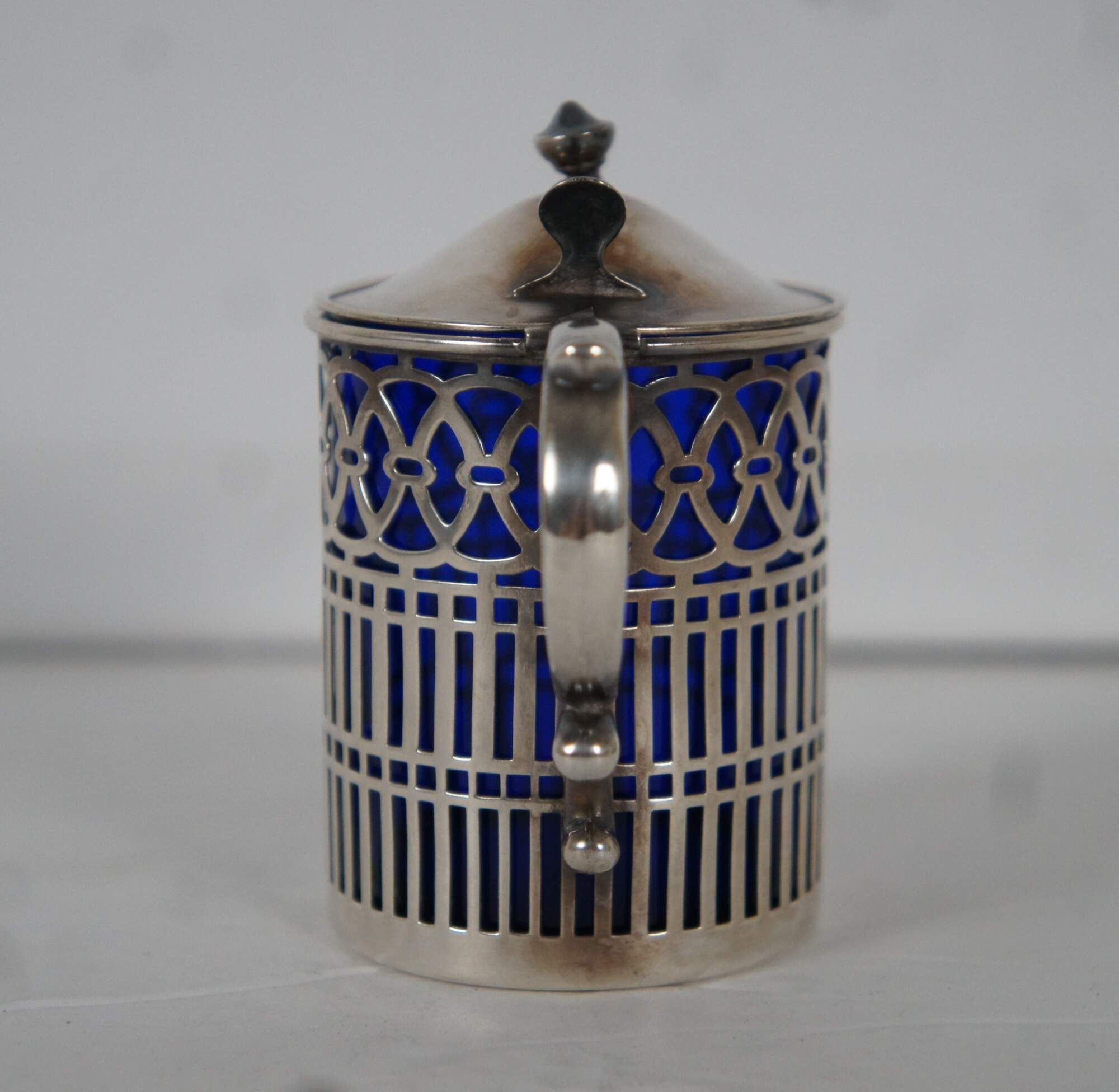 Antique early 20th century Watson for Wilcox & Wagoner number 474 lidded sterling silver jam / mustard / condiment pot featuring pierced sides, scrolled handle, vase shaped finial and cobalt glass insert.