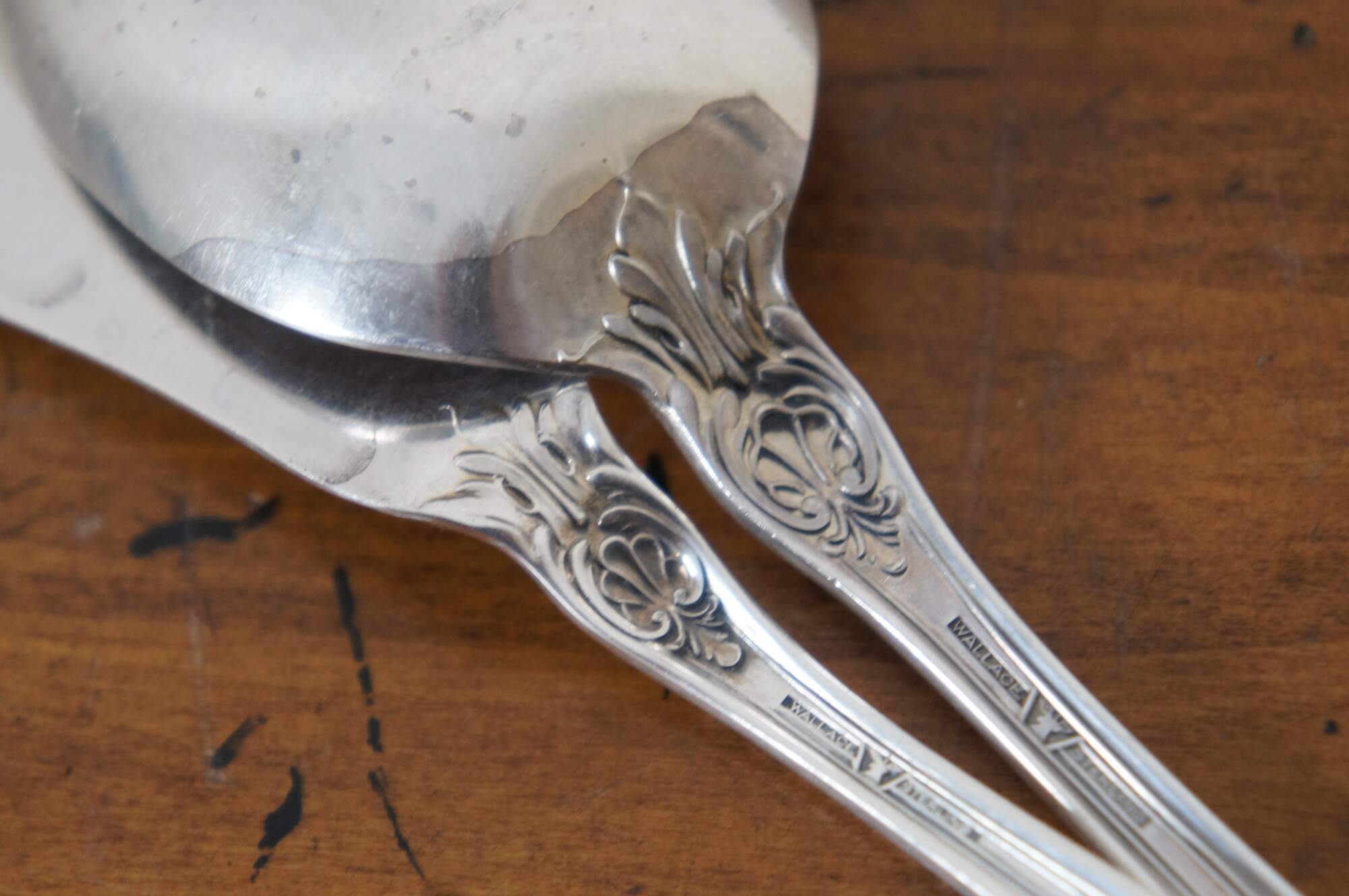 Antique early 20th century Wallace Sterling silver serving spoon and master butter knife pair in the Sir Christopher pattern (patented in 1936) with a rose below the foliate and scallop shell motif.