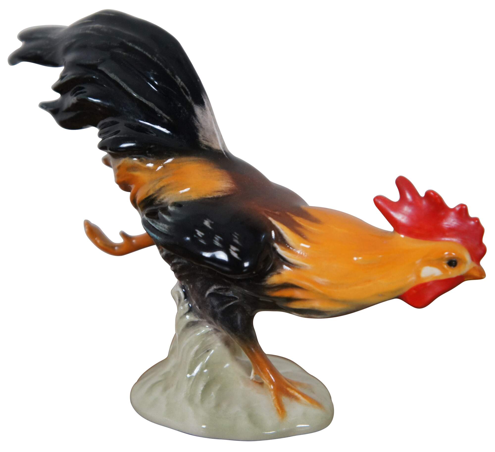 Vintage 1970s Goebel porcelain figurine of a running rooster / gockel. Sticker label on base reads W. Goebel - Haushahn - Rooster - Coq. Incised with product number CV 60. Stamped with the TMK-5 Last Bee Mark, circa 1972-1979.