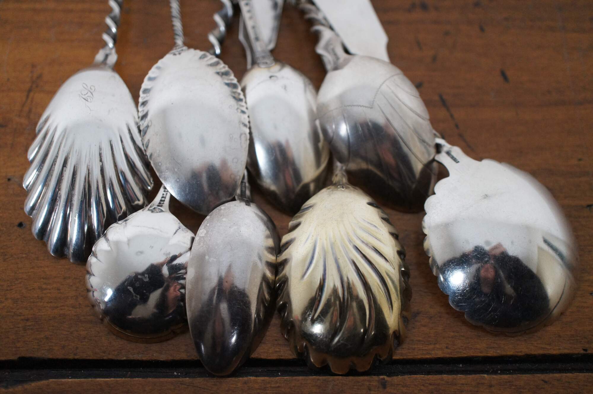 Lot of 10 antique sterling and one 800 silver sugar / tea spoons in a variety of styles and designs including shell bowls, twisted handles, floral motifs and one enameled. Makers include Whiting Mfg Co, Towle Sterling, William B Kerr & Co, Davis & Galt, William B. Durgin, Manchester Mfg Co, and Bruckmann & Sohne.