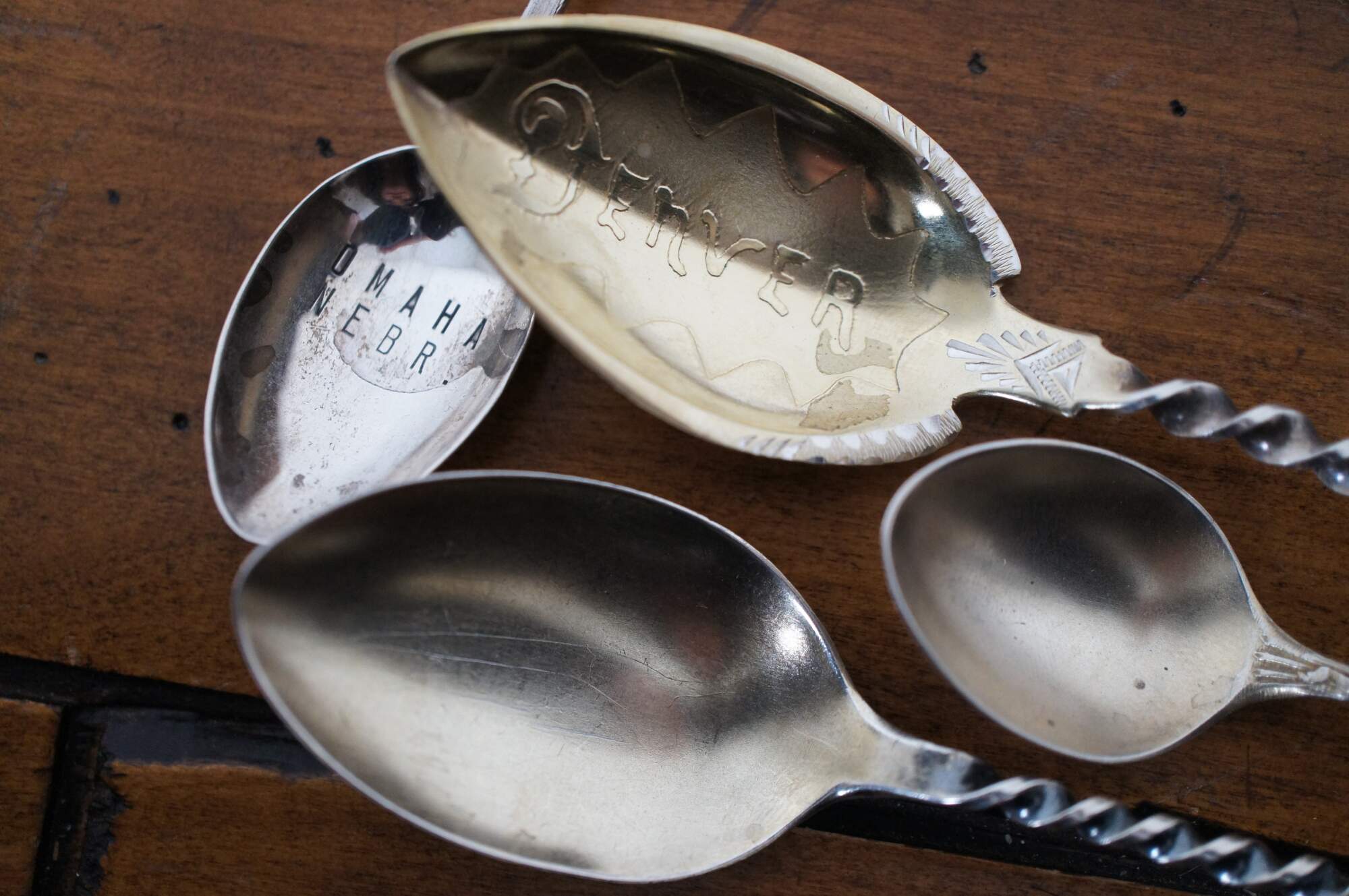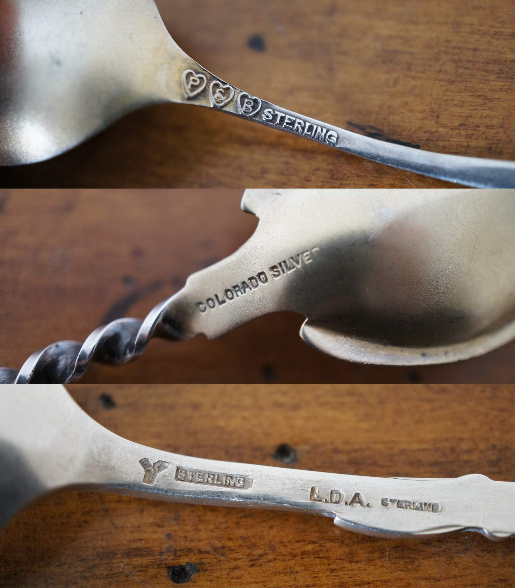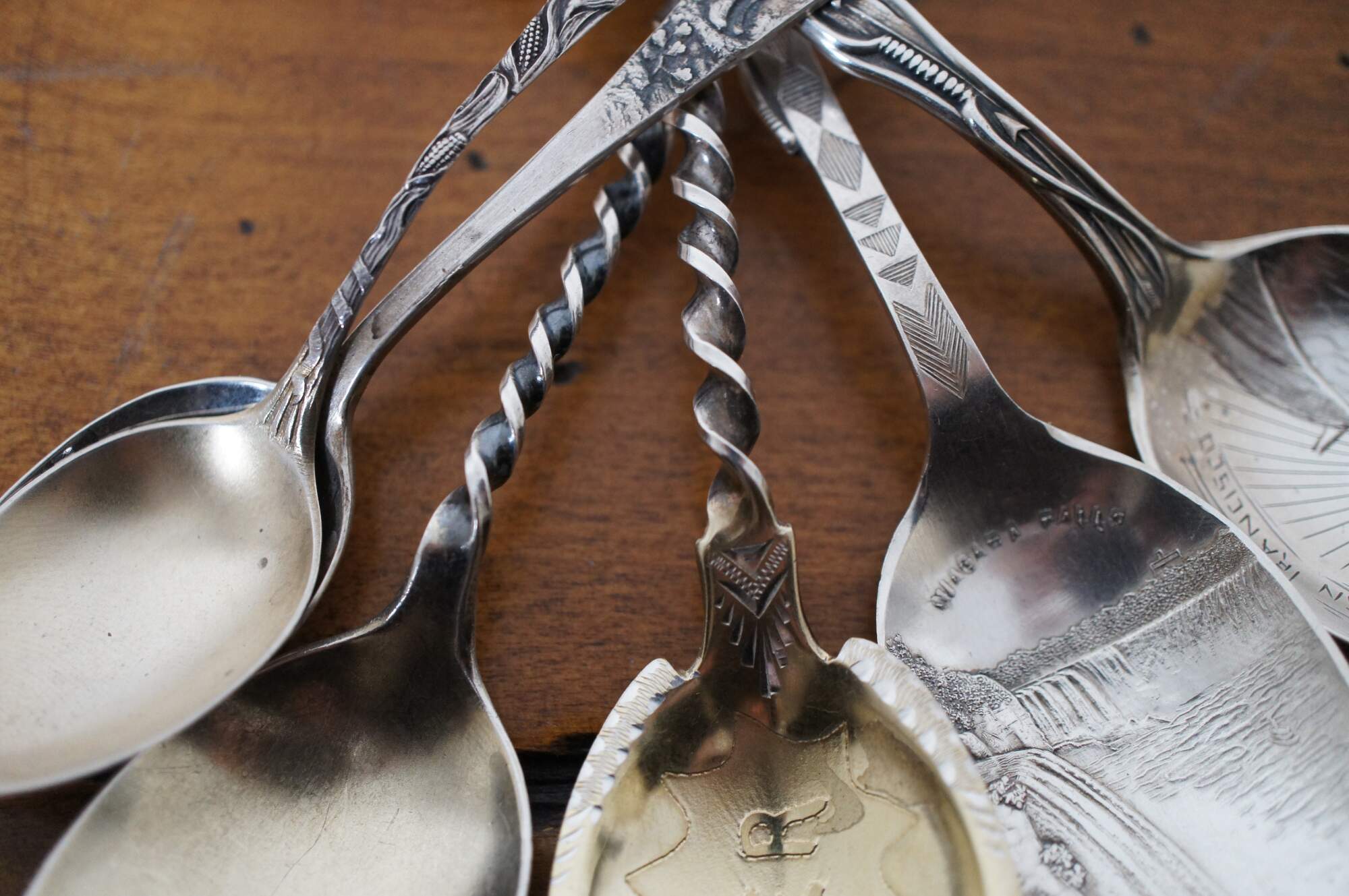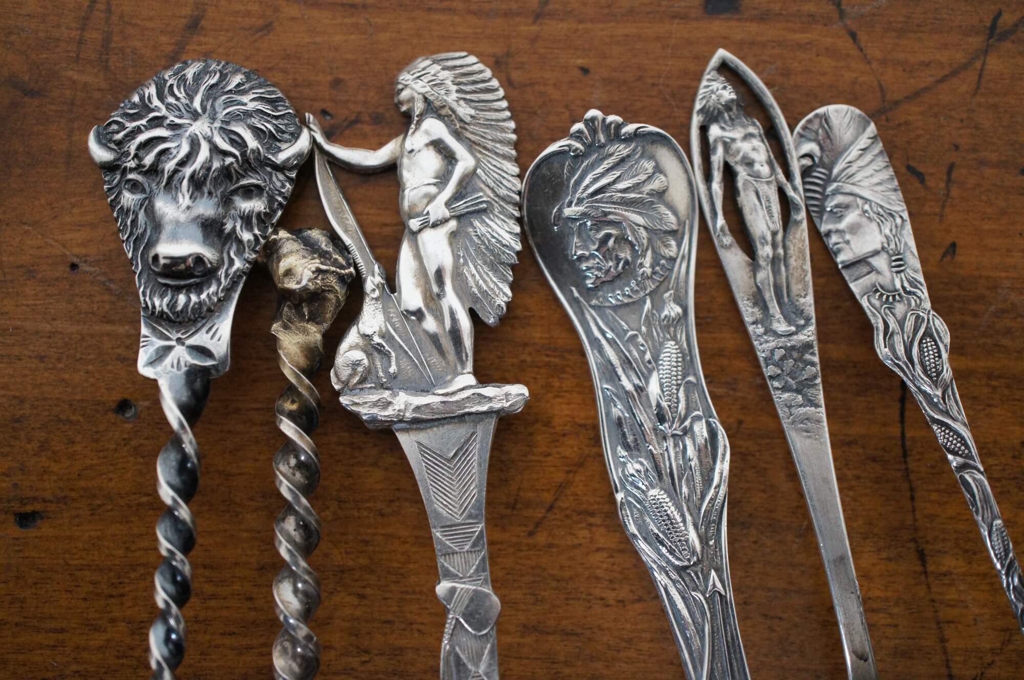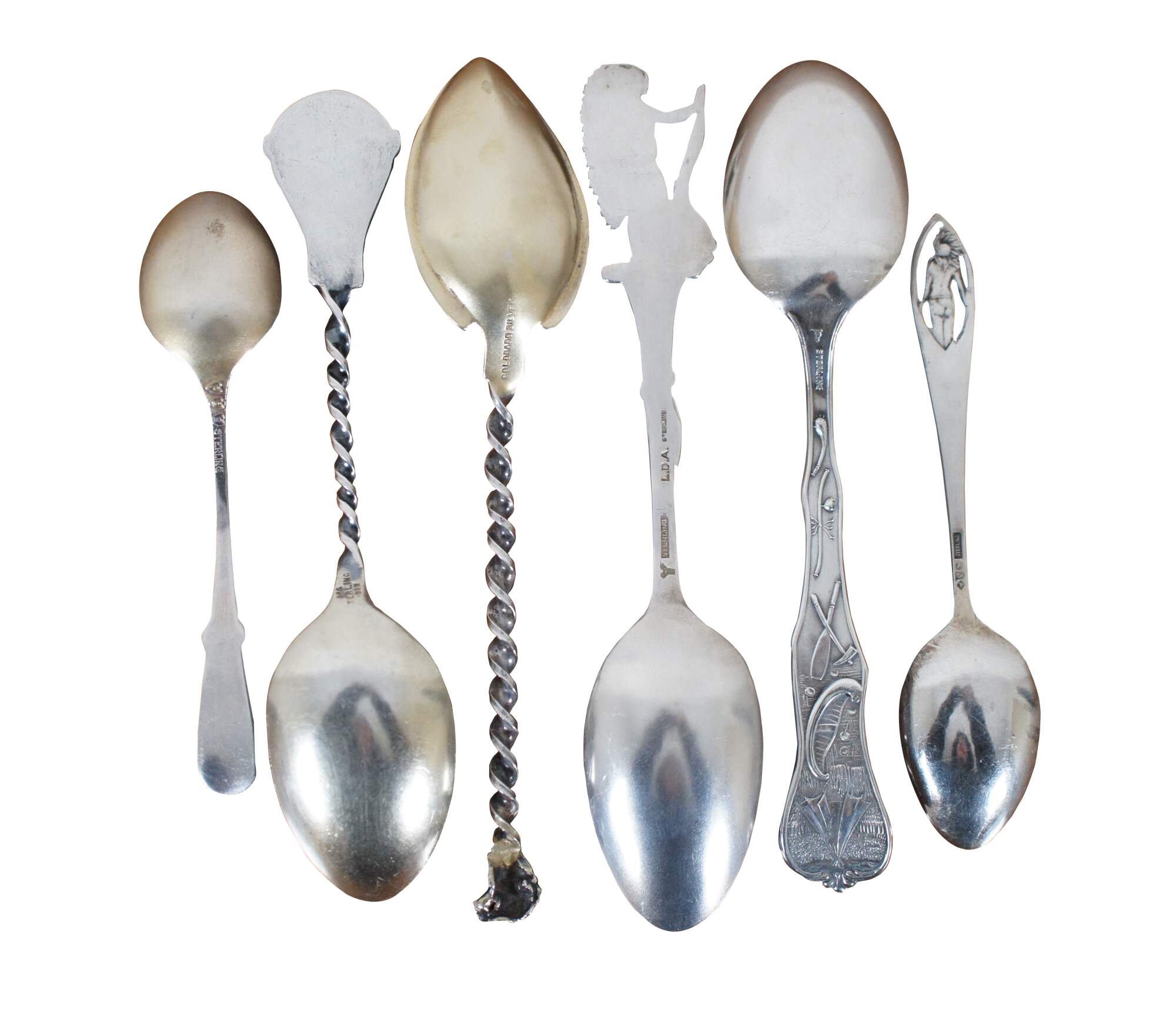 Lot of 6 antique / vintage sterling silver Western souvenir spoons featuring Native American figures / motifs. Makers include Paye & Baker, Colorado Silver, Lunt Silversmiths, Mechanics Silver Co, and Charles M. Robbins.