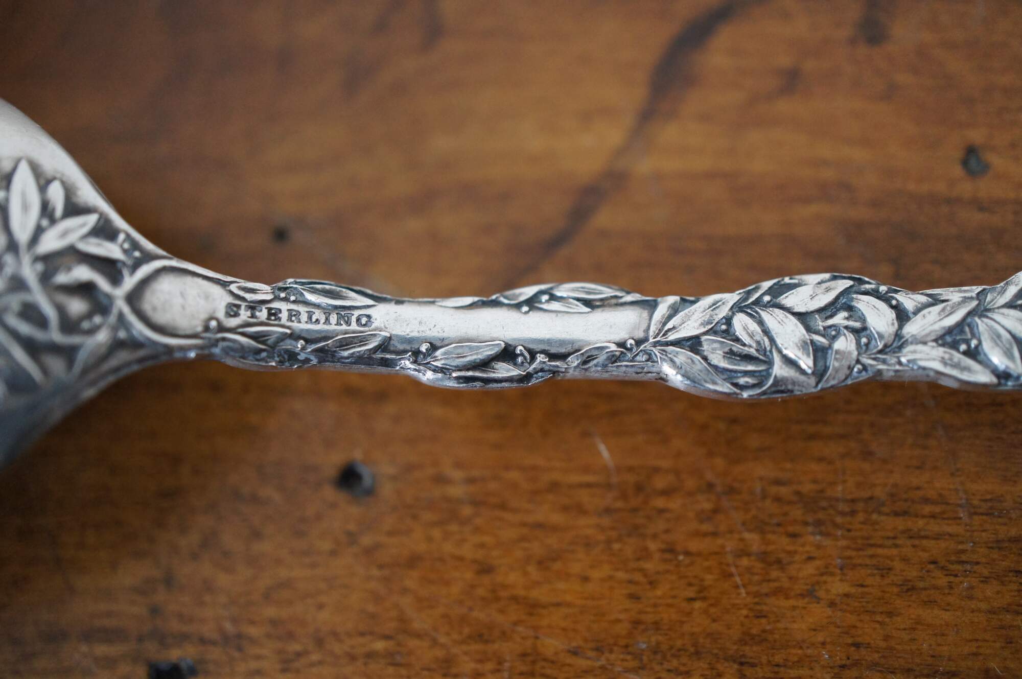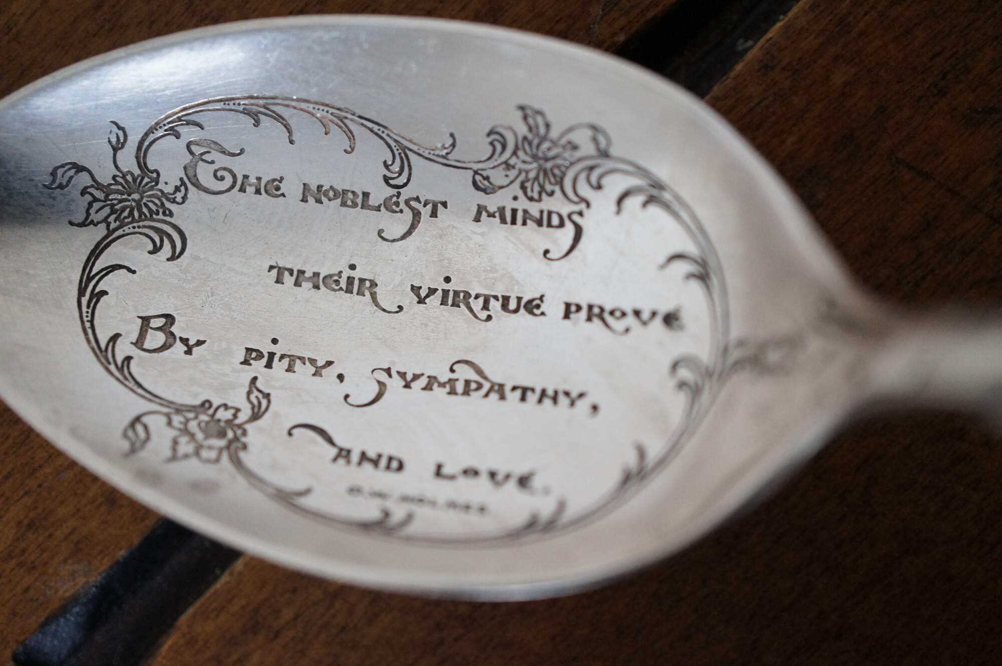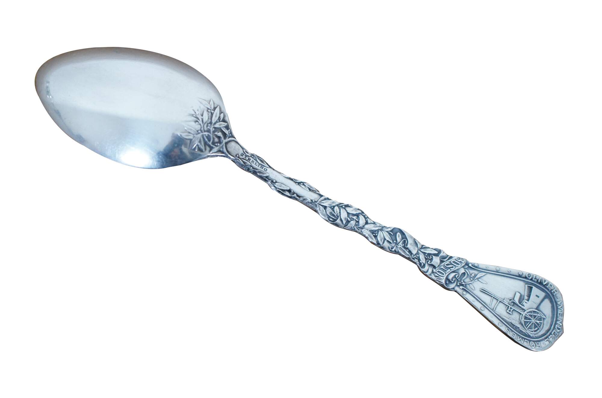 Rare antique sterling silver souvenir tea spoon featuring the portrait of Oliver Wendell Holmes, The Autocrat of the Breakfast Table (Boston) on a ribbon around the handle, leading down to the bowl engraved with the quotation “The noblest minds their virtue prove by pity, sympathy and love.” The reverse displays his name surrounding a small buggy, above the word Boston and a trail of mistletoe.