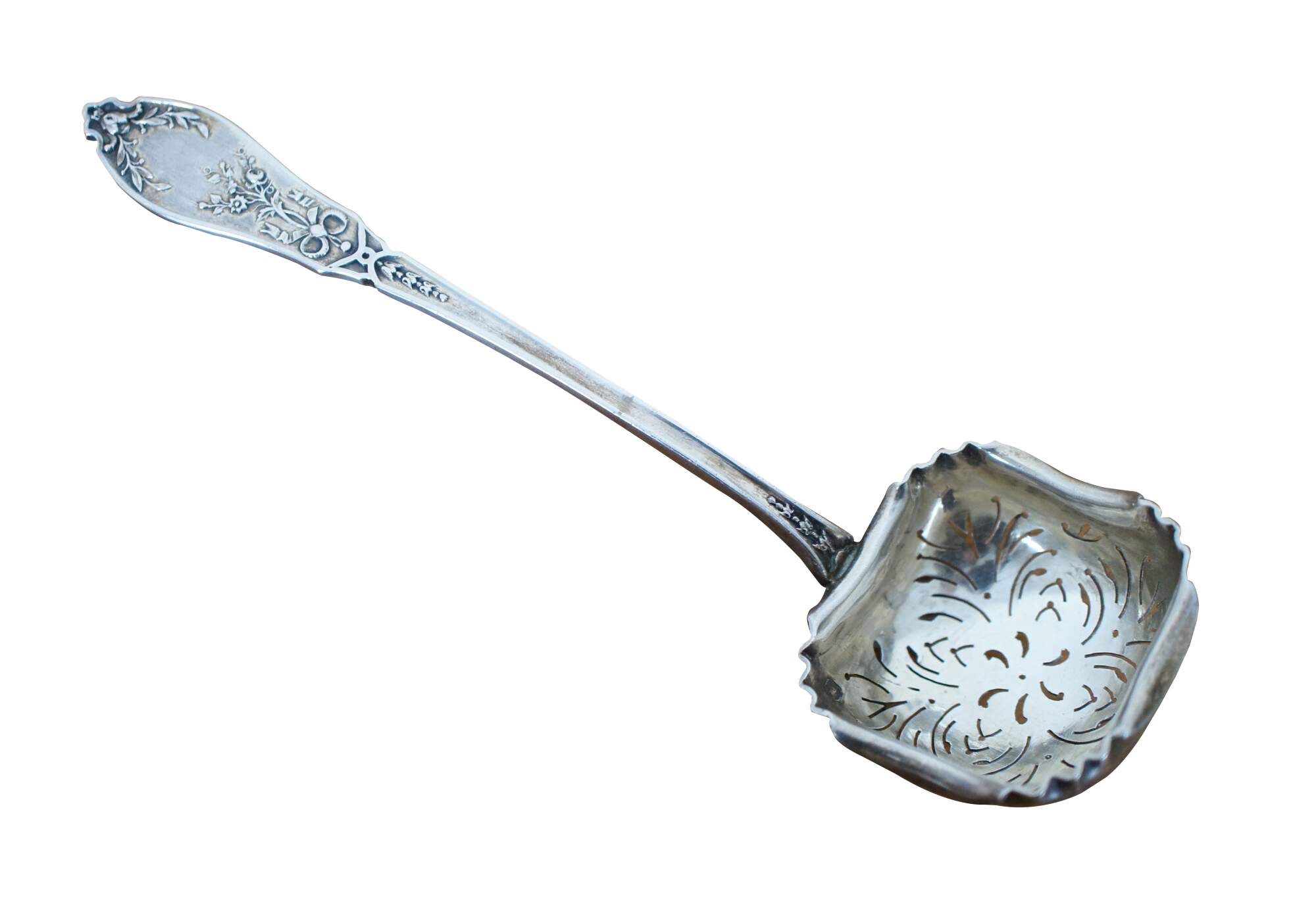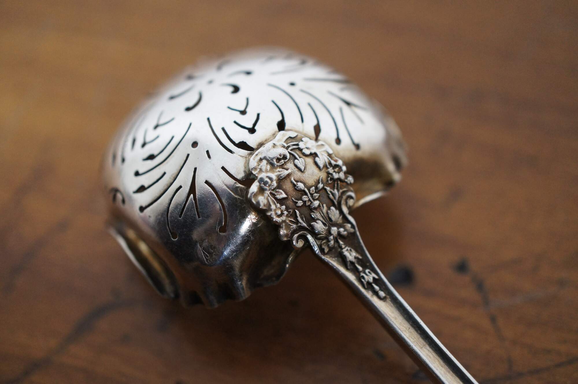 Antique silver pea spoon / tea strainer featuring a ladle shaped pierced bowl with lightly crimped edges and floral monogrammed motif on the handle.