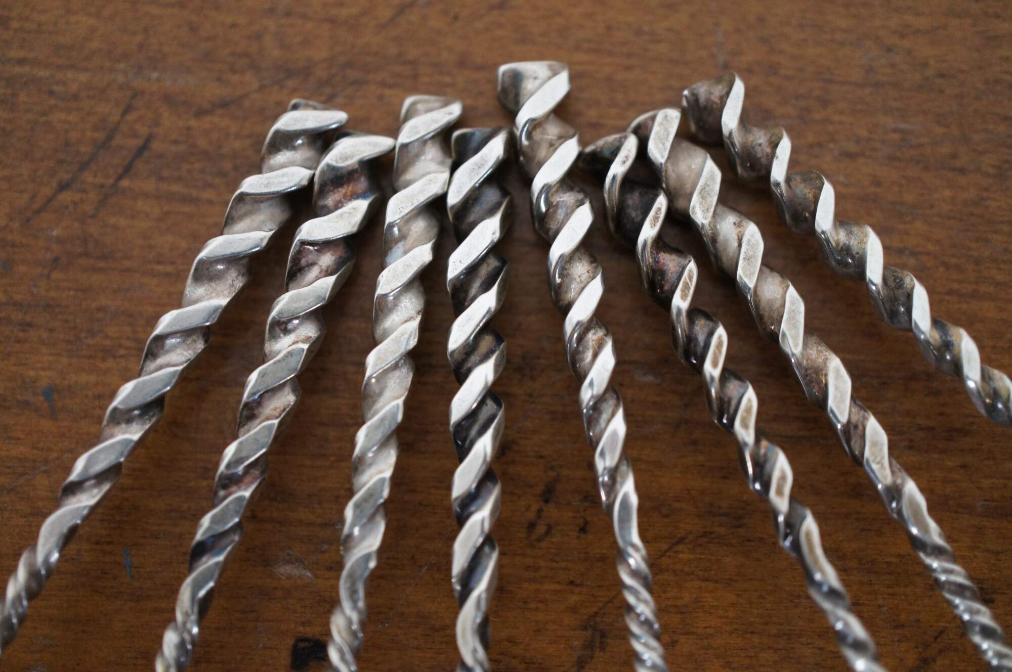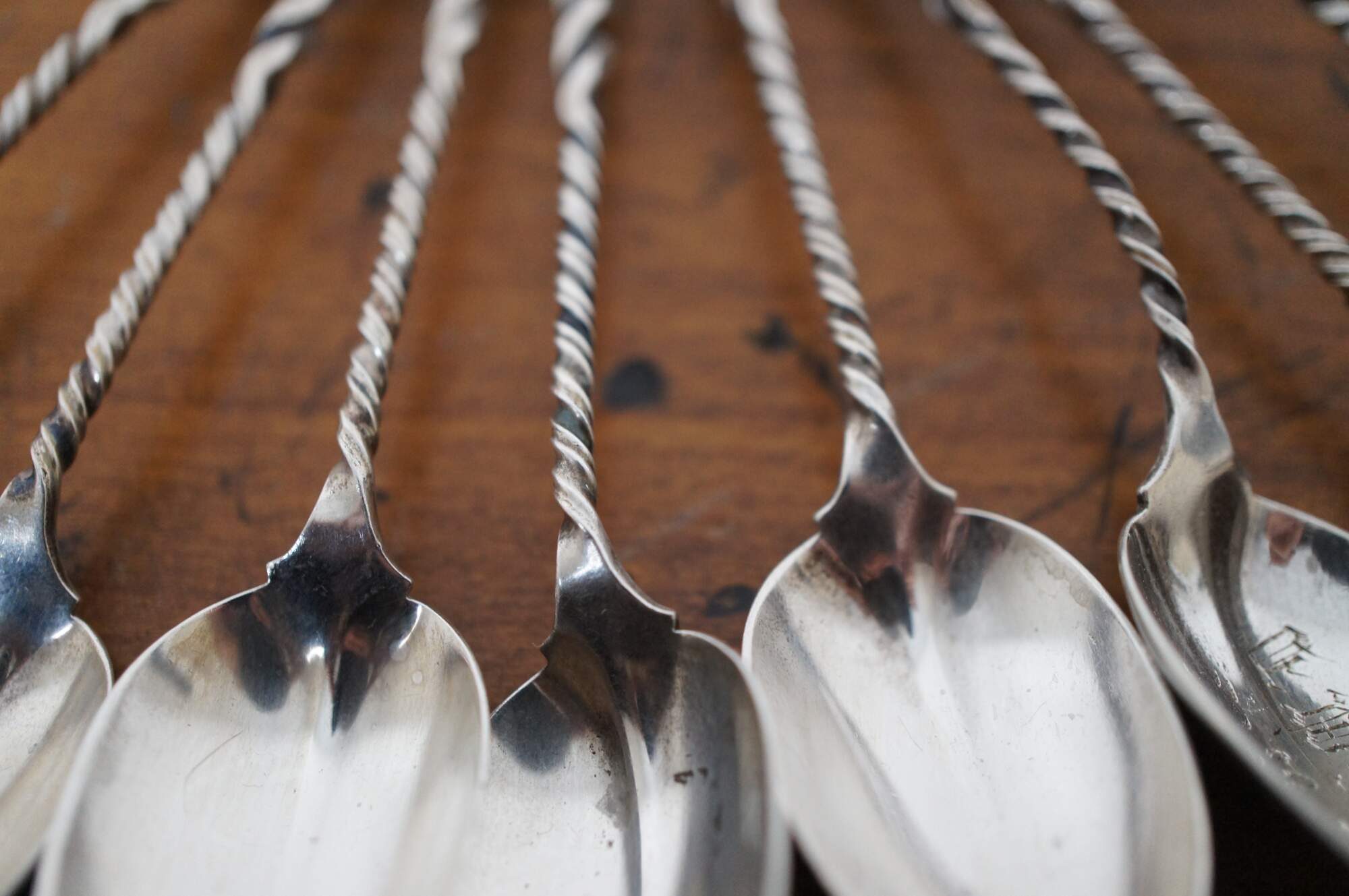 Set of 8 Whiting Mfg Co number 5 sterling silver coffee spoons with cleft bowl and twisted handles.