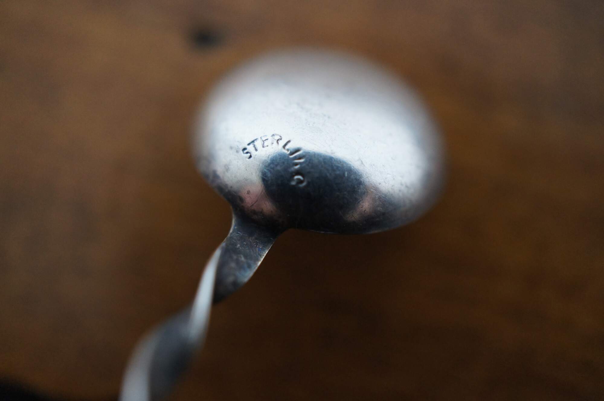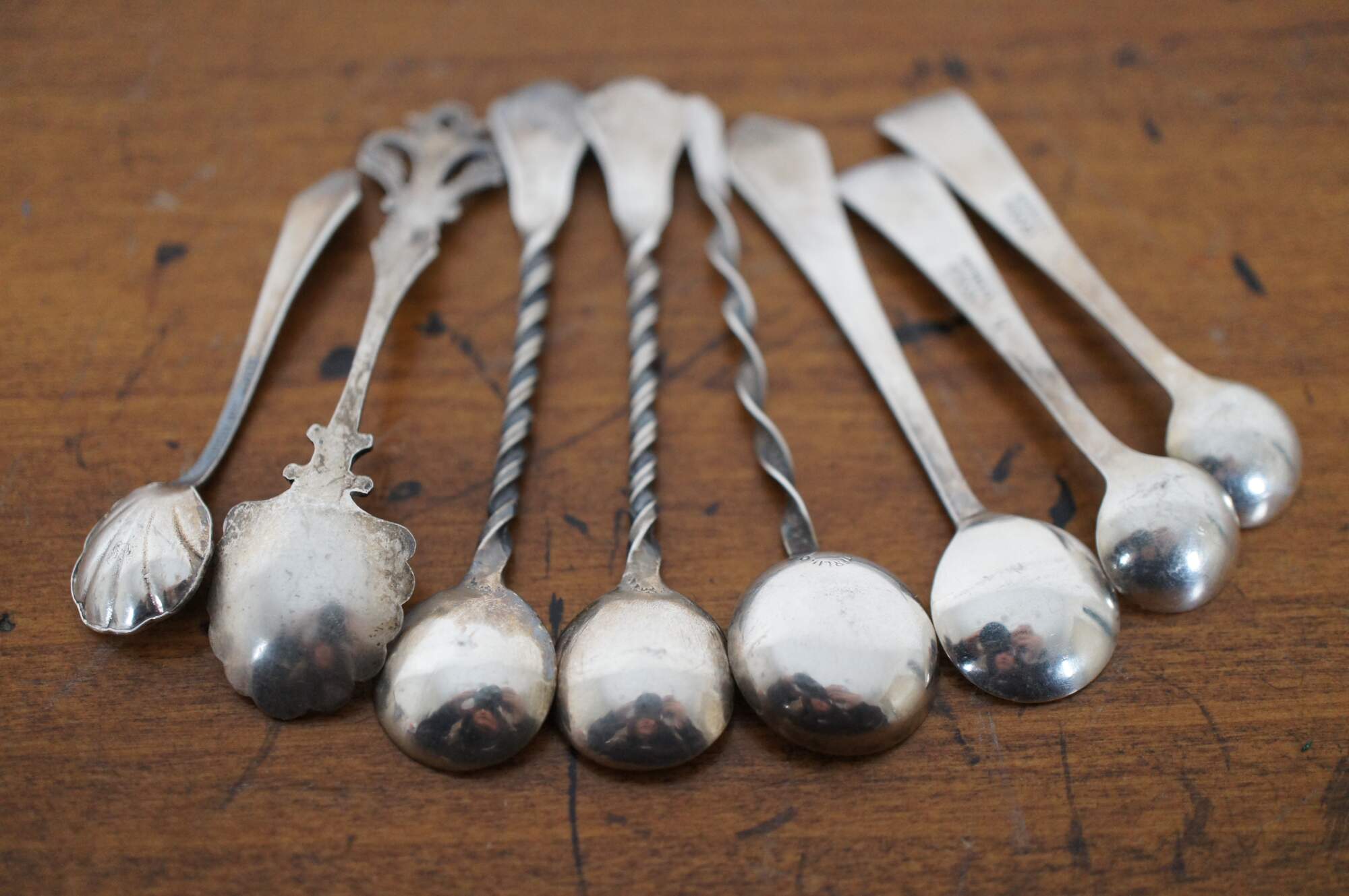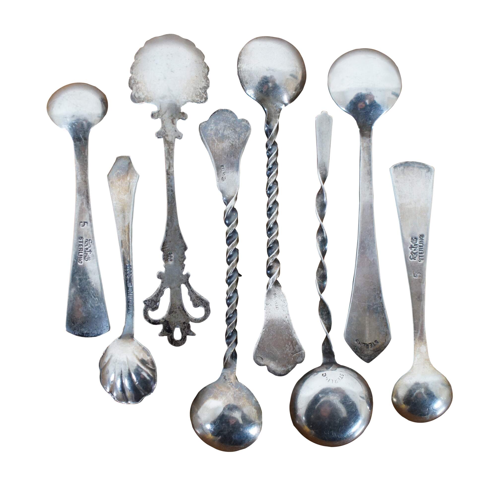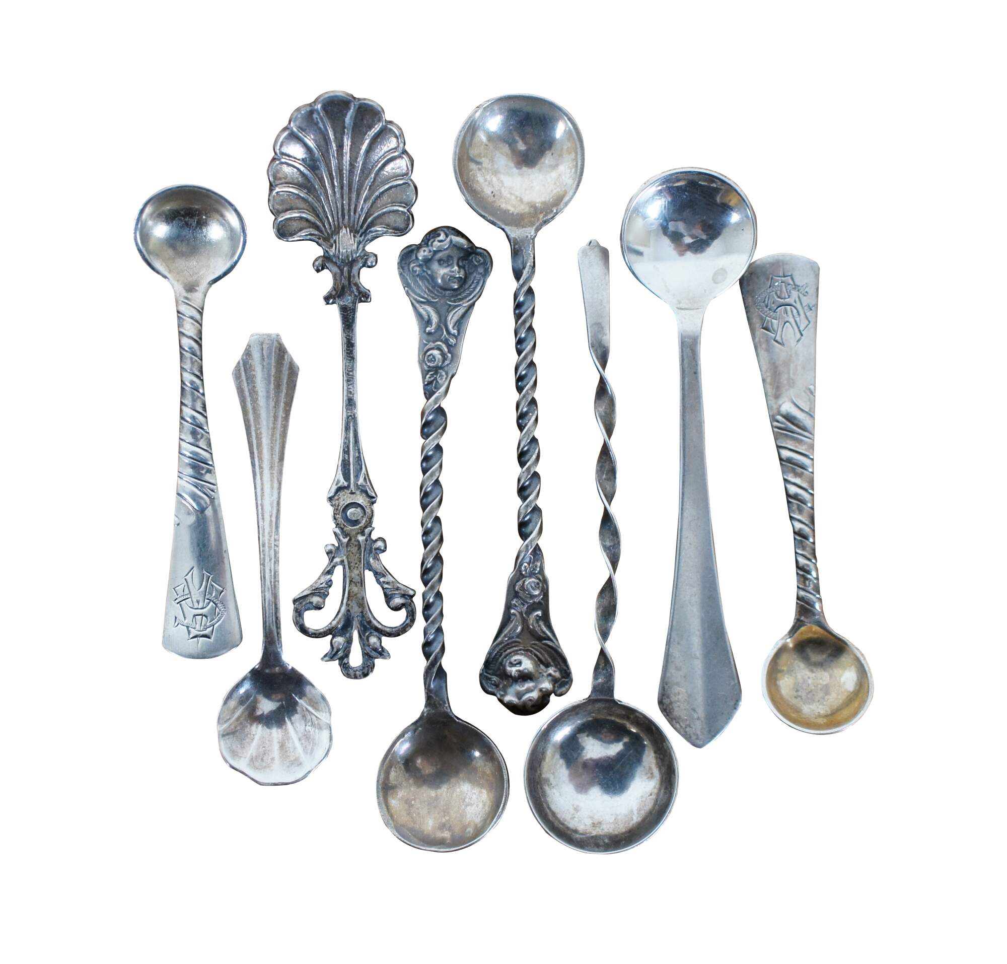 Lot of 8 assorted antique sterling silver salt spoons in a variety of designs and slightly different sizes. Makers include Webster Company and Gorham Mfg Co.