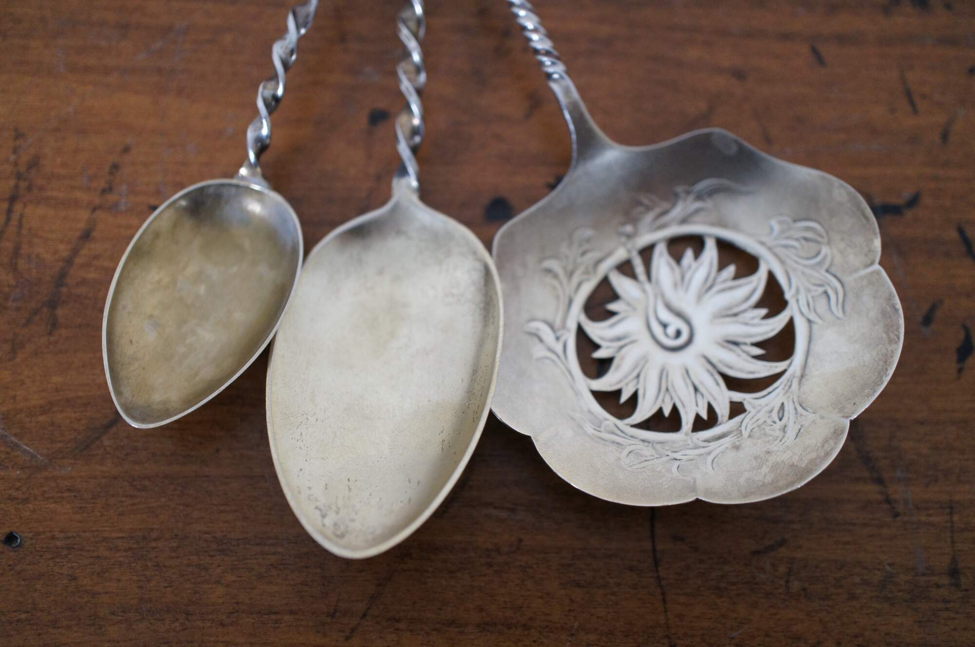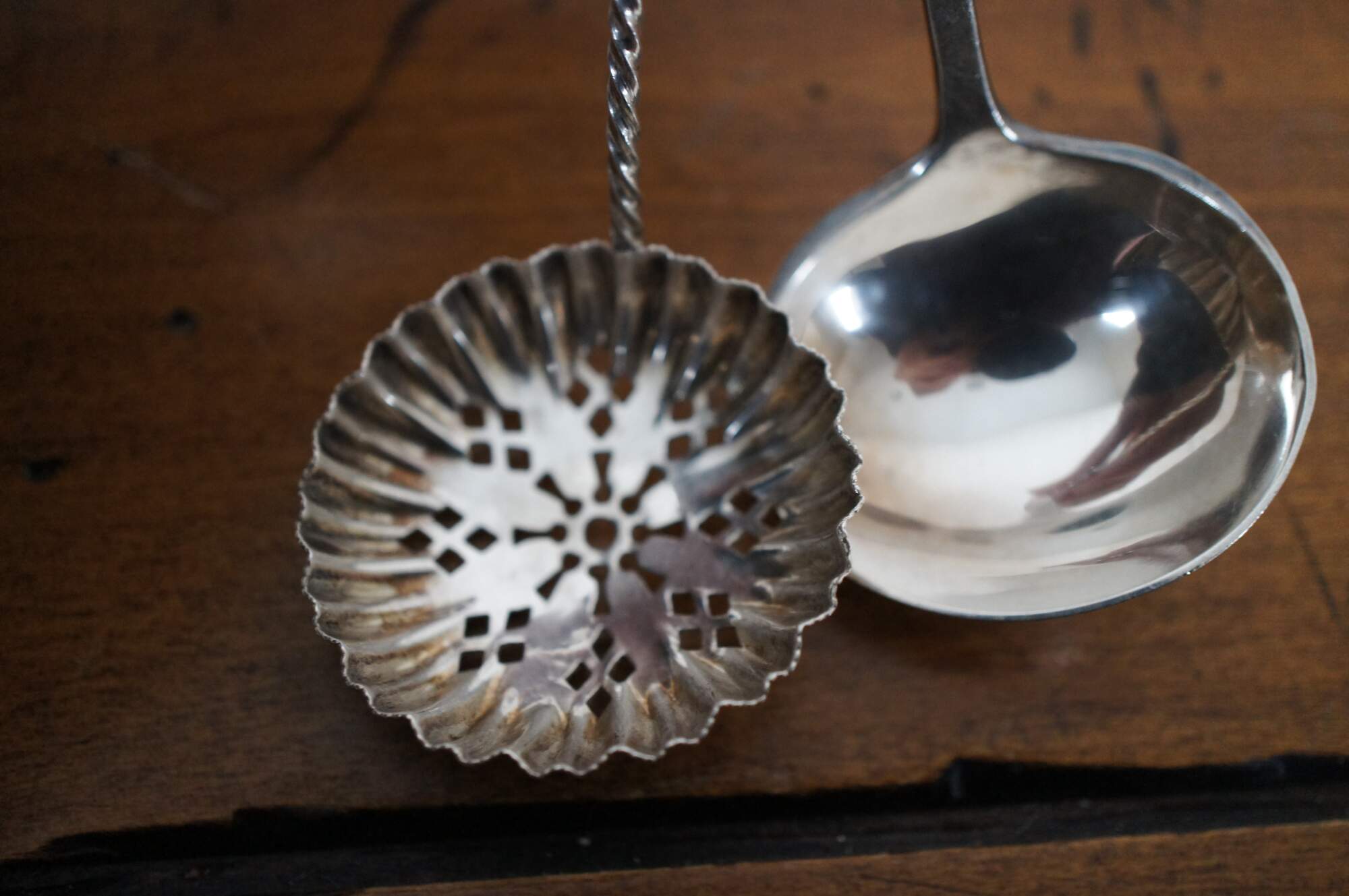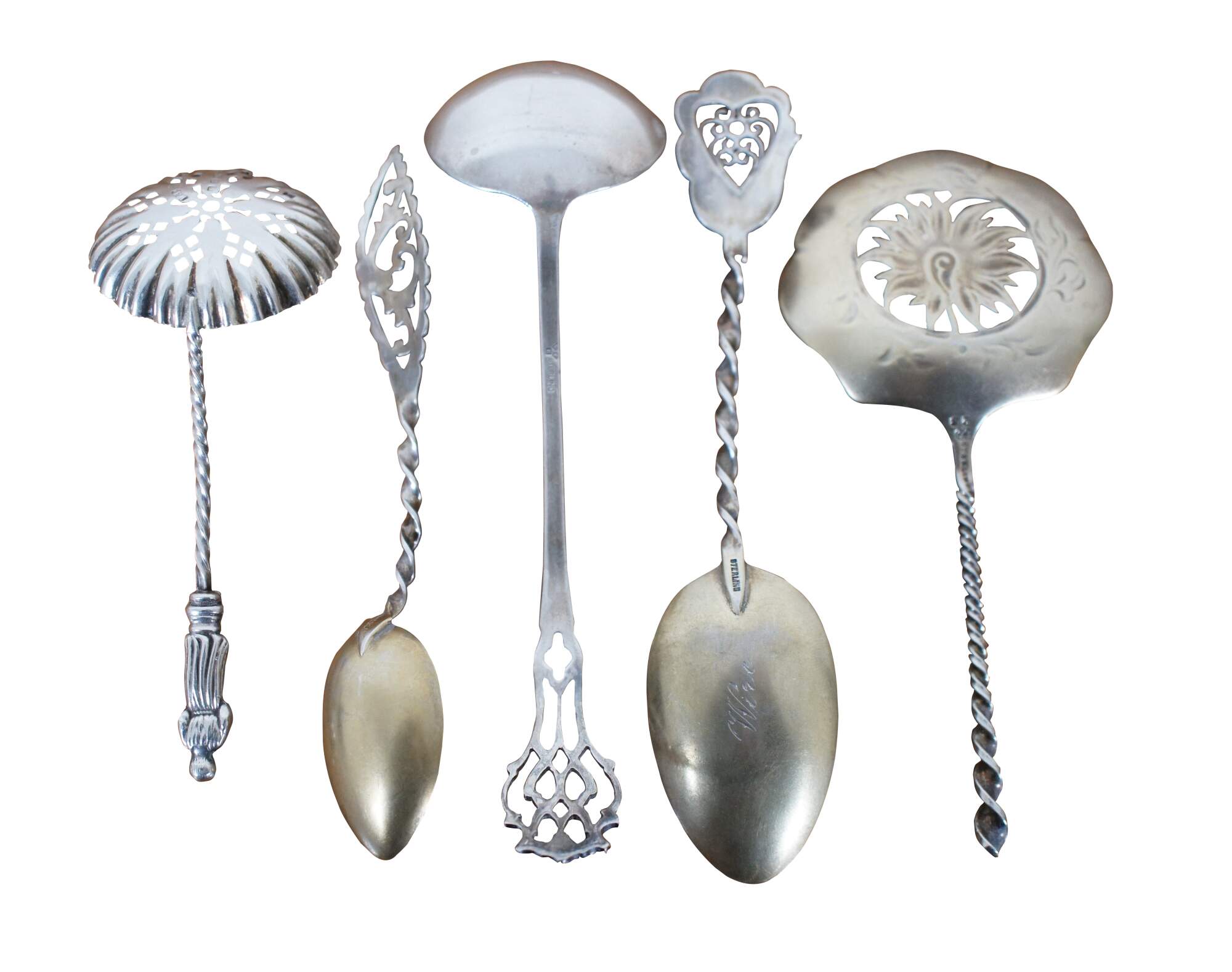 Lot of five sterling silver spoons with a variety of ornate twisted and reticulated handles, including two tea / coffee spoons, two pea / bon bon spoons, and one sauce ladle. Makers include Towle Silversmiths, Lunt Silversmiths, and William Devenport.