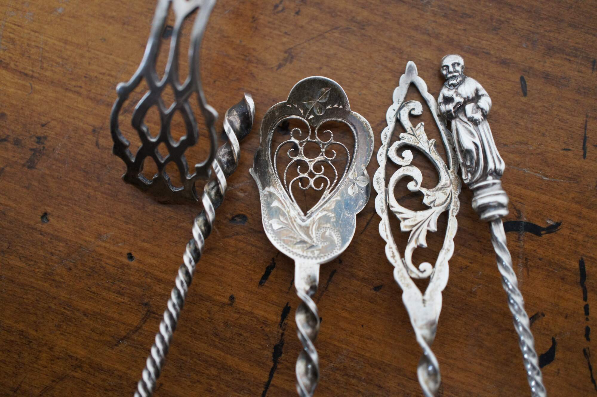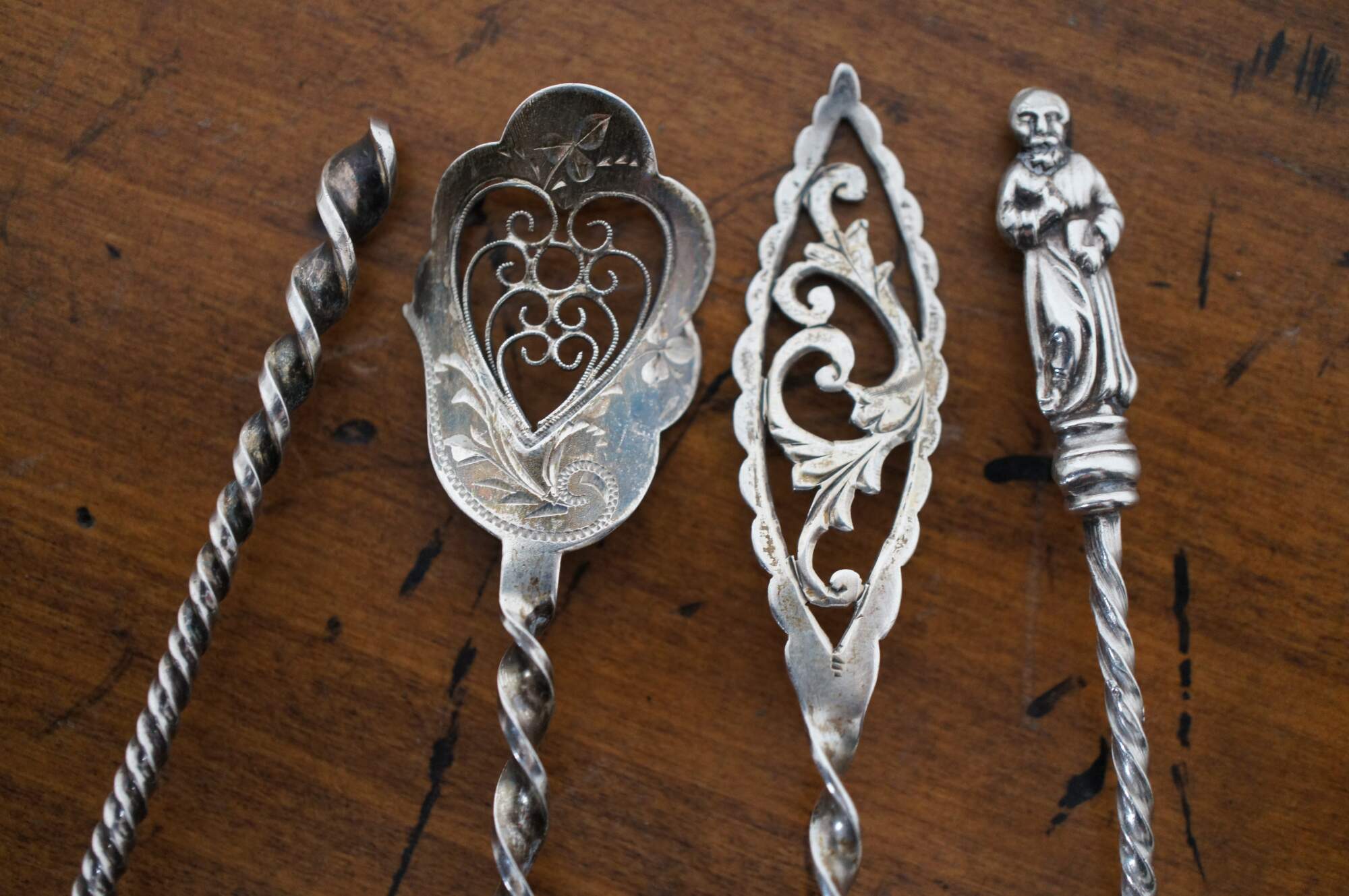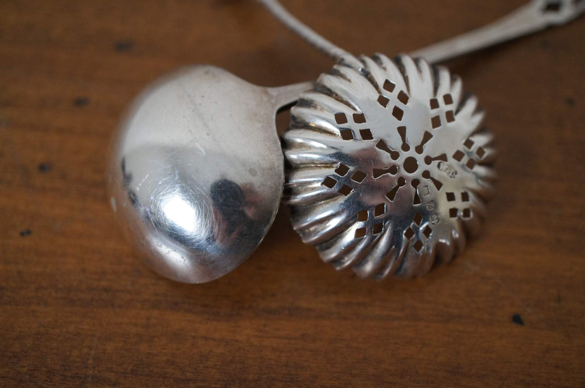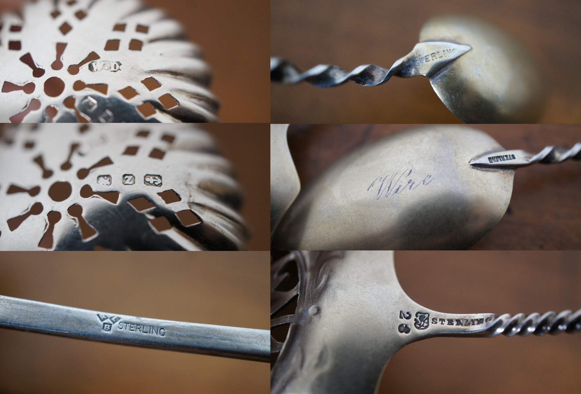 Lot of five sterling silver spoons with a variety of ornate twisted and reticulated handles, including two tea / coffee spoons, two pea / bon bon spoons, and one sauce ladle. Makers include Towle Silversmiths, Lunt Silversmiths, and William Devenport.
