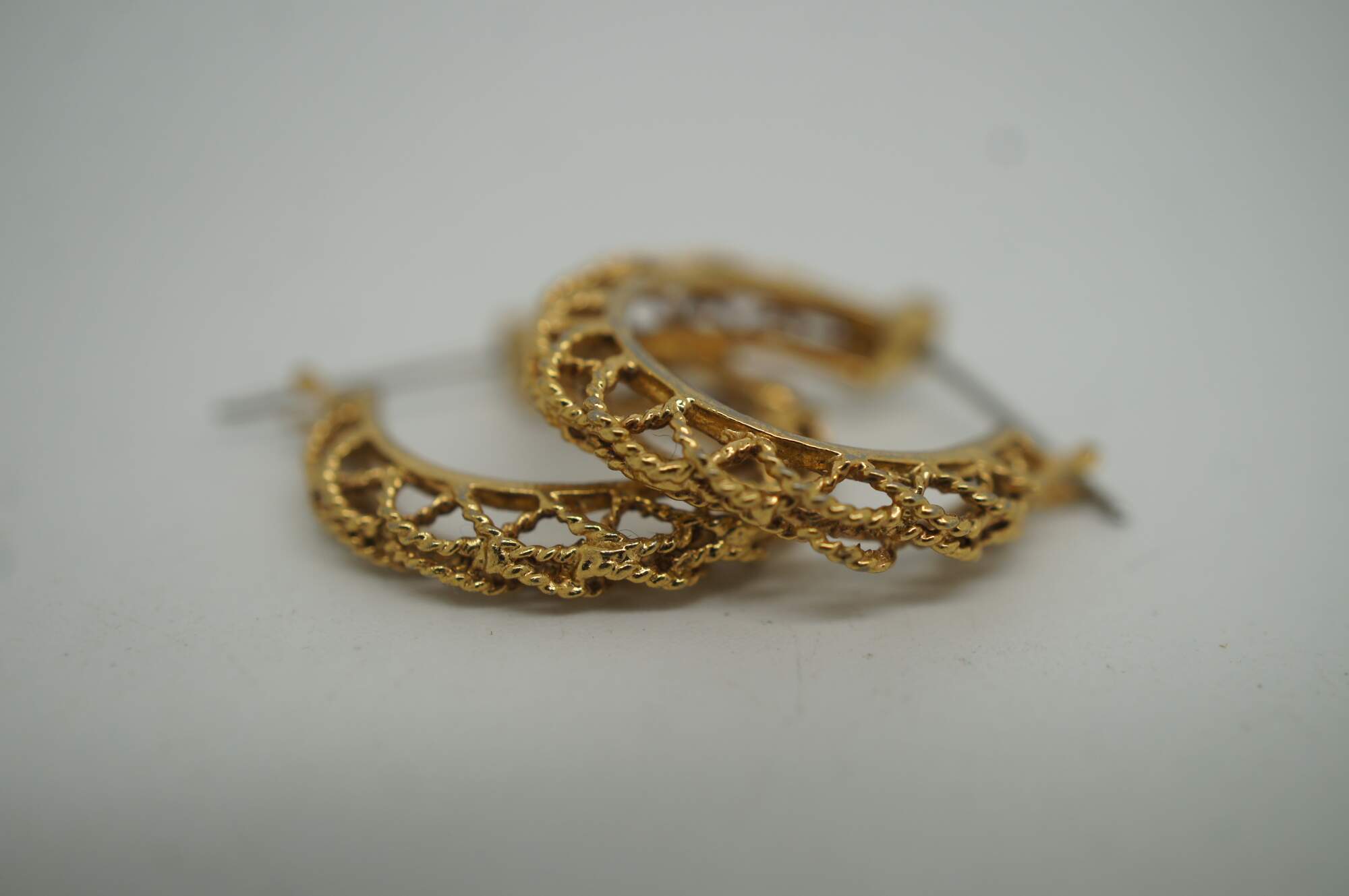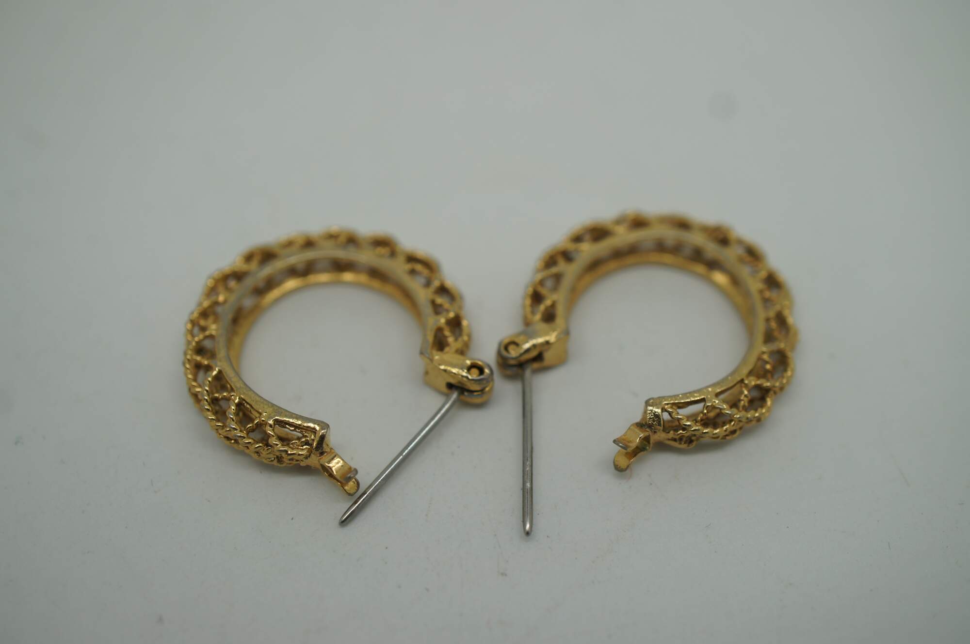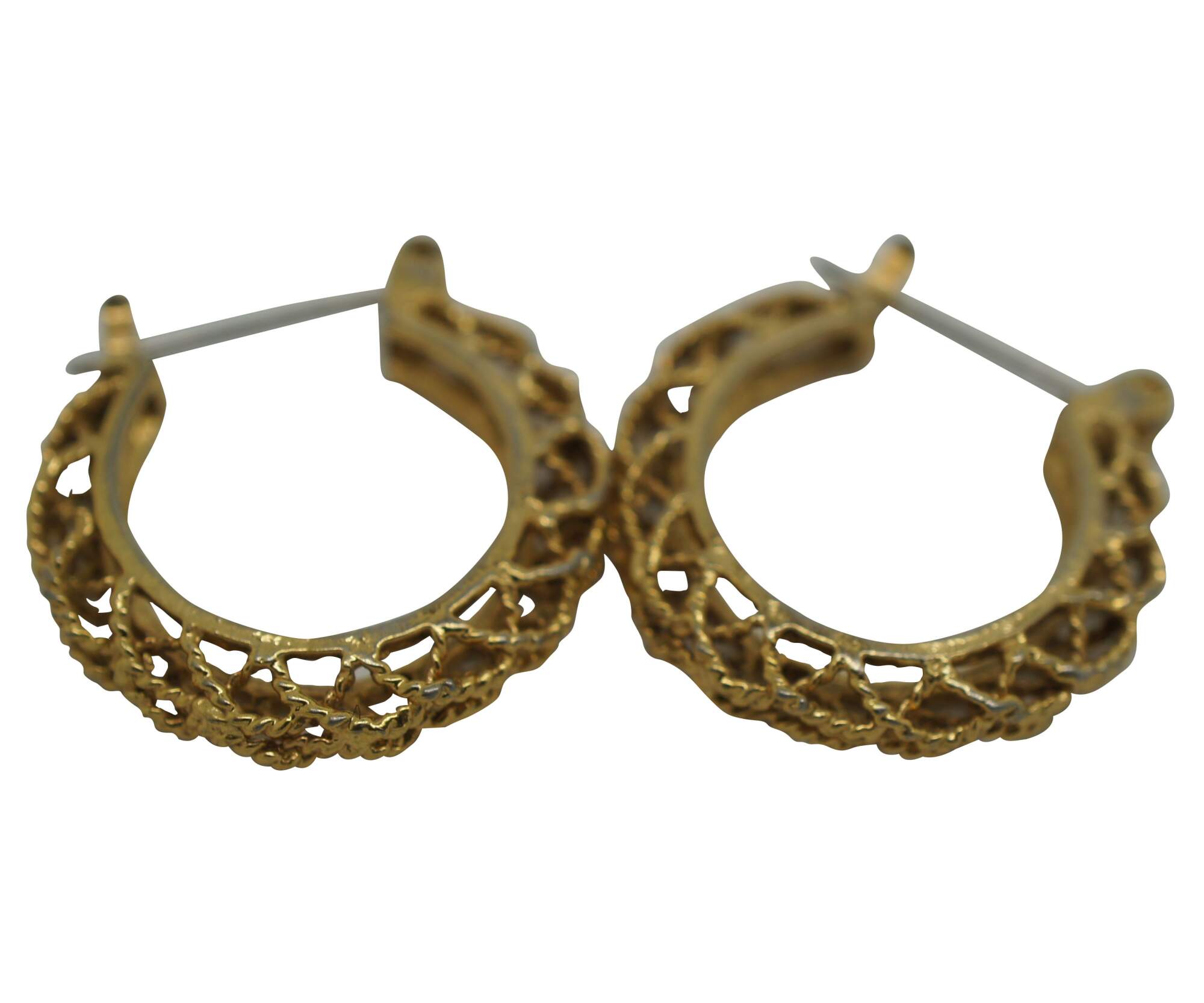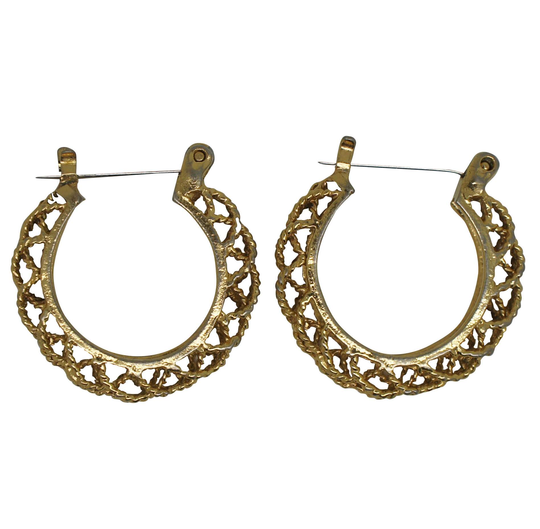 Vintage gilded metal braided rope twist filigree hoop earrings with hinged loop earring backs. No maker marks.