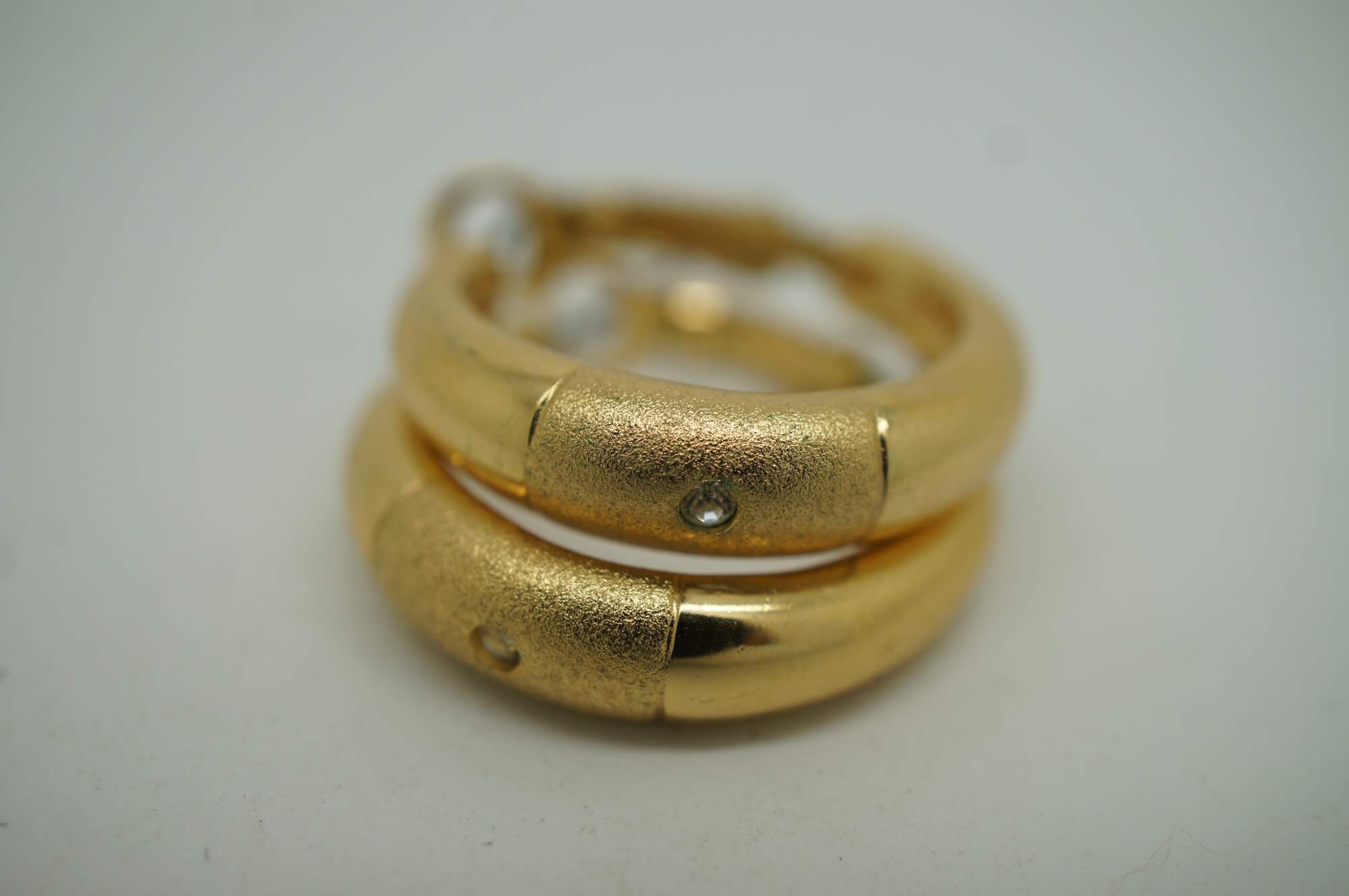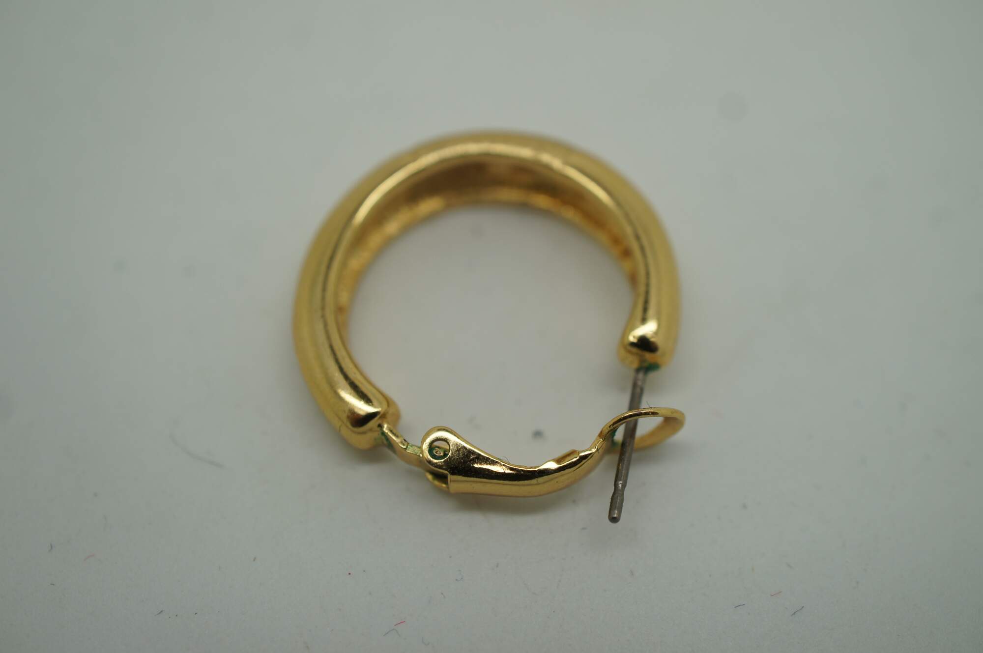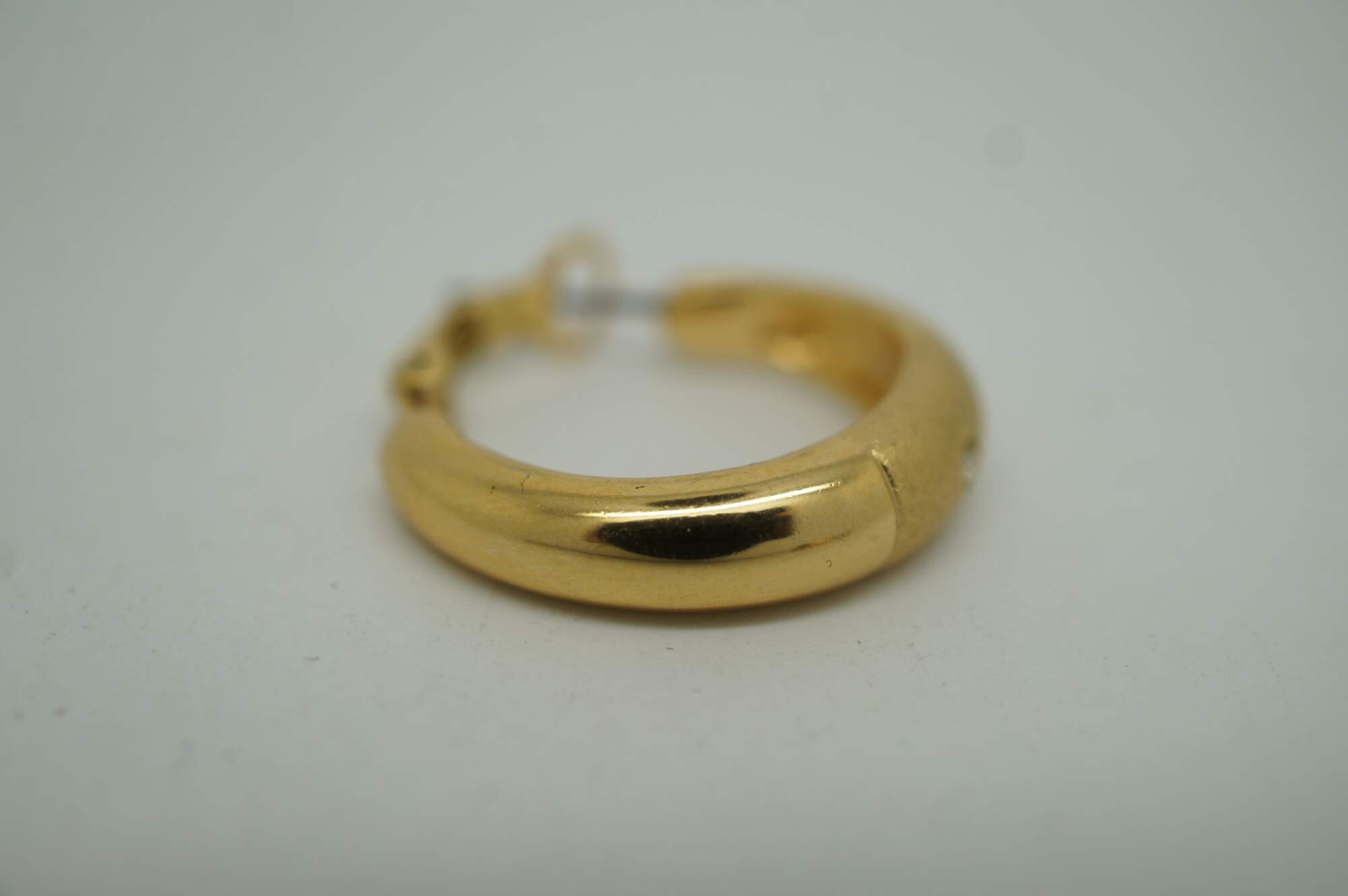 Vintage gold tone hoop earrings featuring a textured center section accented with a white rhinestone and polished sides, with lever back hoop earring backs. No makers mark.