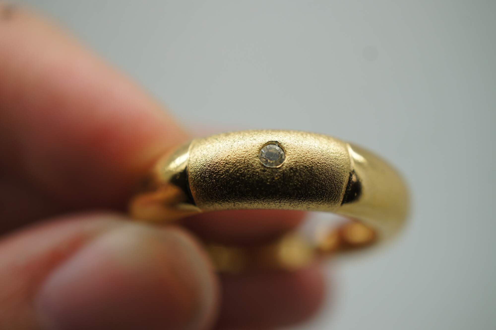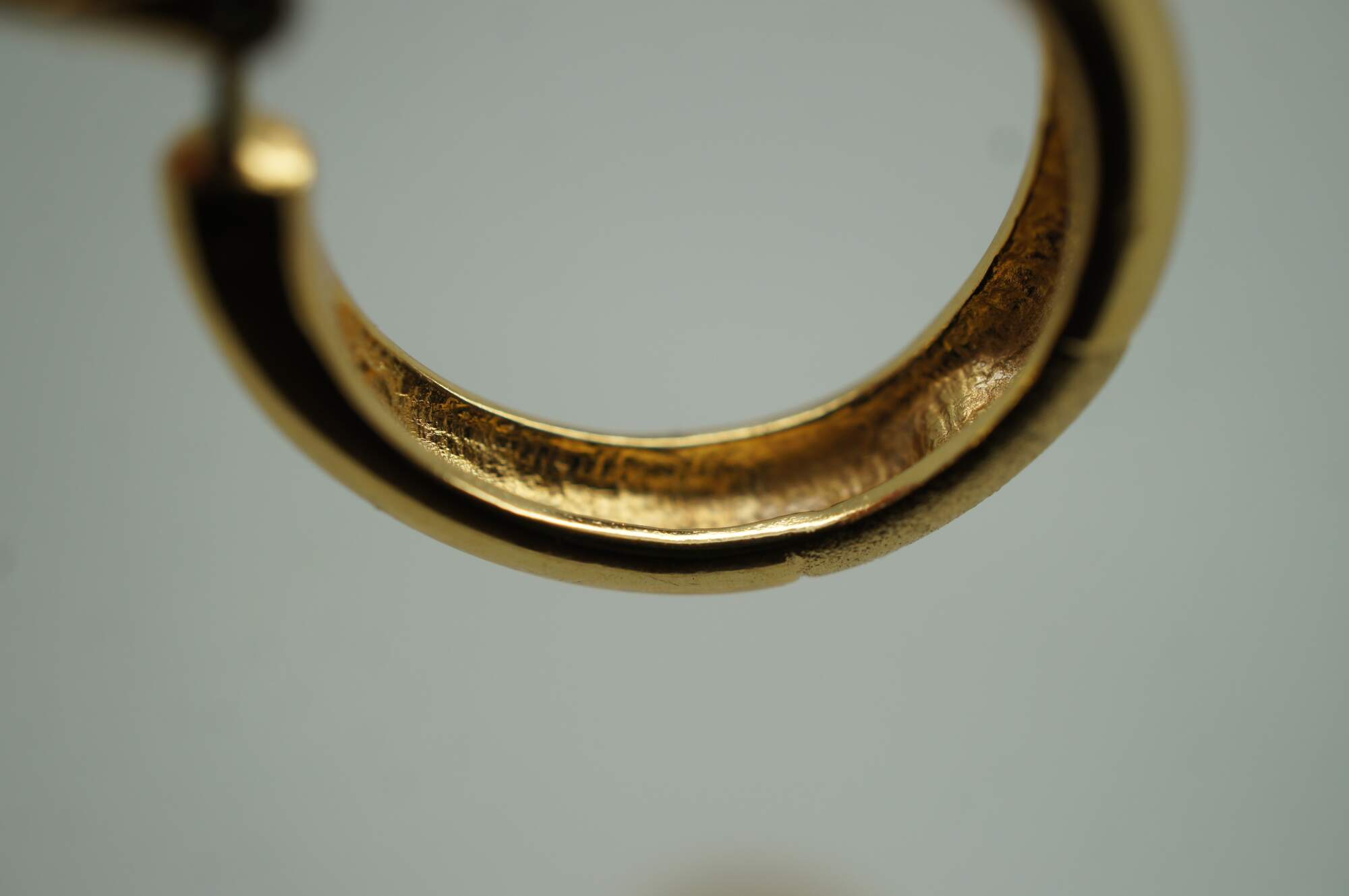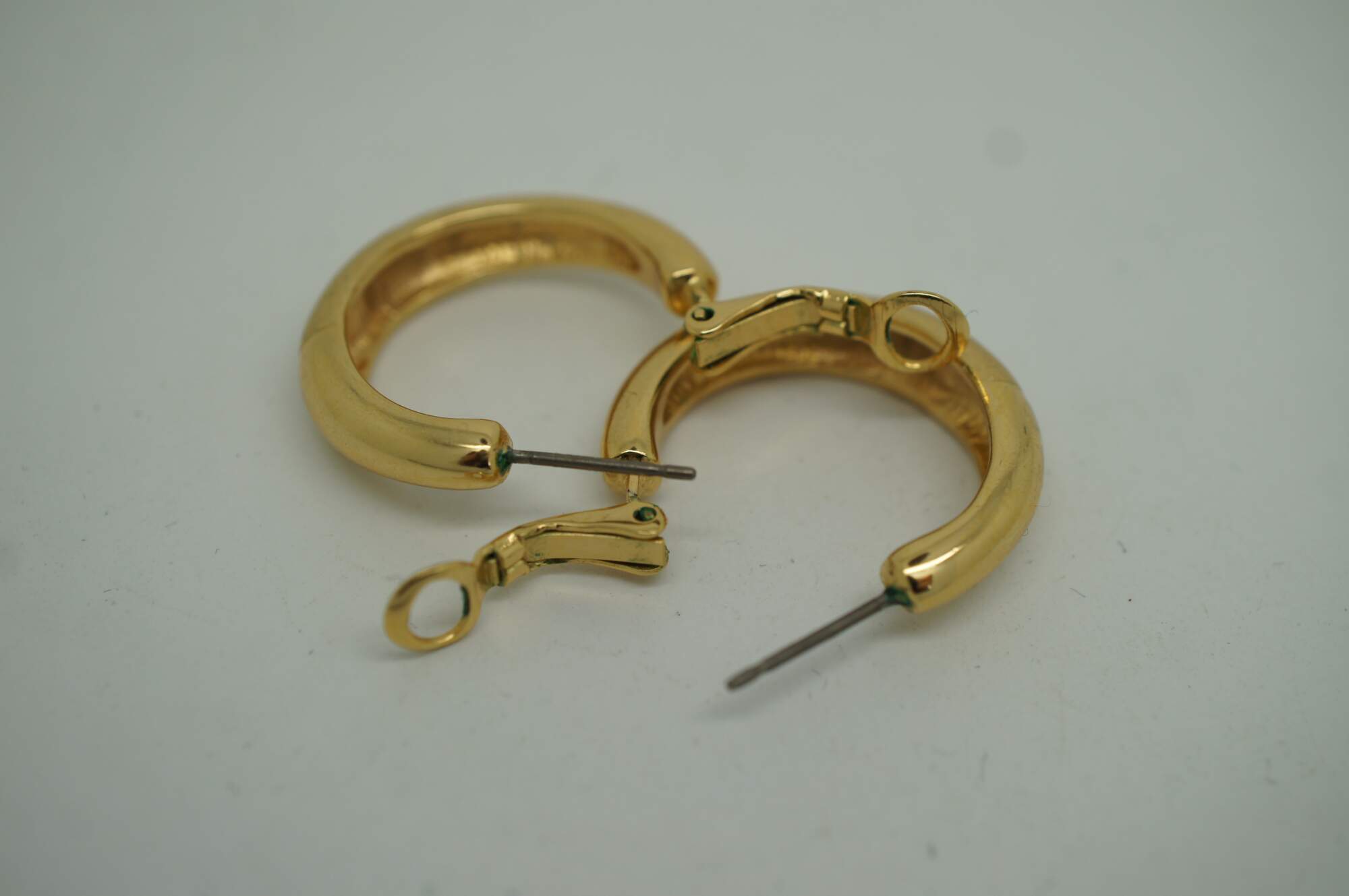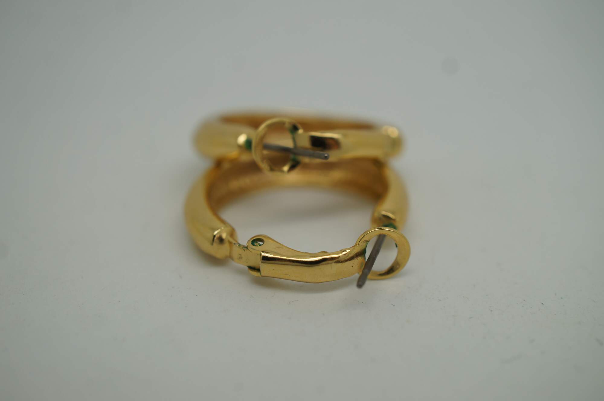 Vintage gold tone hoop earrings featuring a textured center section accented with a white rhinestone and polished sides, with lever back hoop earring backs. No makers mark.