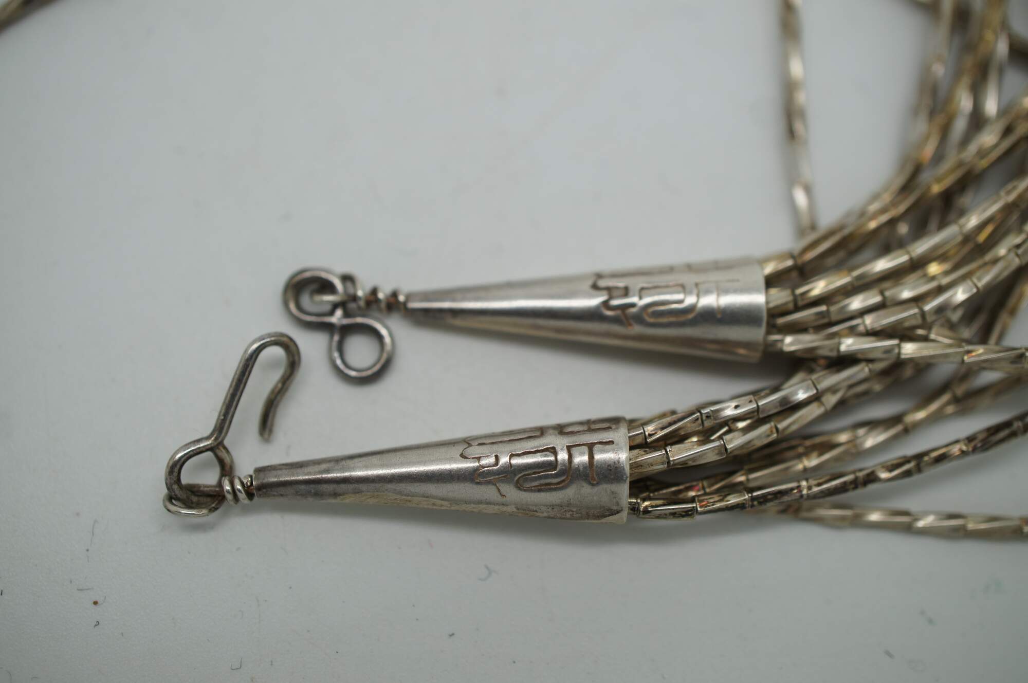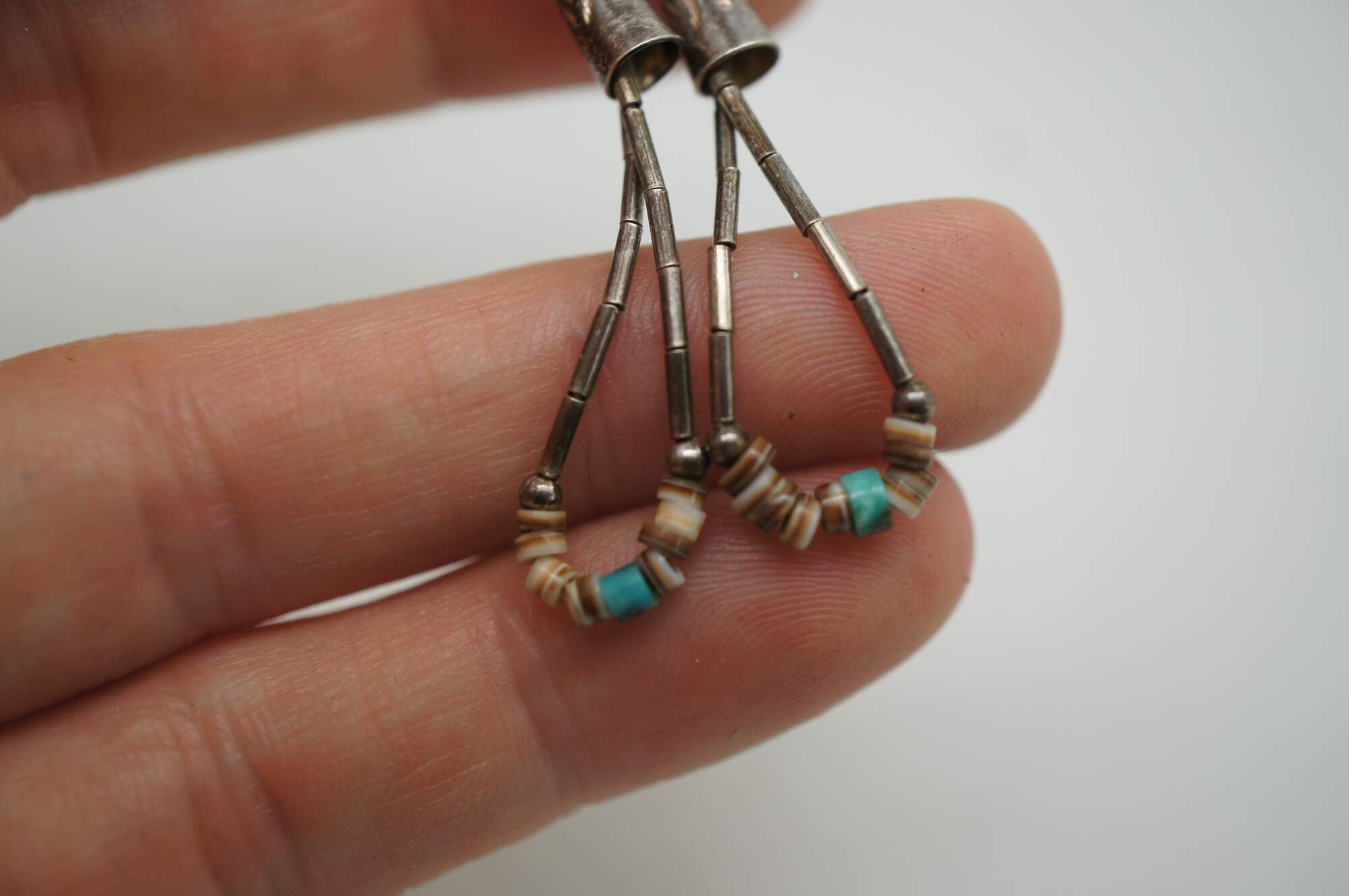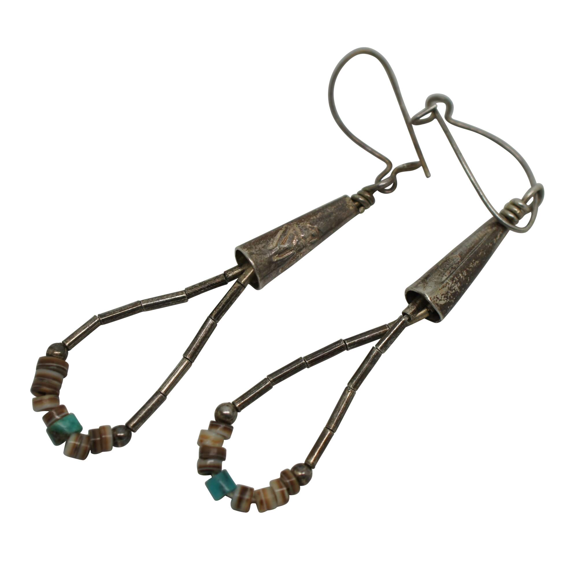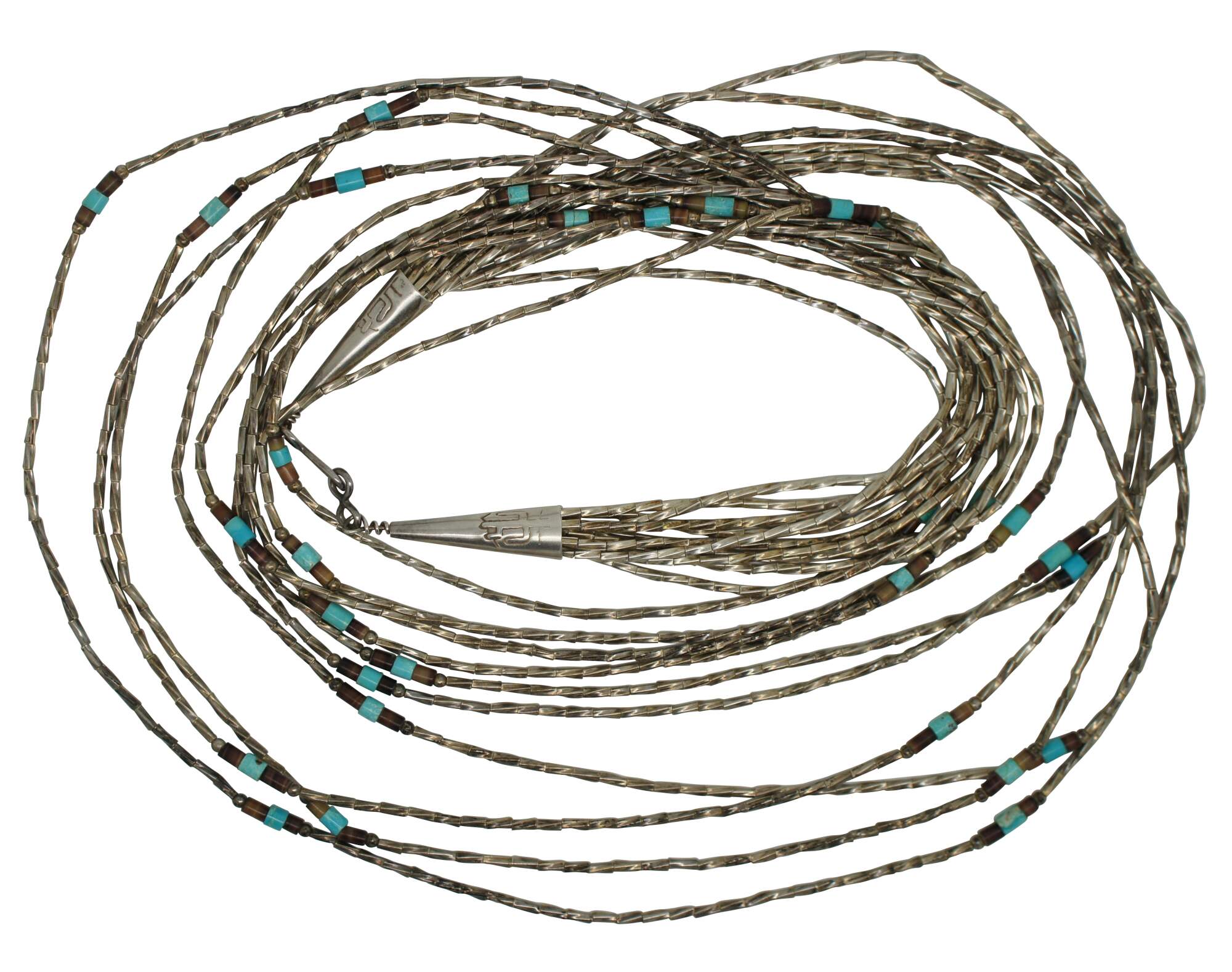 Vintage American Southwestern / Native American style 10 strand muti-layer bib waterfall necklace featuring twisted silver beads accented with turquoise and heishi / shell beads; caps decorated with a cactus; hook closure. Comes with matching dangle loop earrings, similarly beaded but with thunder birds on the caps; kidney ear wire earring back.