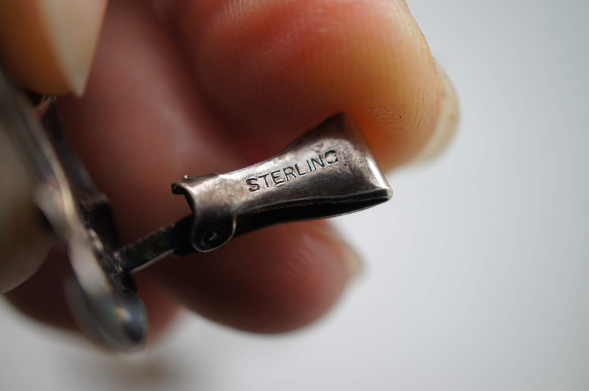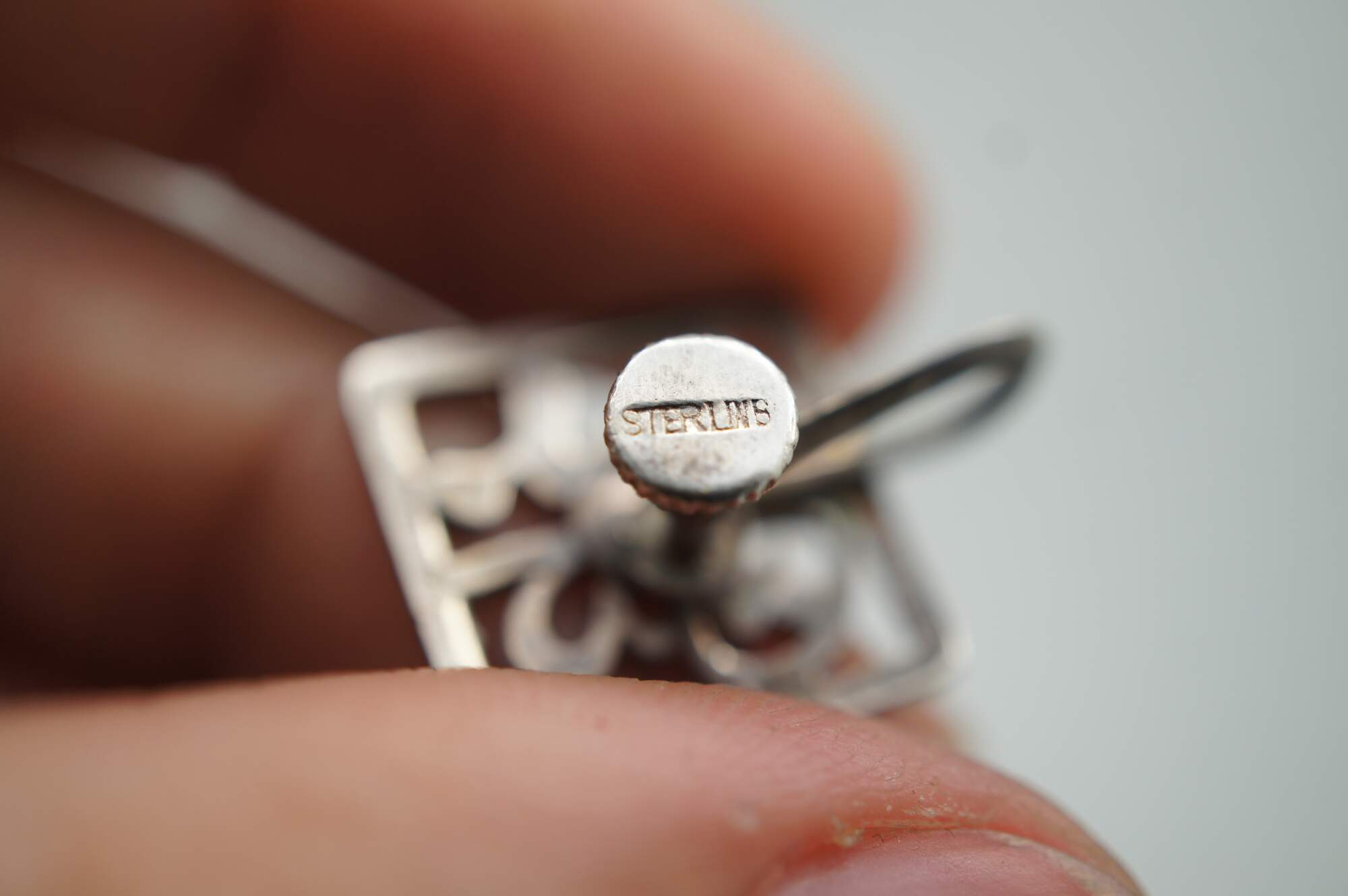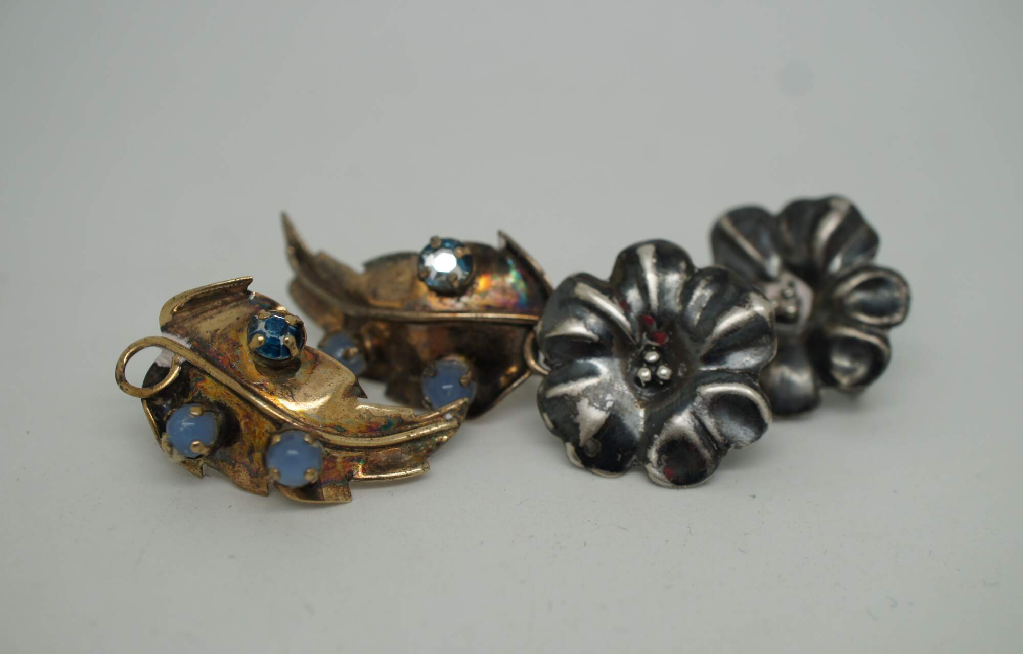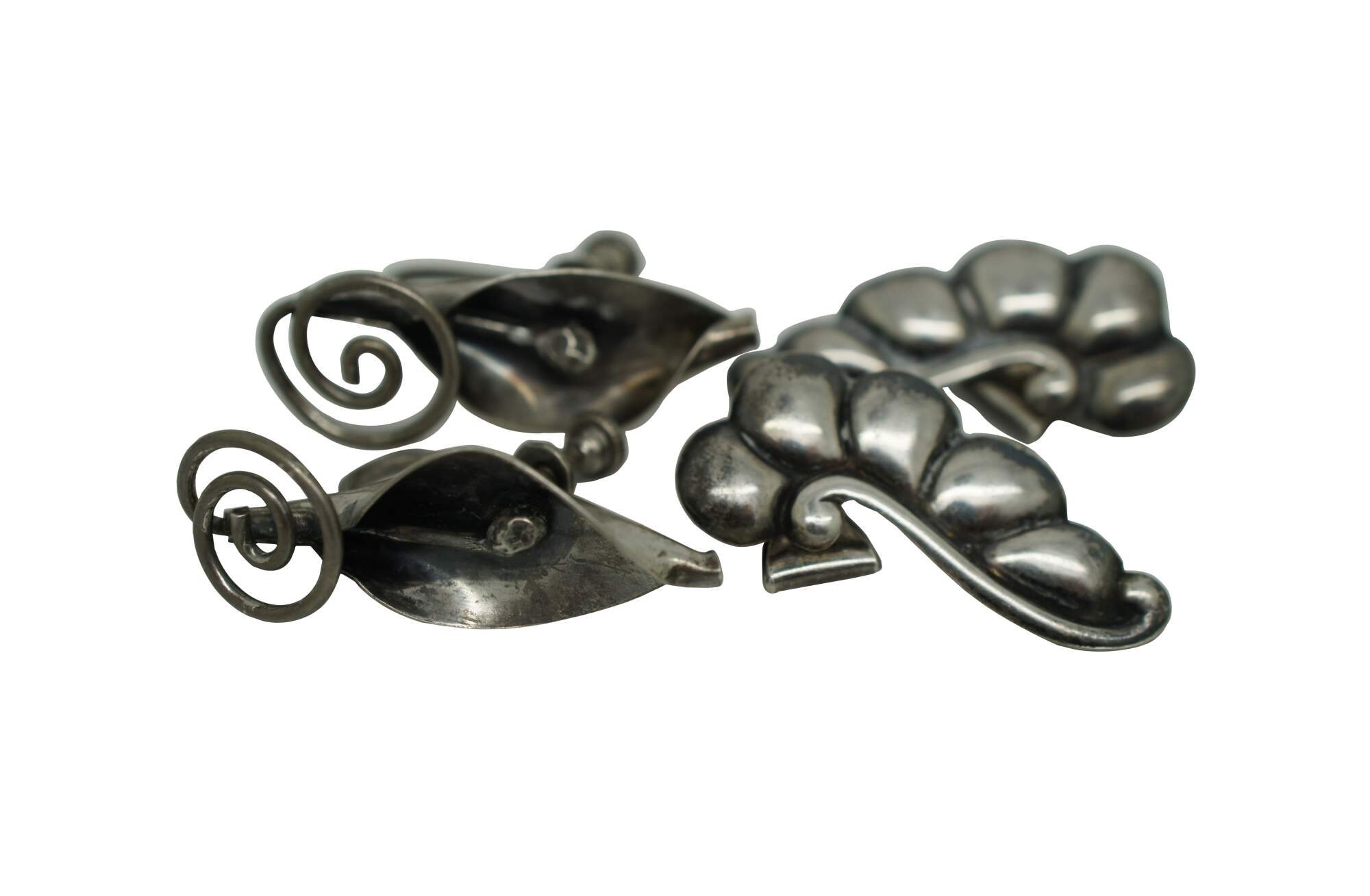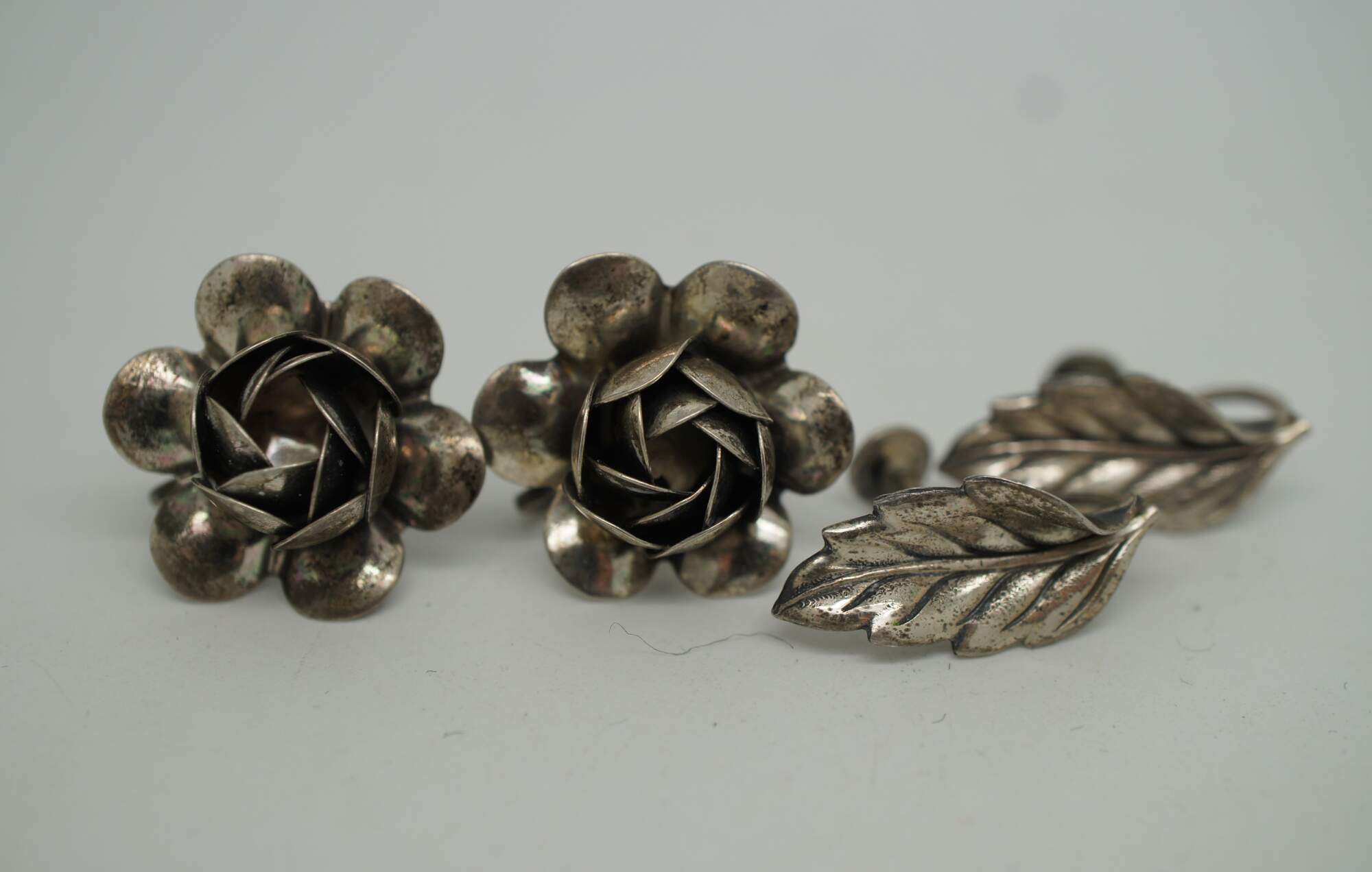 Lot of 10 pairs of early to mid 20th century sterling silver screw back and clip on earrings in a variety of chinoiserie and art deco floral designs. Monet, Beau.