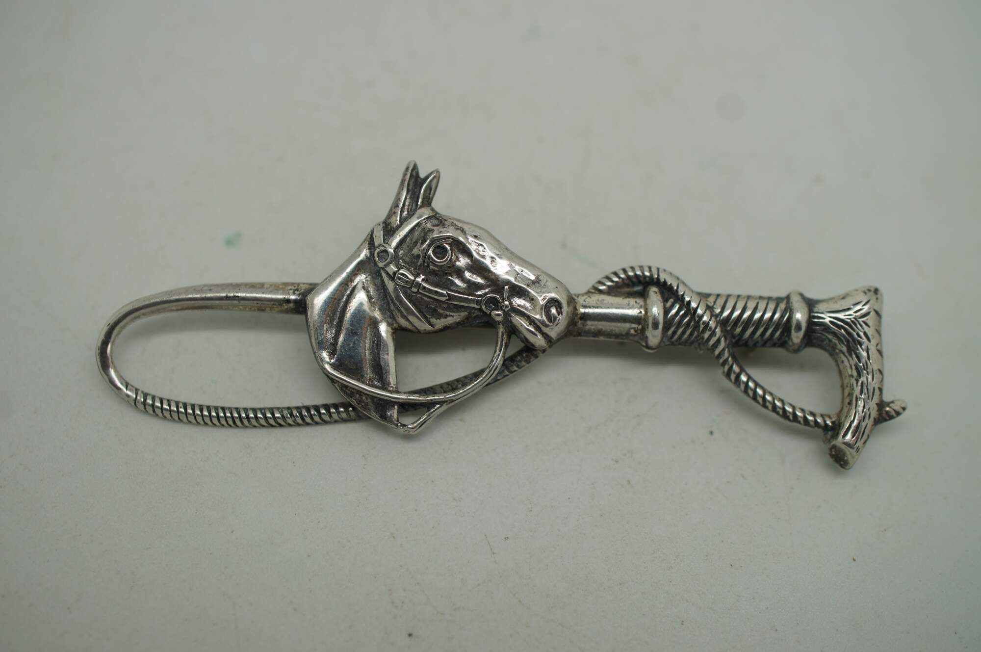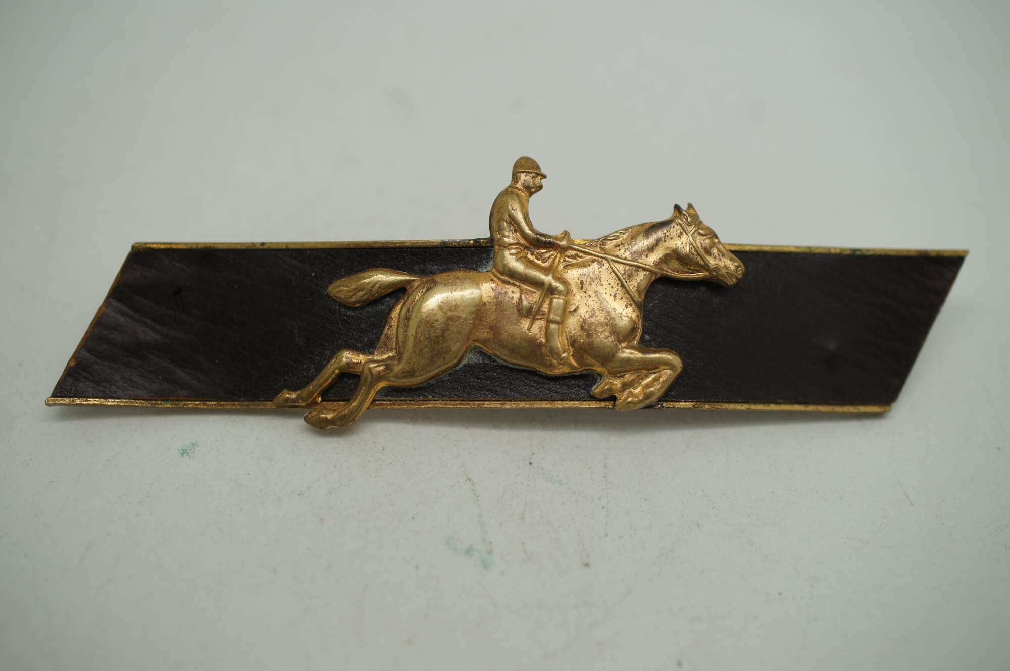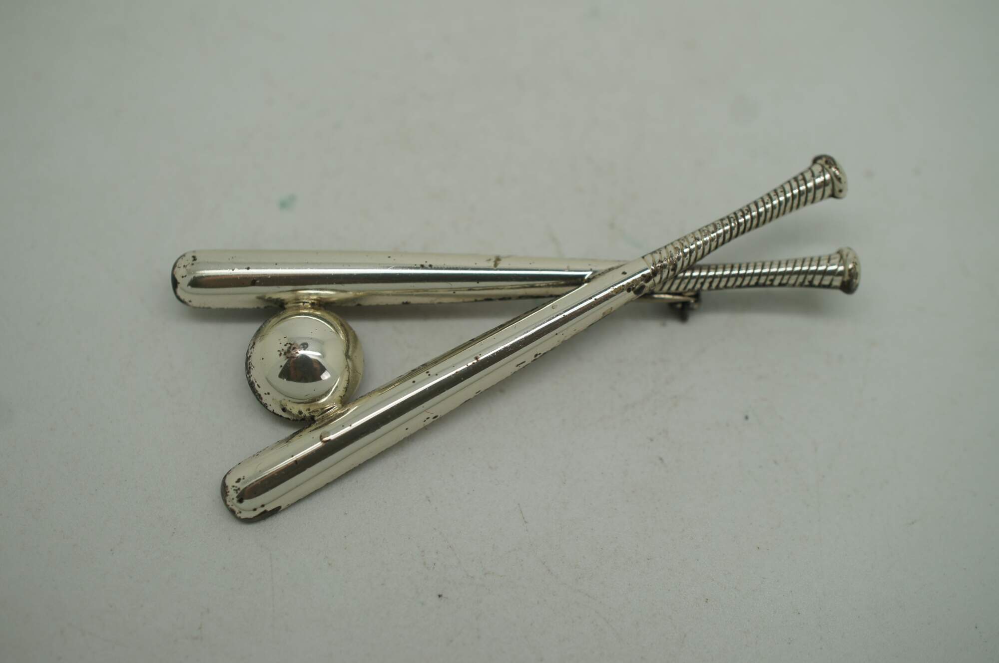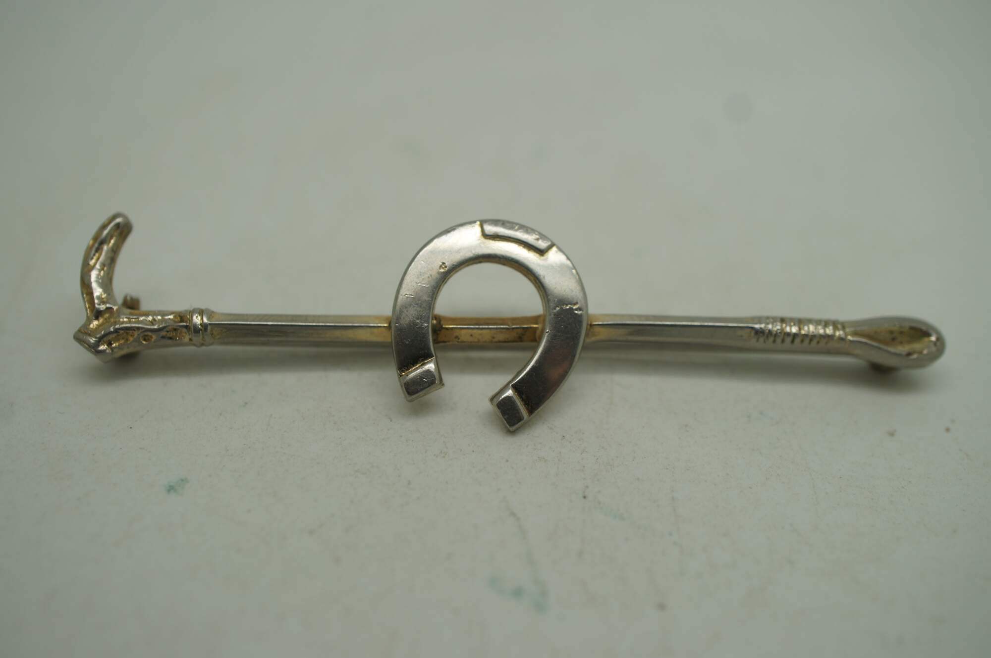 Assorted set of four vintage pins / brooches, including one gilt and leather horse rider / jumper, two sterling silver riding crops with horseshoe, and one sterling crossed baseball bats by Beau.