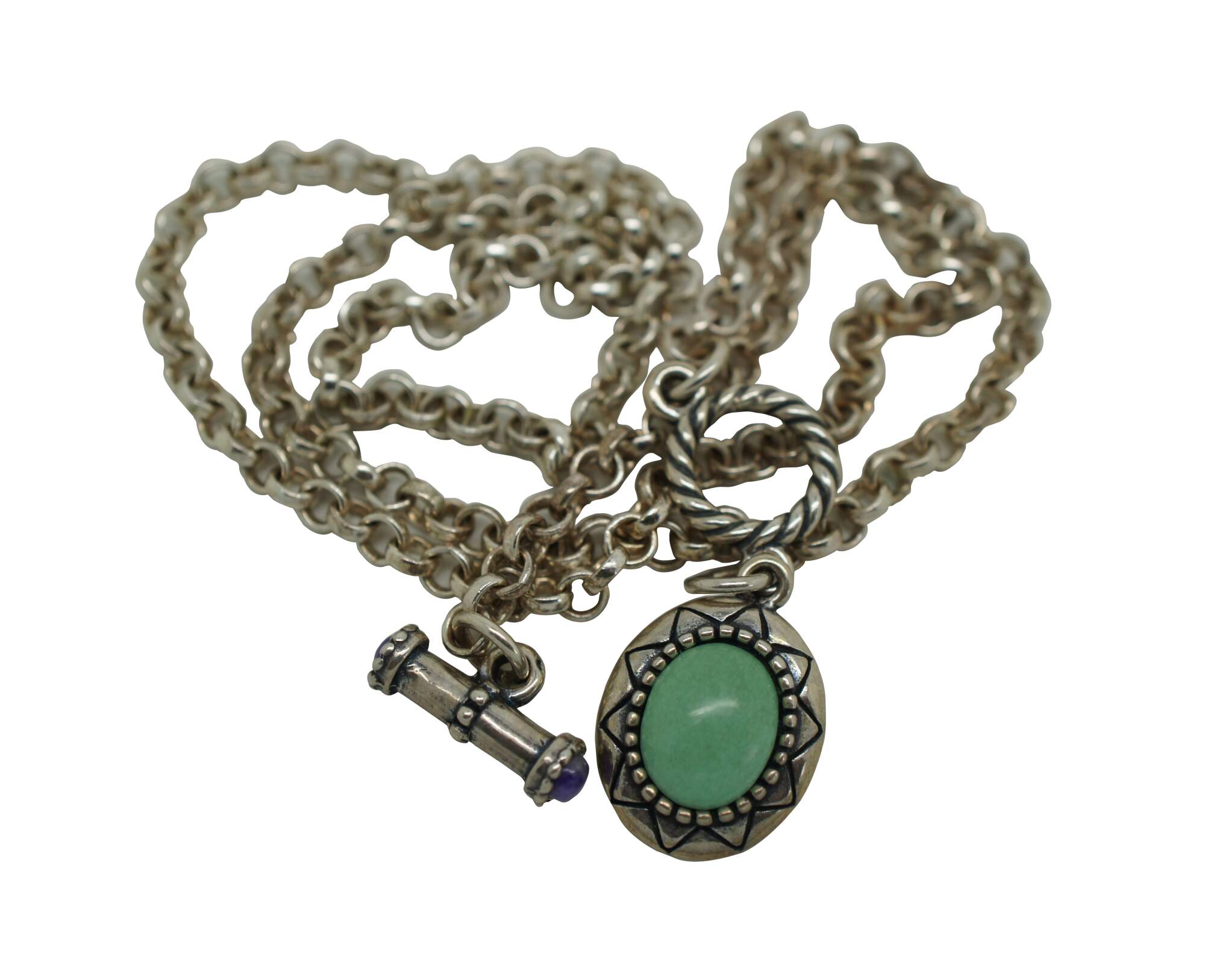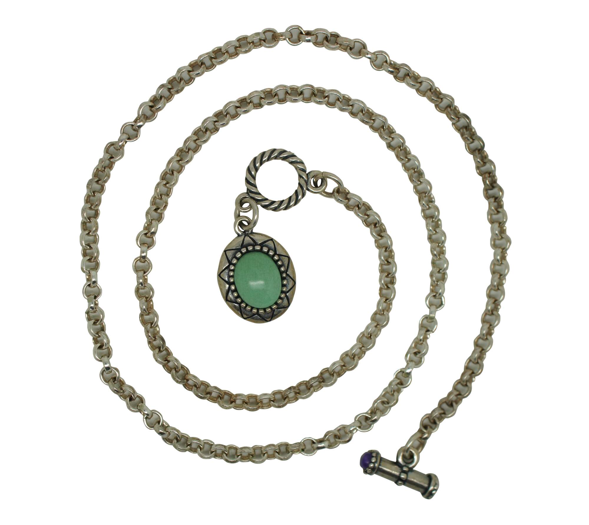 Vintage Southwestern style sterling silver 925 belcher / rolo designer chain pendant necklace or watch chain with amethyst accents on the toggle and sun shaped light green turquoise stone on the fob.