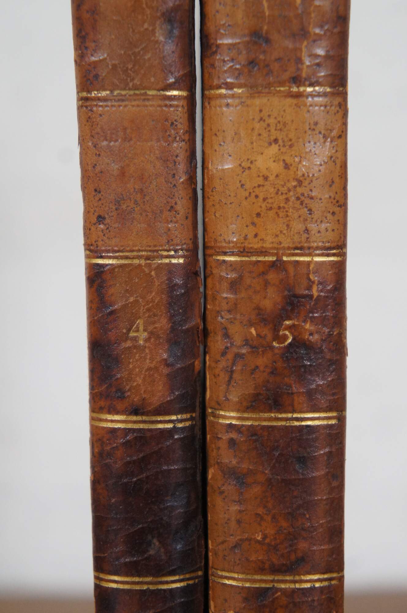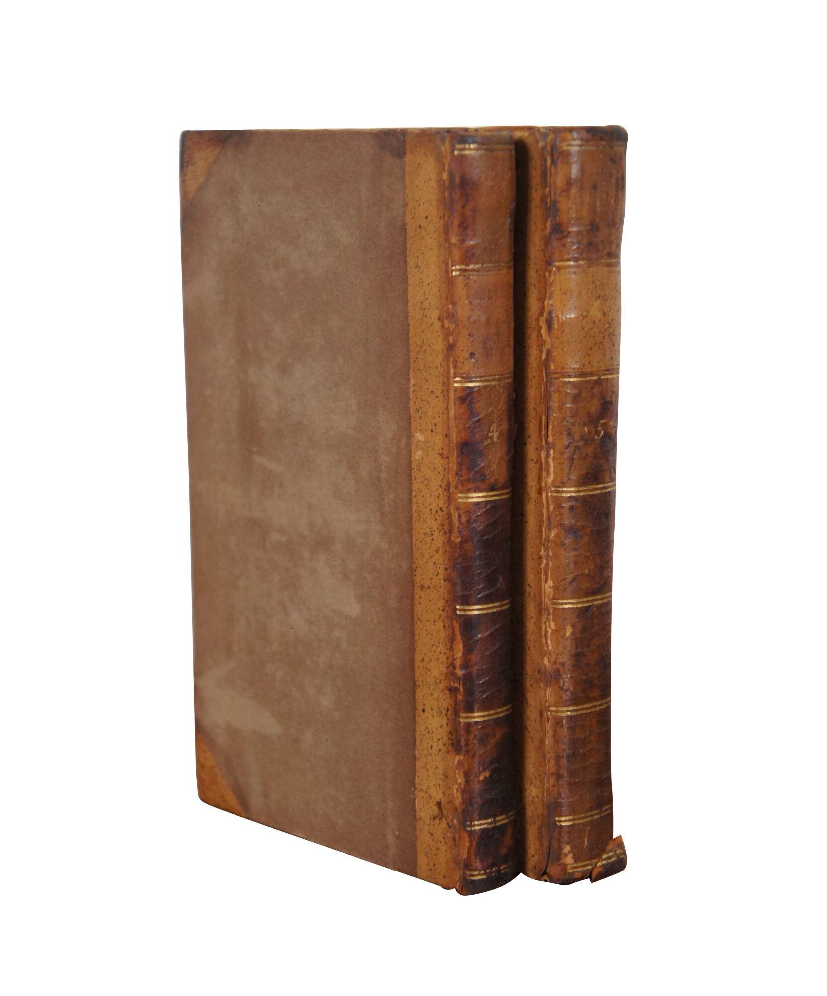 Pair of early 19th century French language hard cover books with paper boards and leather spines.