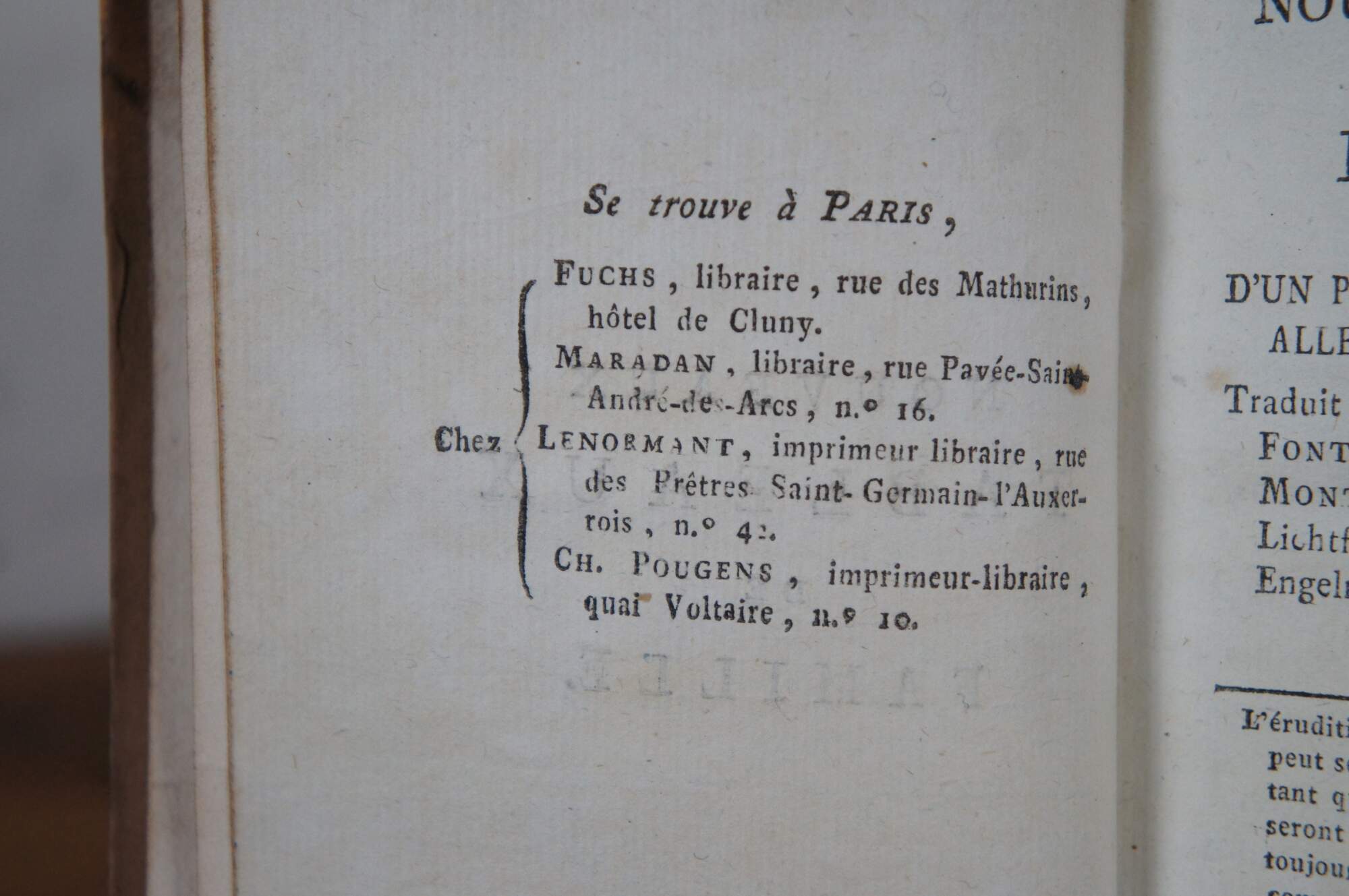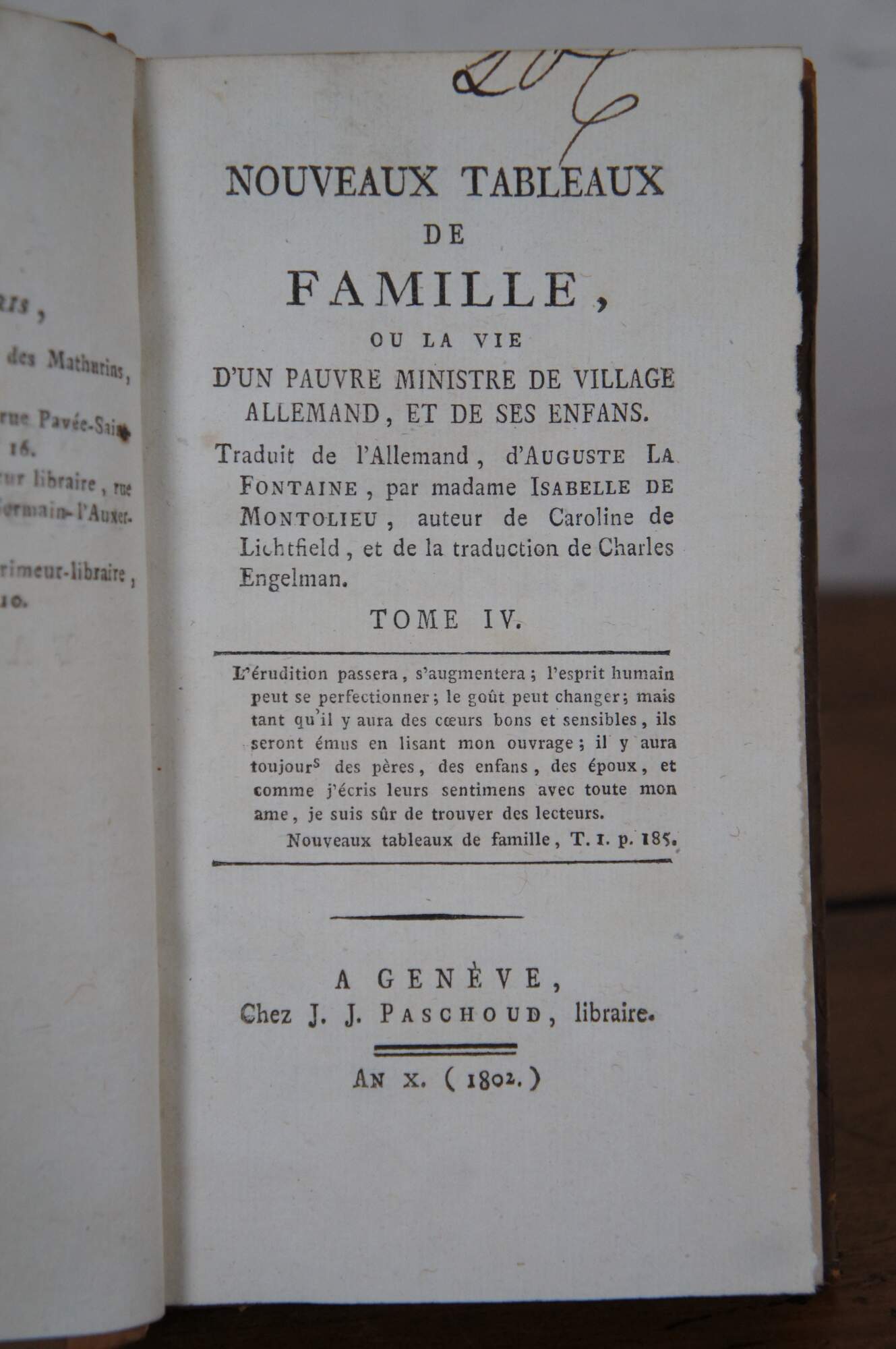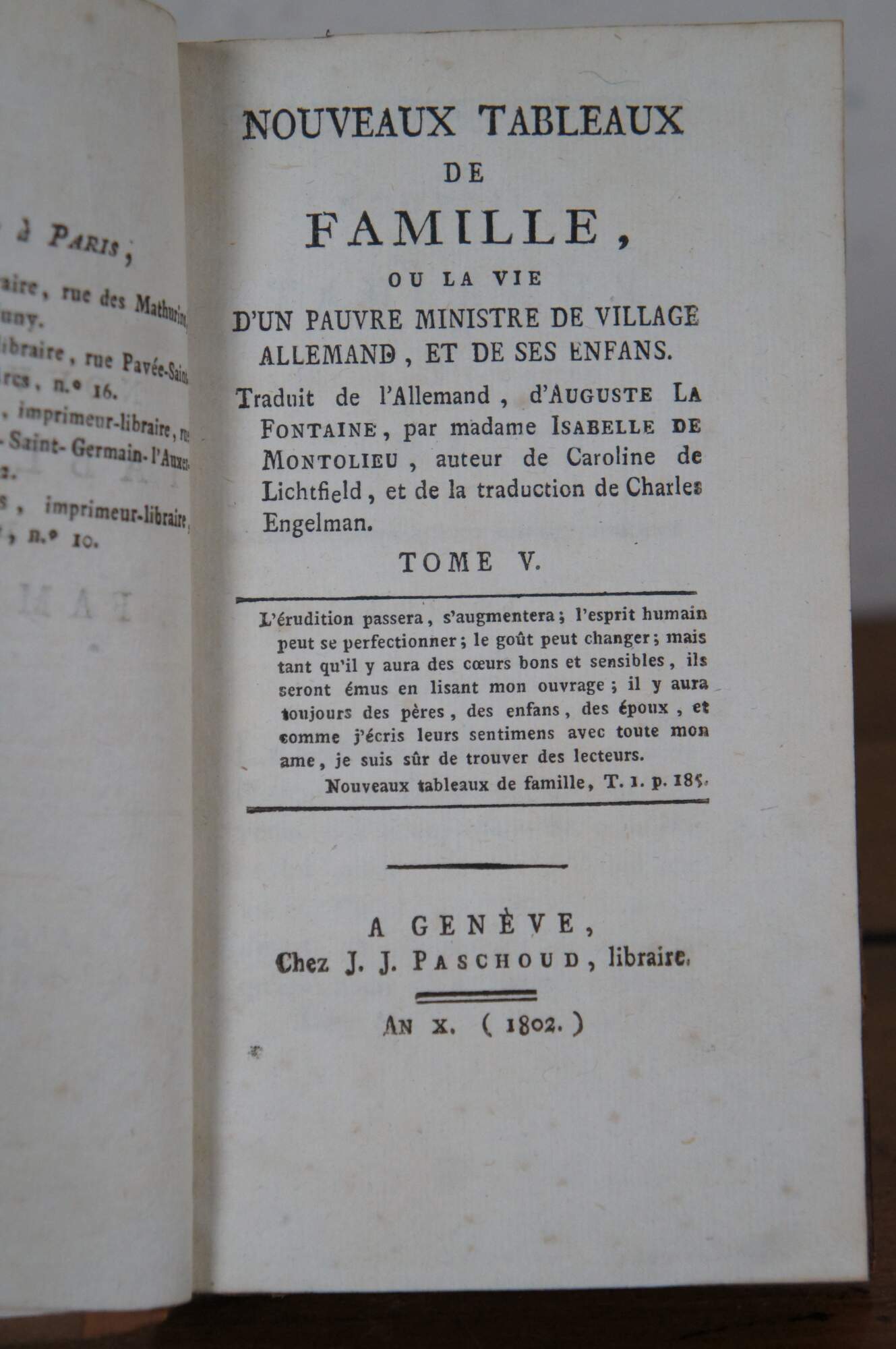 - 1802 - Nouveaux Tableaux de Famille, ou la vie d'un Pauvre Ministre de Village Allemand, et de ses Enfans. (New Family Pictures, or the Life of a Poor German Village Minister and his Children.) - Traduit de l'Allemand, d'Auguste la Fontaine, par Madame Isabelle de Montolieu, auteur de Caroline de Lichtfield, et de la traduction de Charles Engelman. (Translated from the German, by Auguste la Fontaine, by Madame Isabelle de Montolieu, author of Caroline de Lichtfield, and the translation by Charles Engelman) - Tome IV & V (Volume IV and V) - a Geneve, Chez J.J. Paschoud, Libraire (J.J. Paschoud, Bookseller)